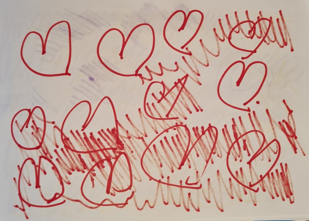 At the beginning of the Art Group and since March 2022, “M” sometimes preferred writing instead of drawing or painting. “M,” wrote words, numbers, sometimes signatures or short sentences. It depended on what we were talking about in the group. However, “M” came to the session with different moods from time to time. Sometimes with a crying spirit when “M” wrote, “I am stupid”. Then some service users encouraged “M” to write “I am clever” and “I am beautiful”. I believe the moods also influenced the colours because it was “M’s” choice to pick colours to work with. “M” came to the session in good spirits, and then there was sometimes a burst into uncontrollable laughter.