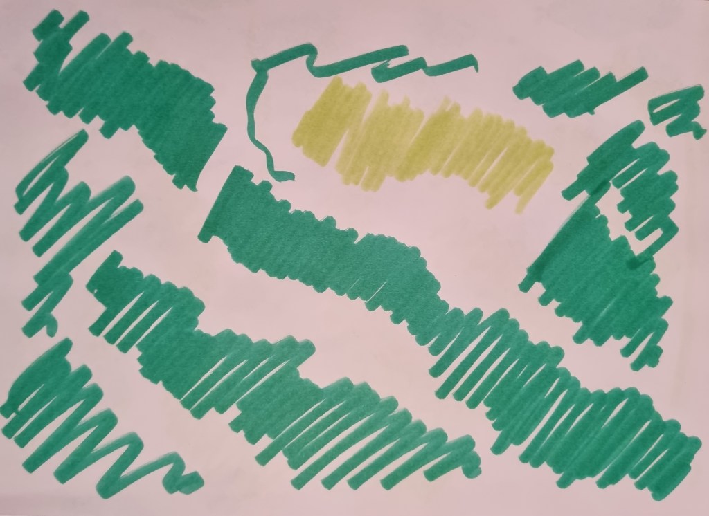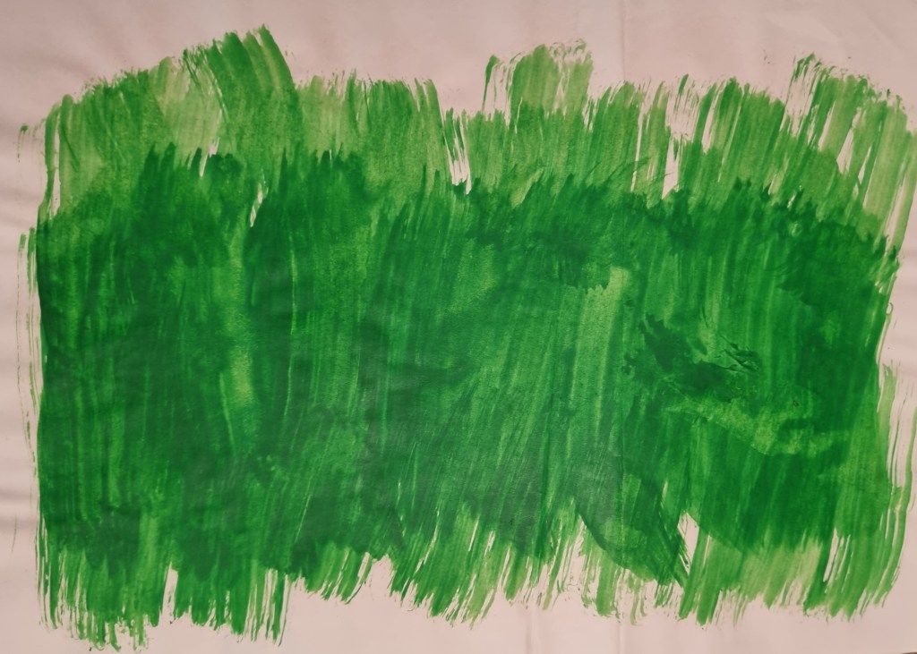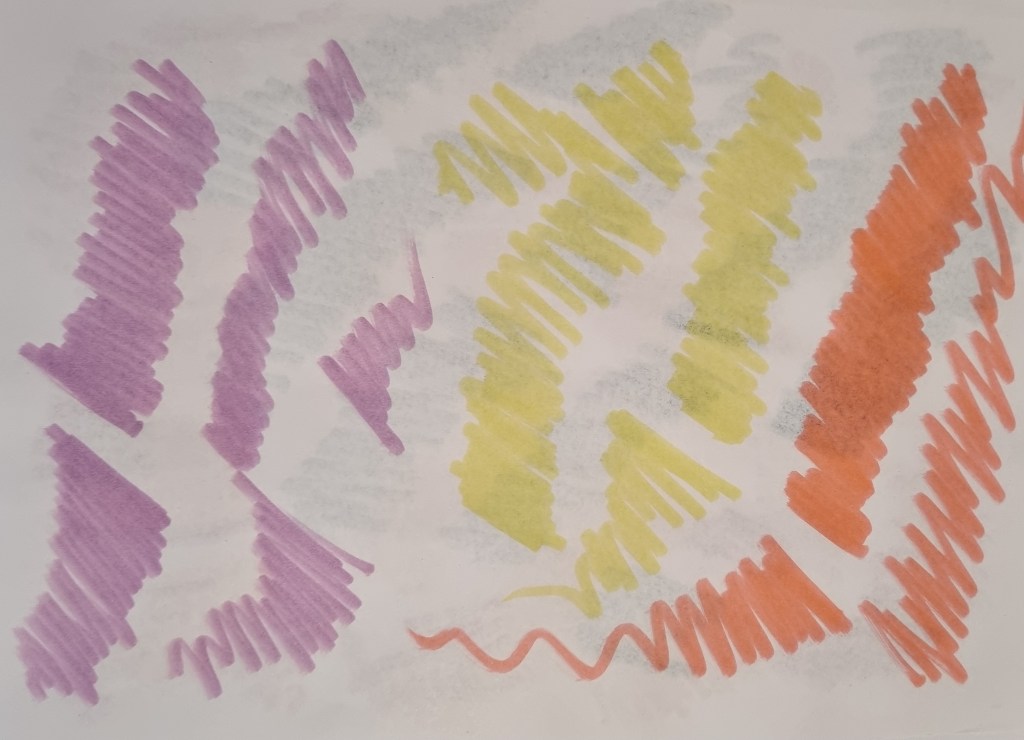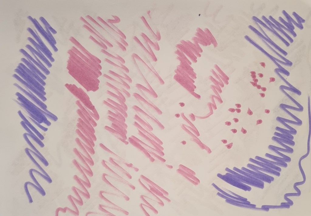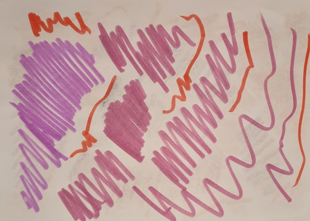 “M” did not feel discouraged by using acrylic paint for a change. However, I wanted to know what pattern or method “M” would choose, considering that drawing markers are thin and paint covers more surface of the paper. “M” realised that it would be tricky to paint on the reverse side because she would have to wait for the paint to dry. Therefore, “M” decided to paint only one side because of the waiting time. What is also interesting is that “M” changed the direction marks while using the paint.