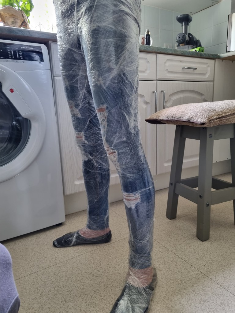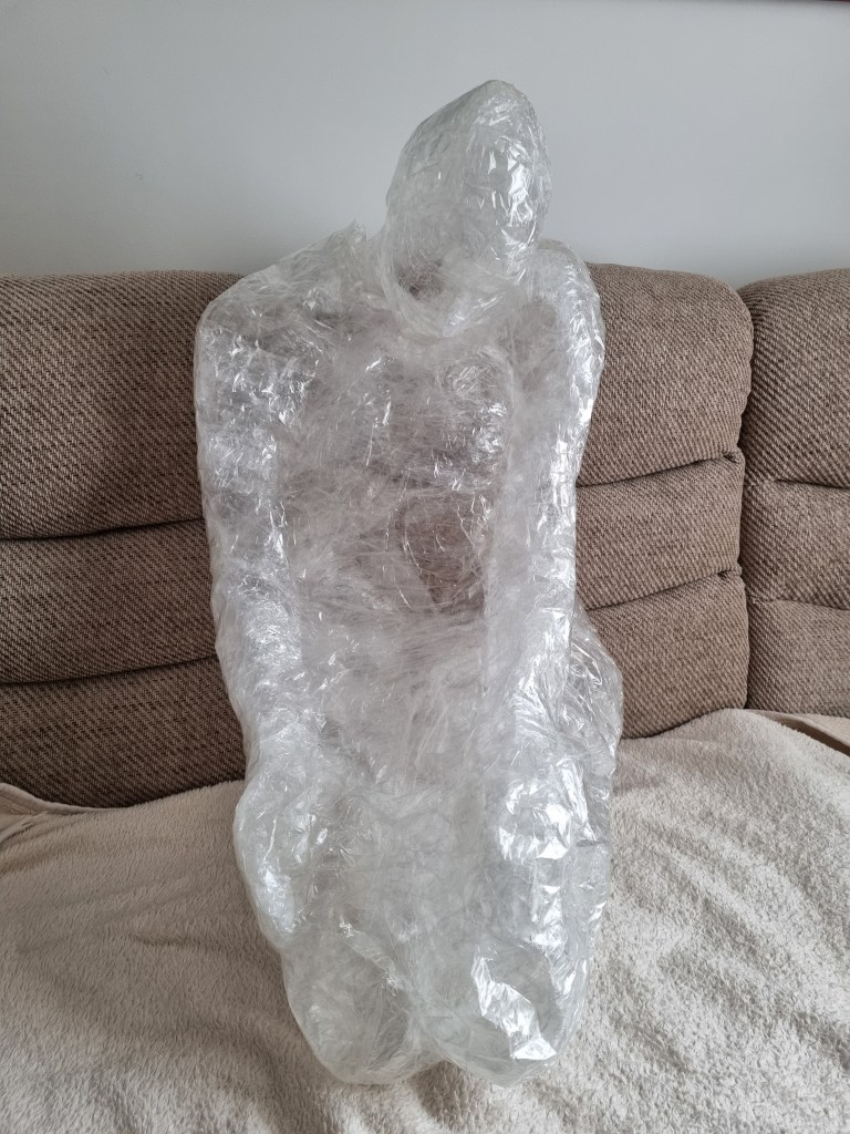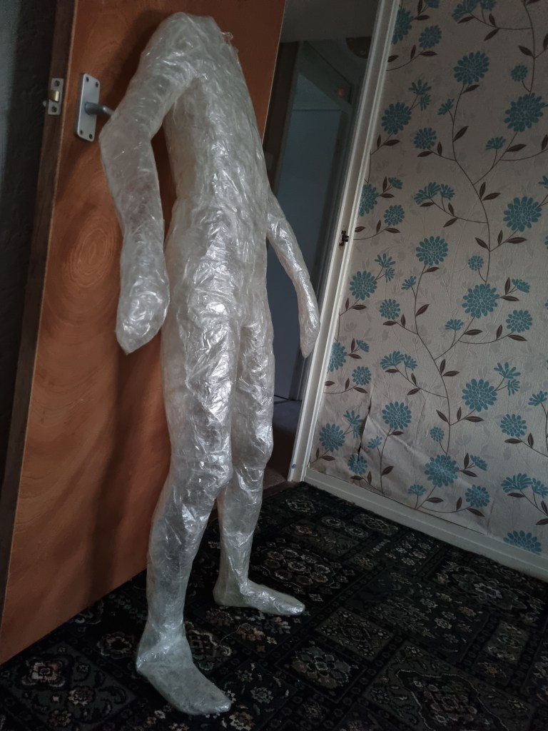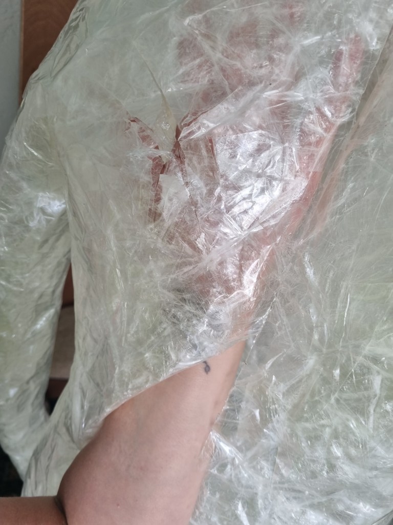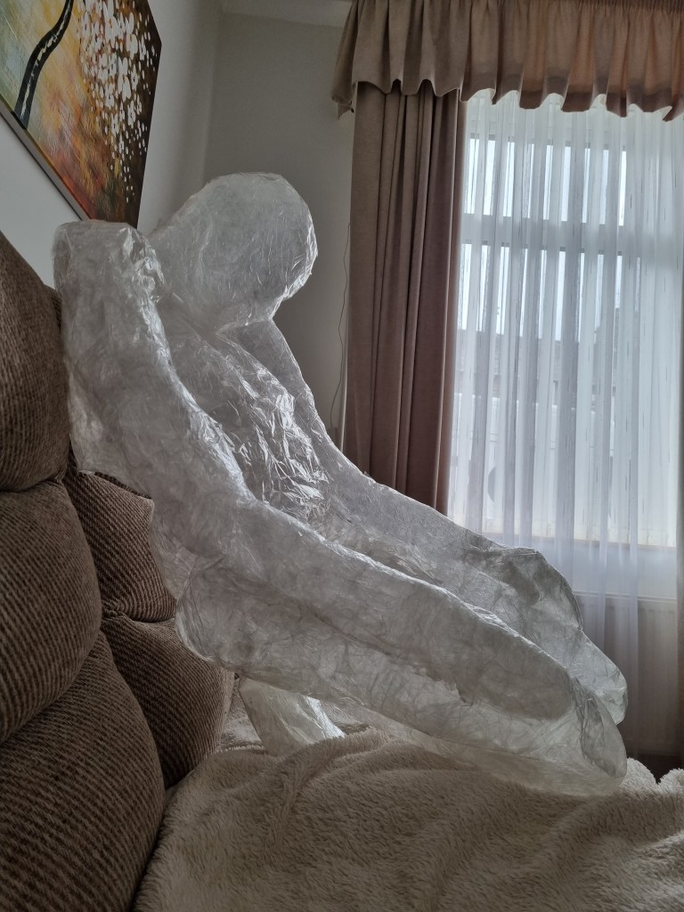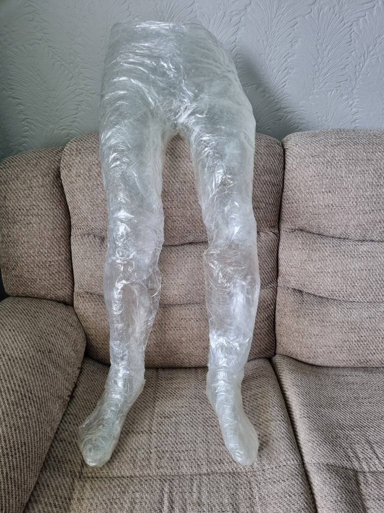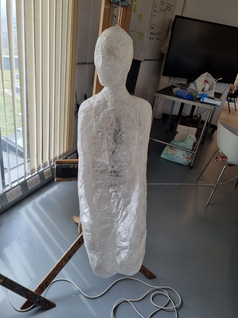 The methodology of the standing pose started the same as the previous work. I used clingfilm, sellotape, scissors or a Stanley knife, and the model.
