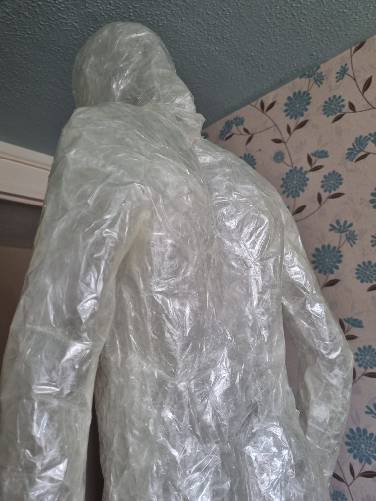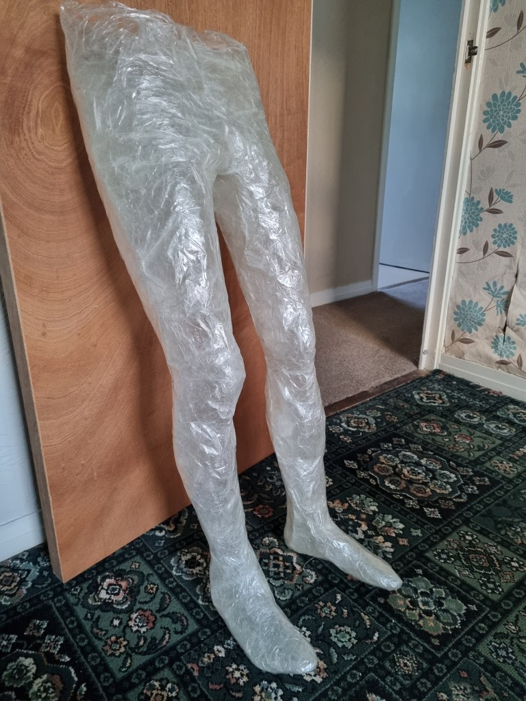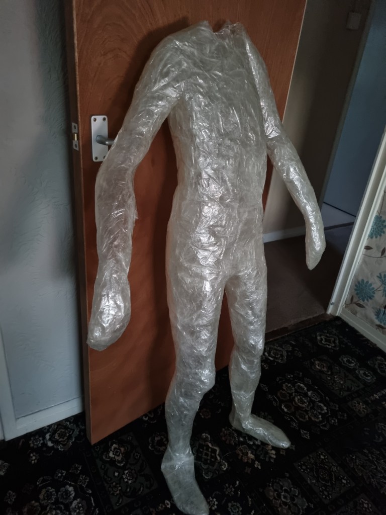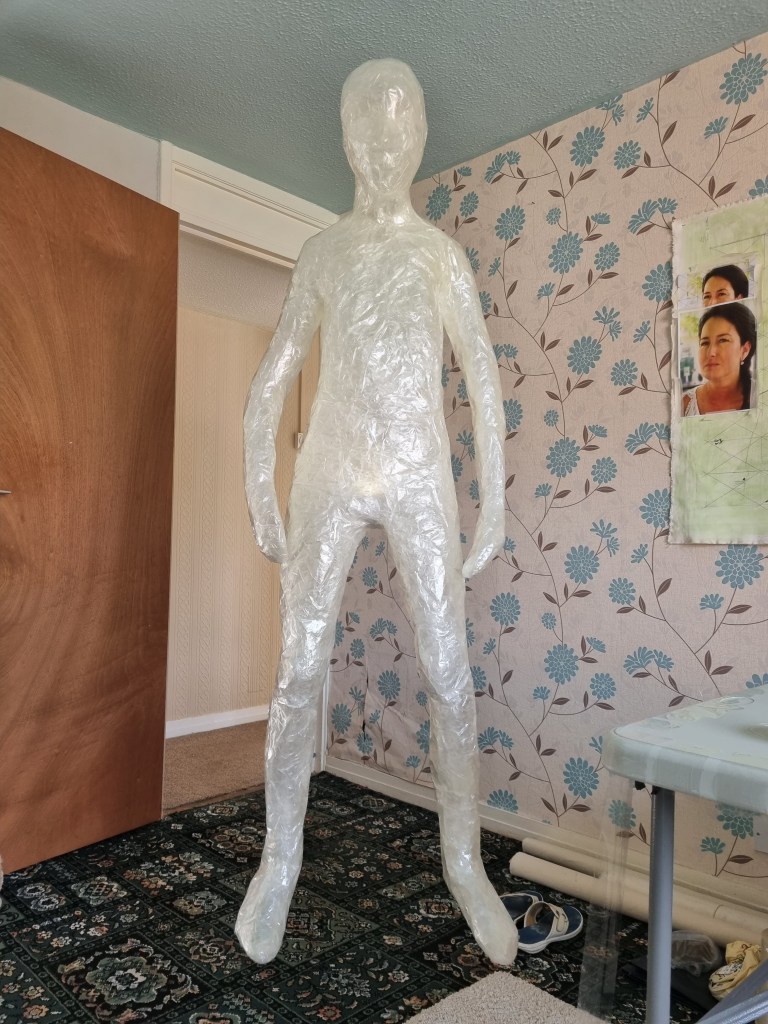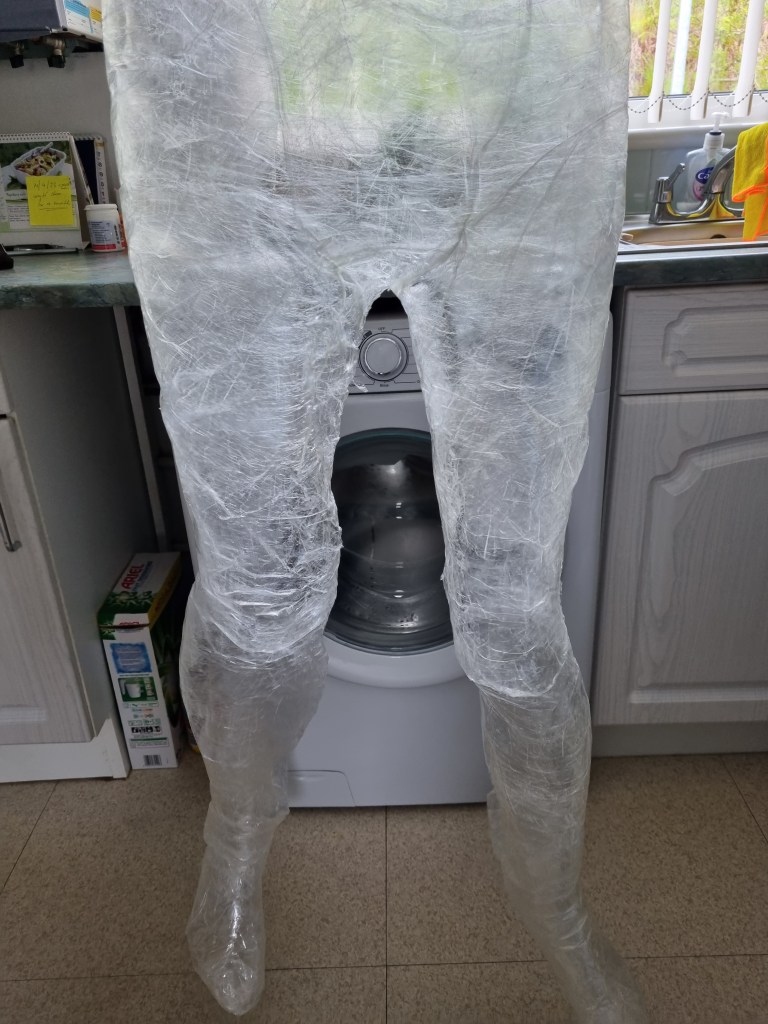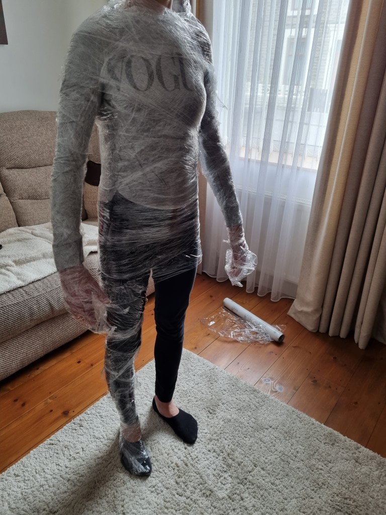 The methodology of the standing pose started the same as the previous work. I used clingfilm, sellotape, scissors or a Stanley knife, and the model.