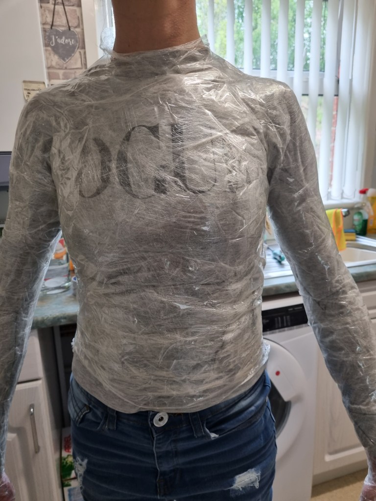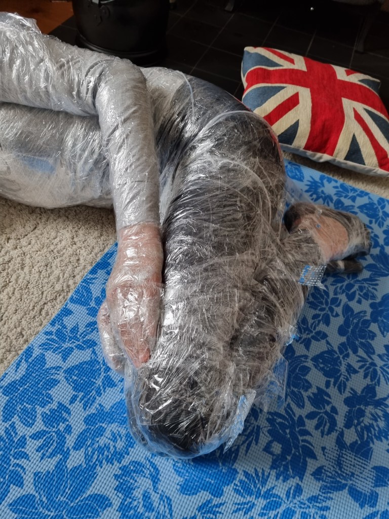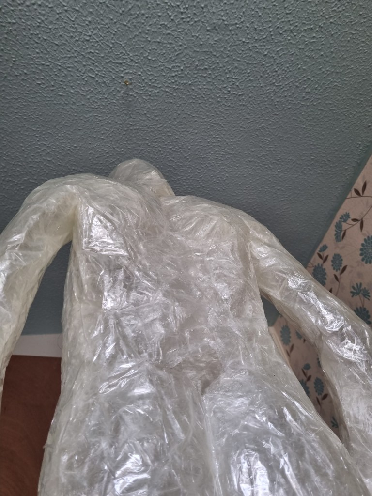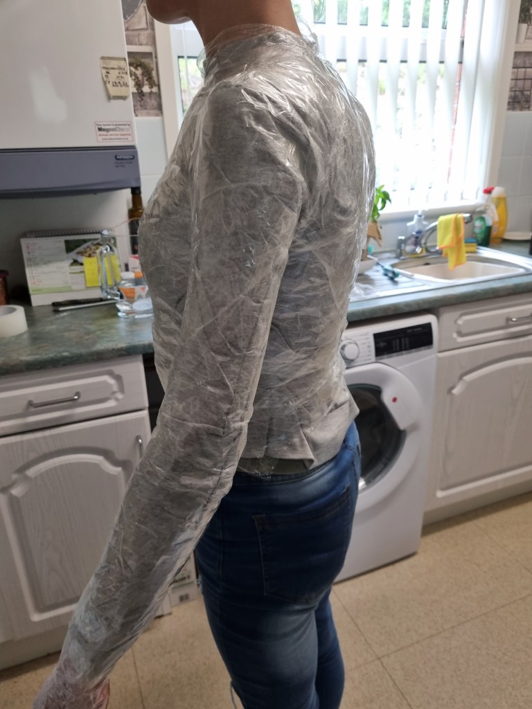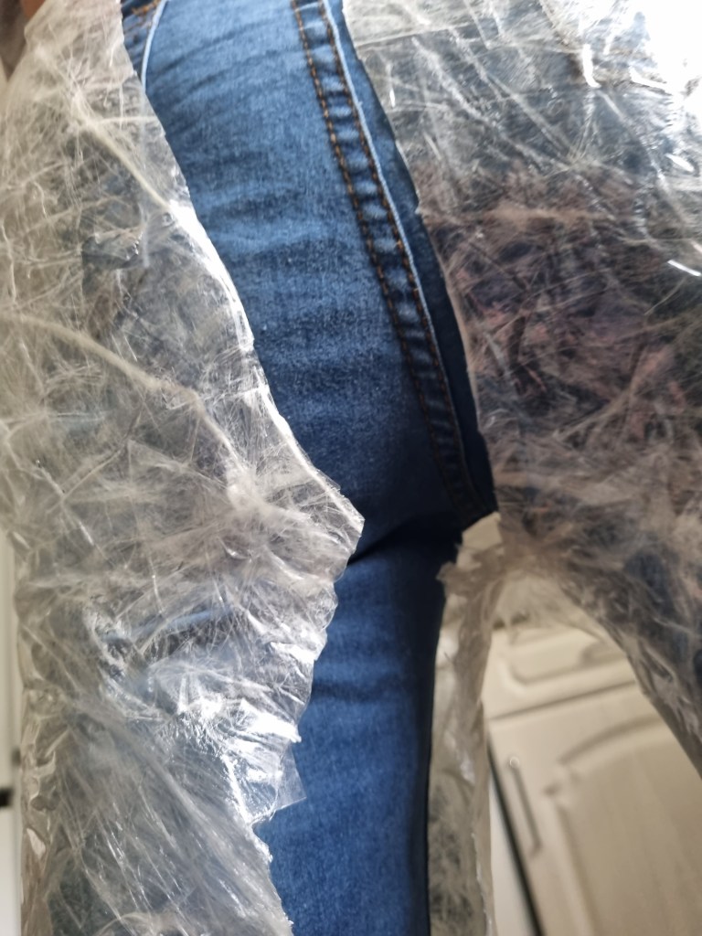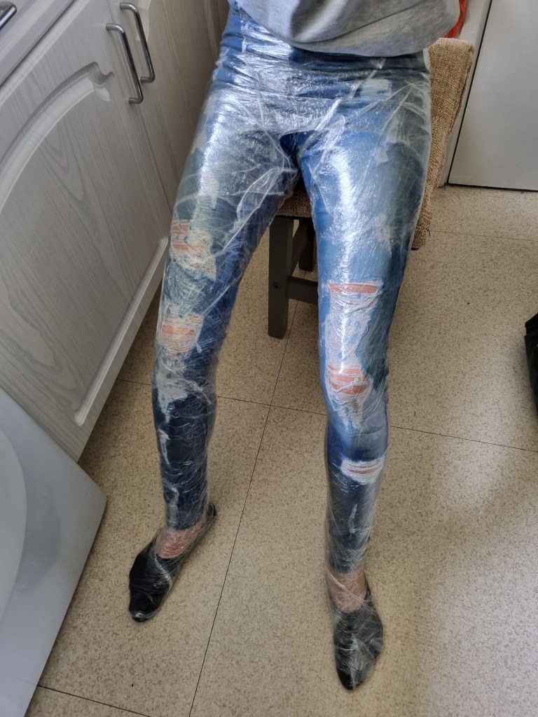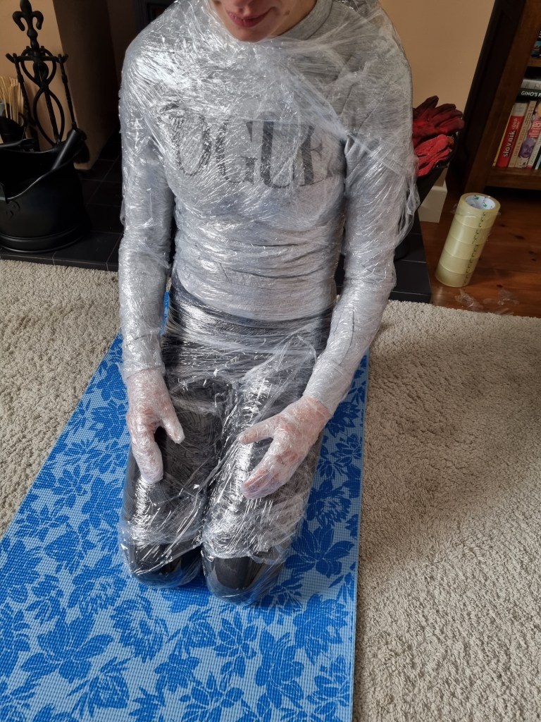 The methodology of the standing pose started the same as the previous work. I used clingfilm, sellotape, scissors or a Stanley knife, and the model.