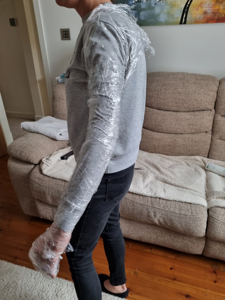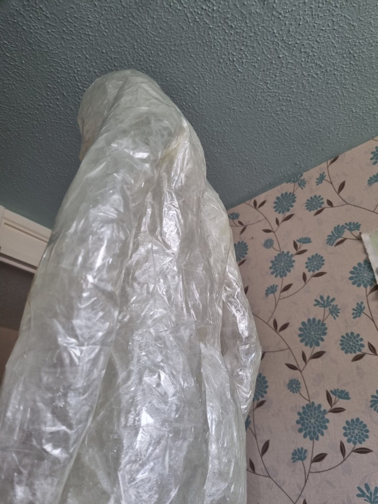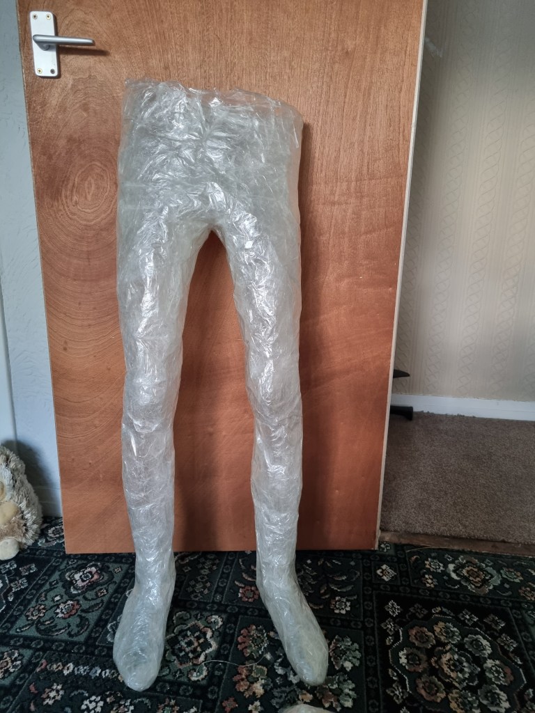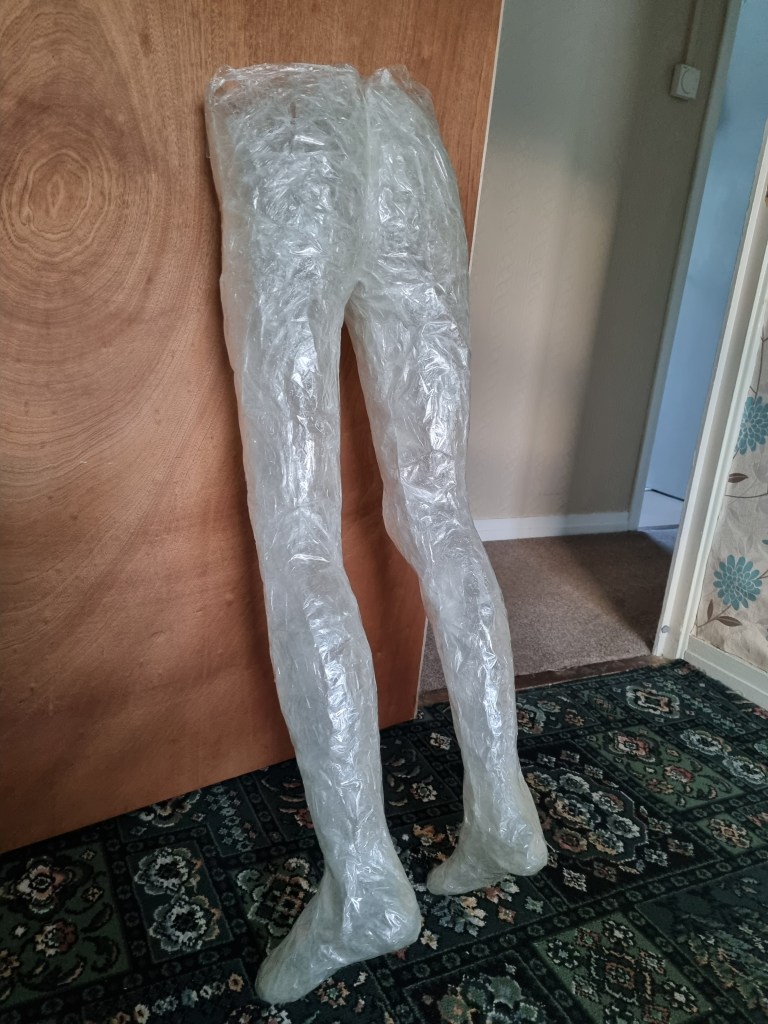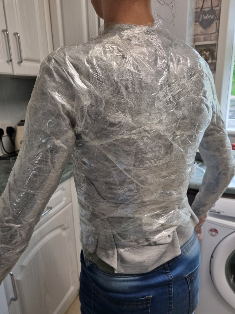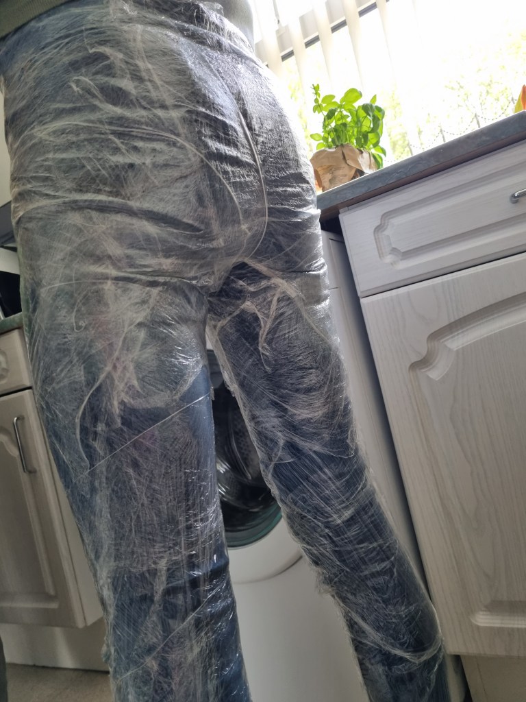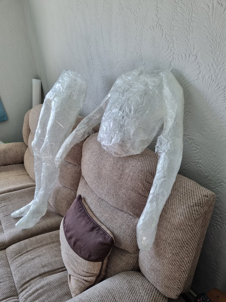 The methodology of the standing pose started the same as the previous work. I used clingfilm, sellotape, scissors or a Stanley knife, and the model.