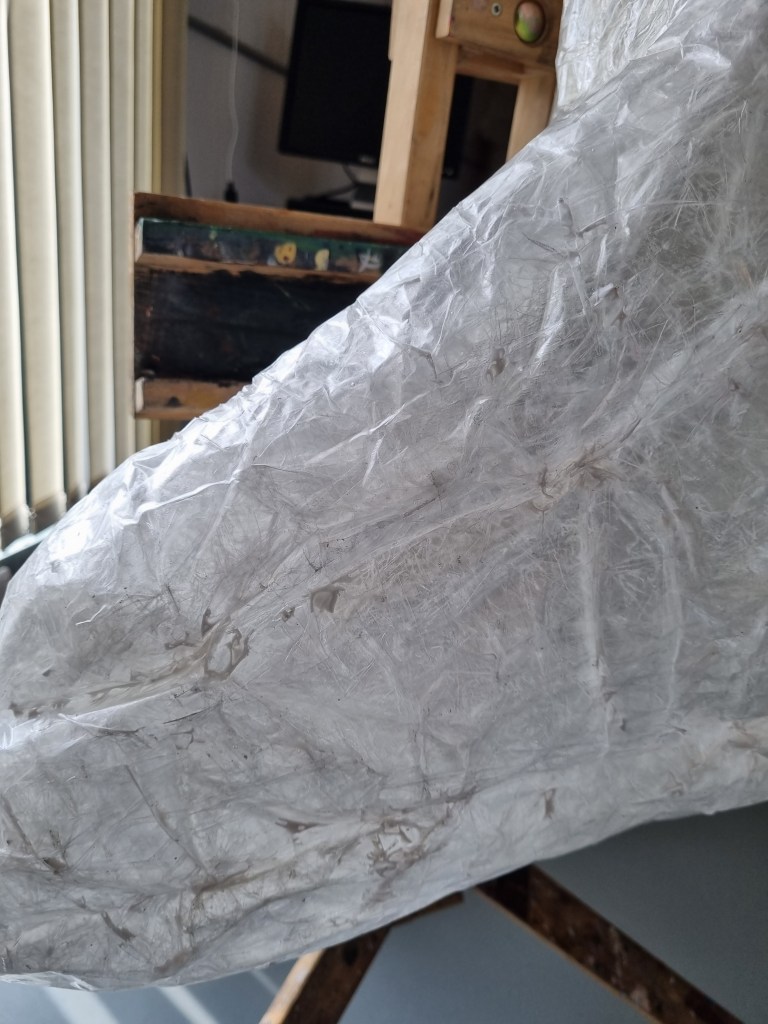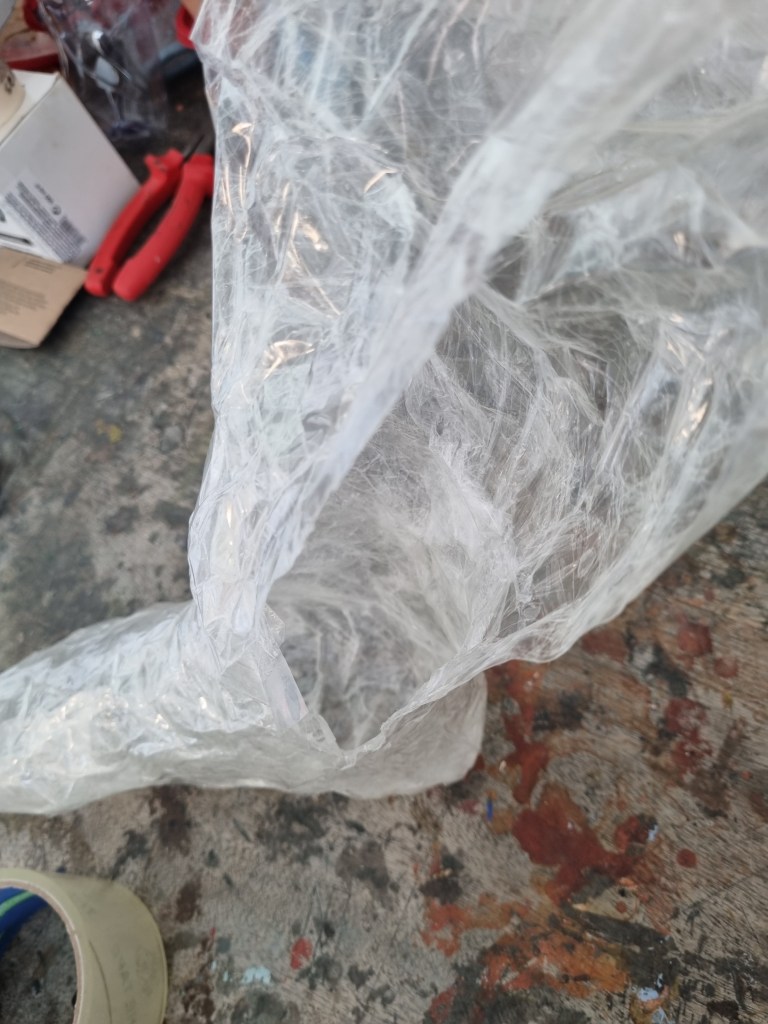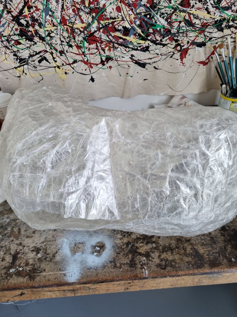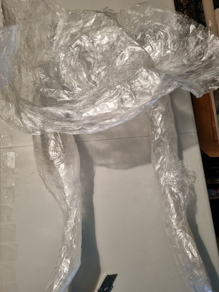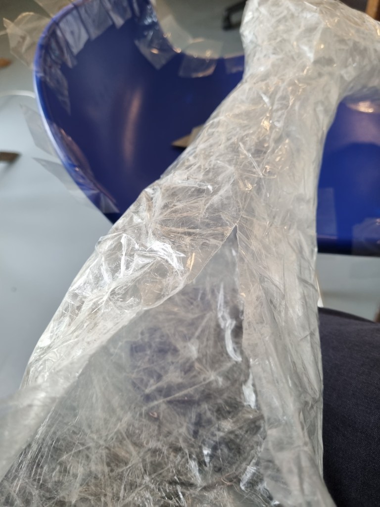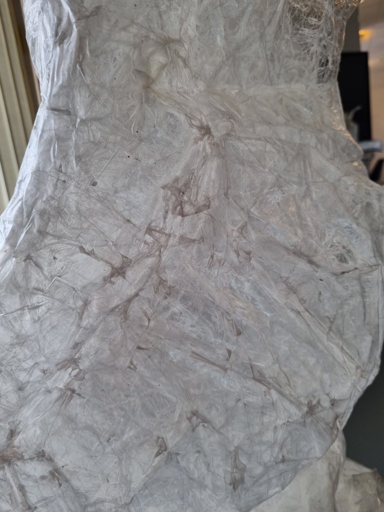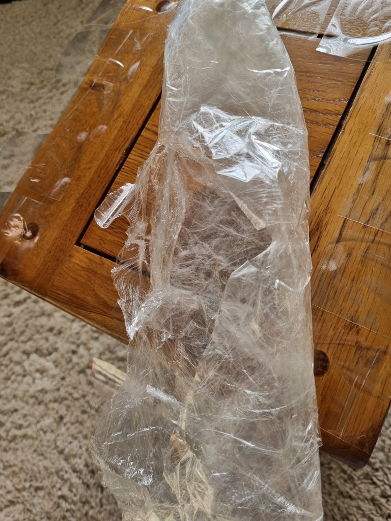 I removed the extra access of the clingfilm, and then I started to attach more sellotape to secure the shape. I used the sellotape that was donated to me specifically for this project which was helpful because I used a lot of sellotape for this sculpture.