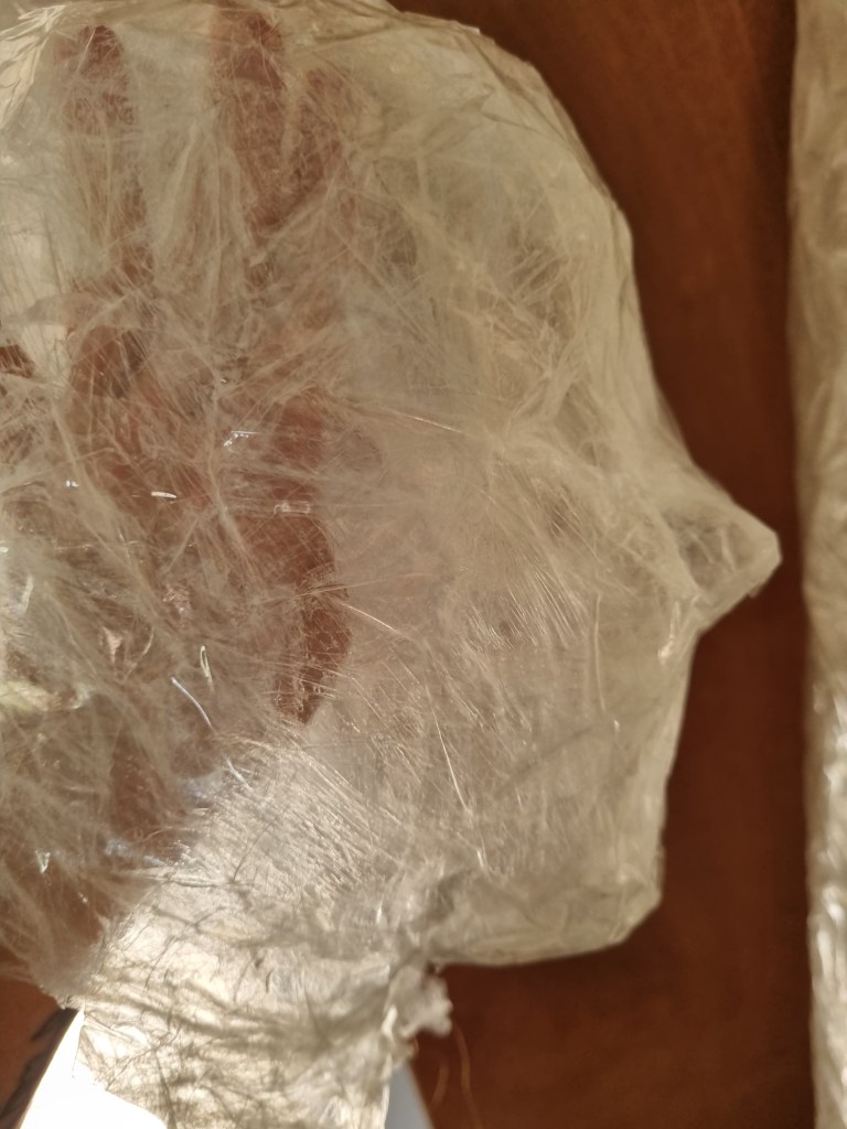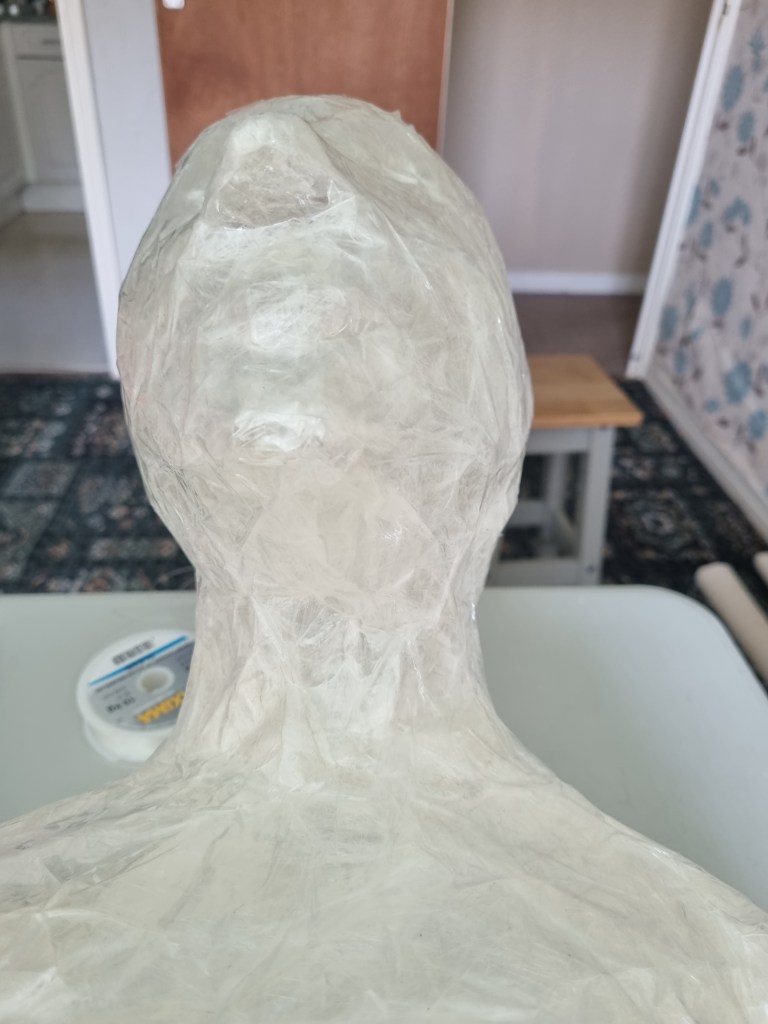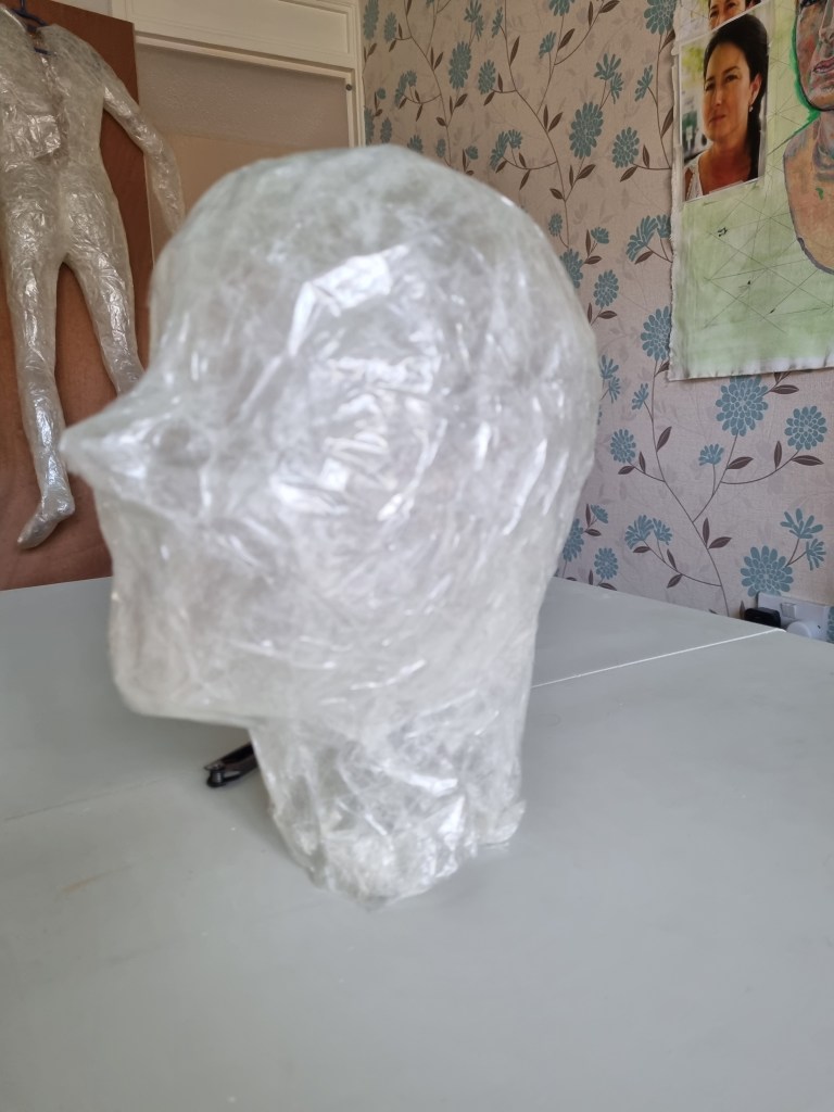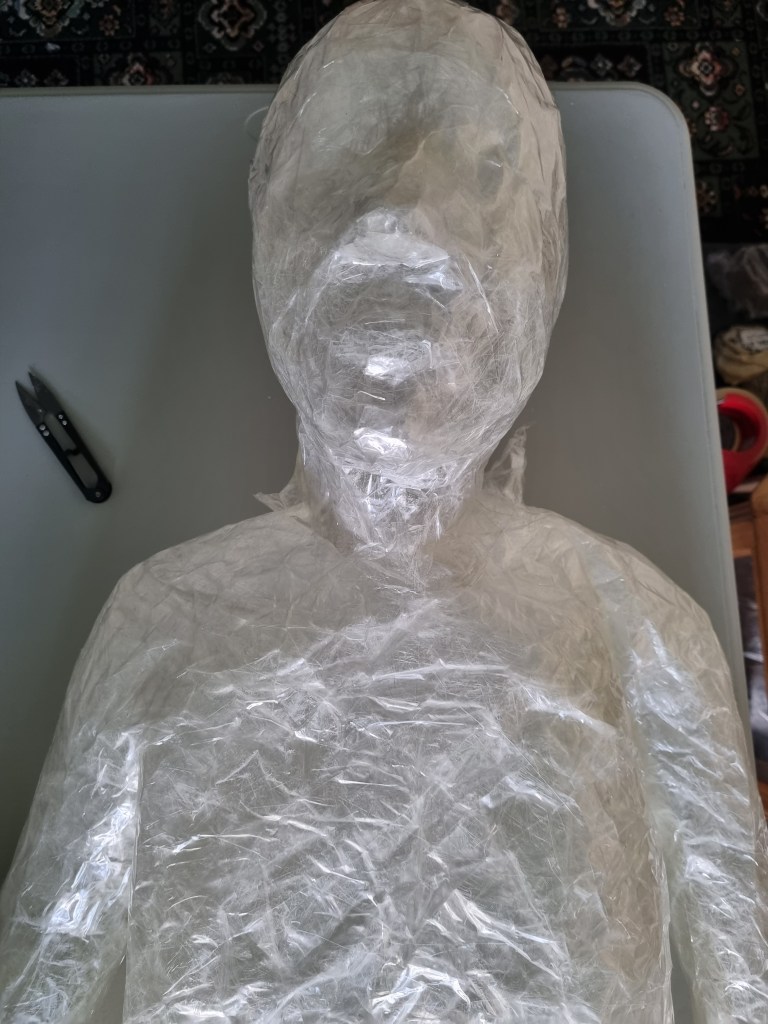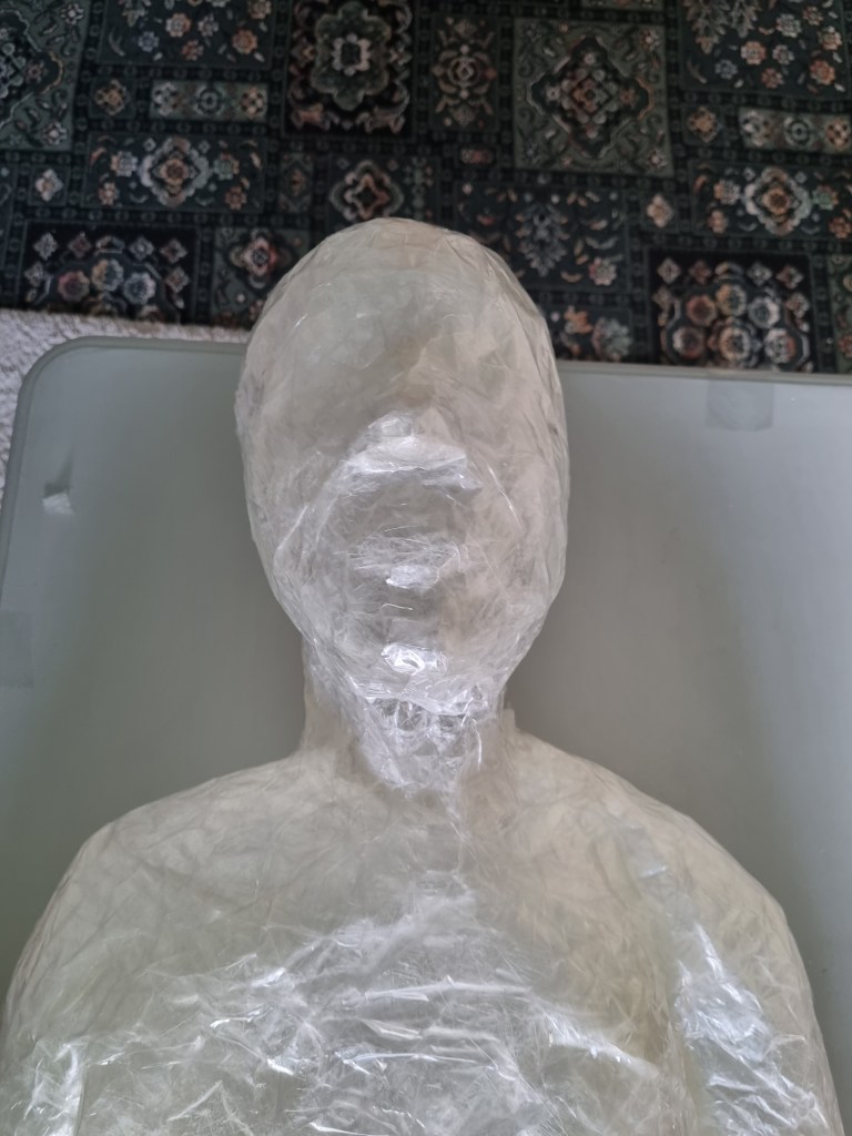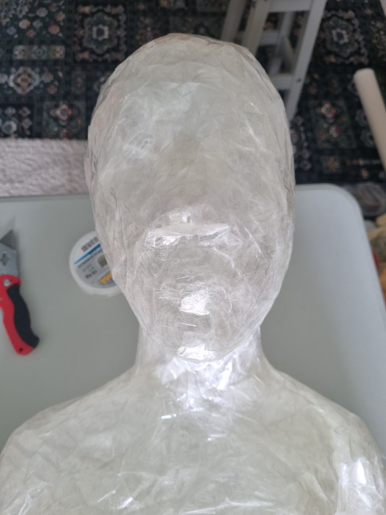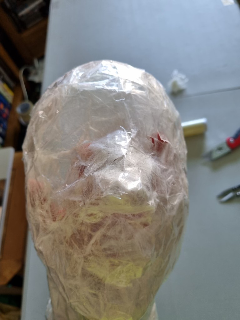 I started with the same methodology as with the body. First, I wrapped the head of the model with cling film and then applied the sealing tape. I remembered to extend the neck lower to the chest because of the attachment to the body.