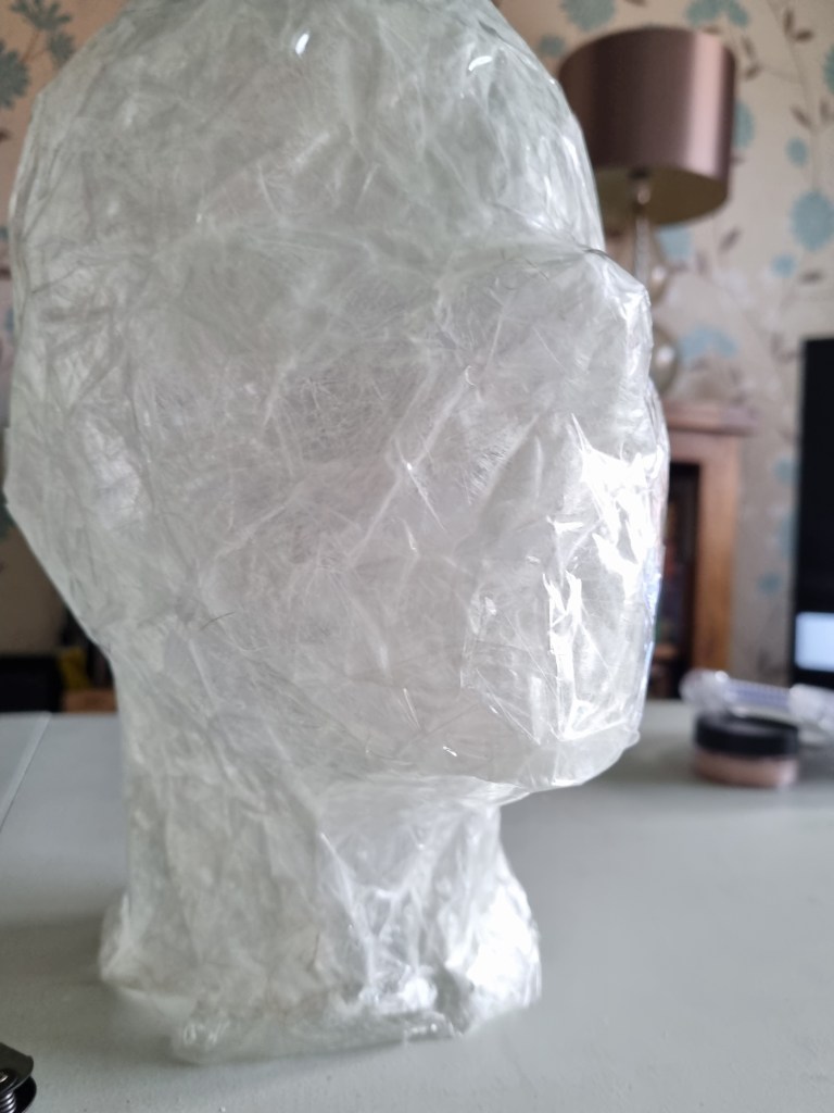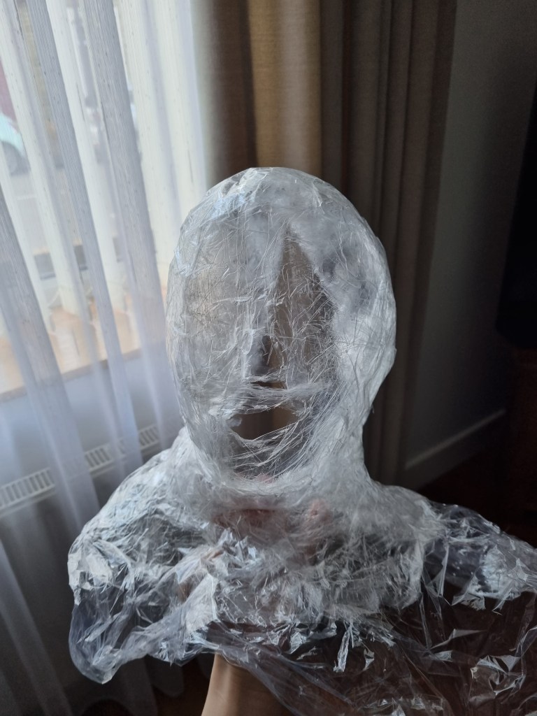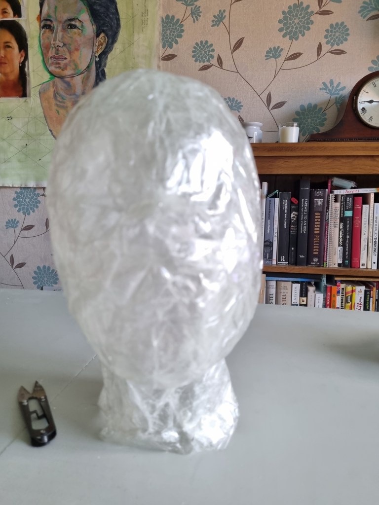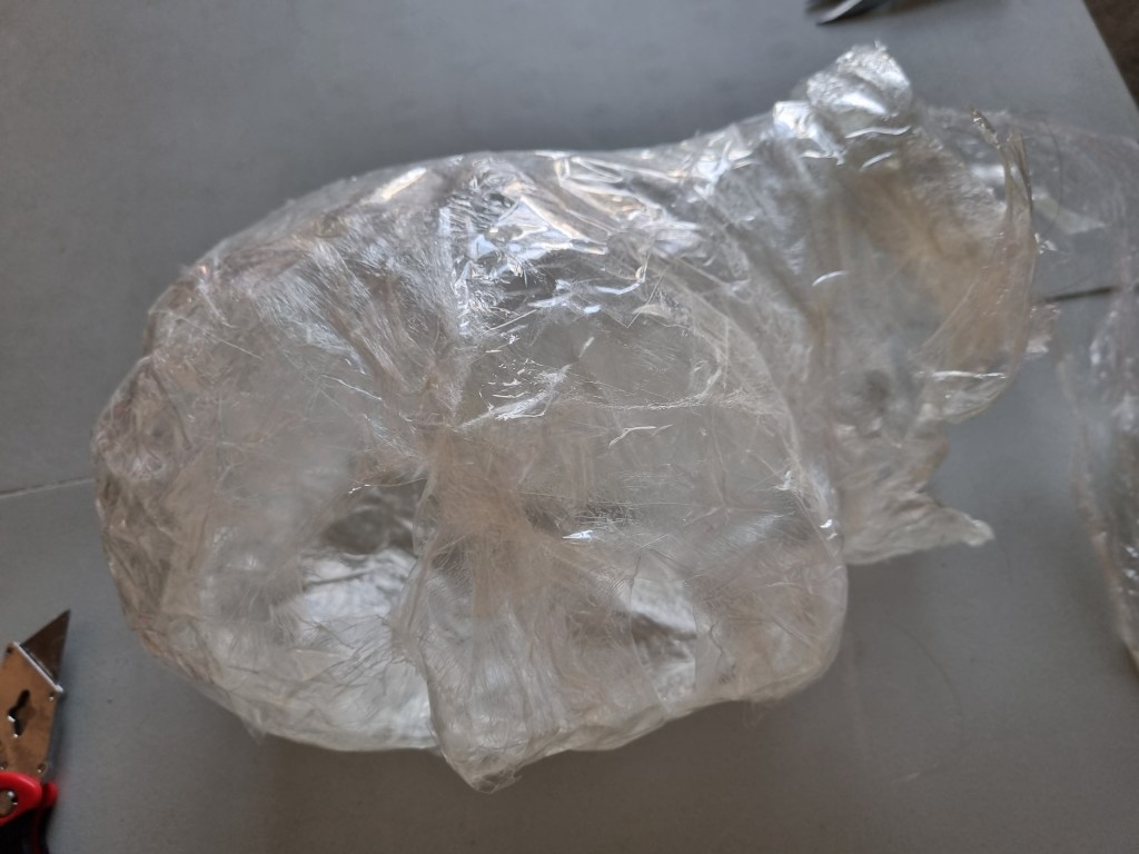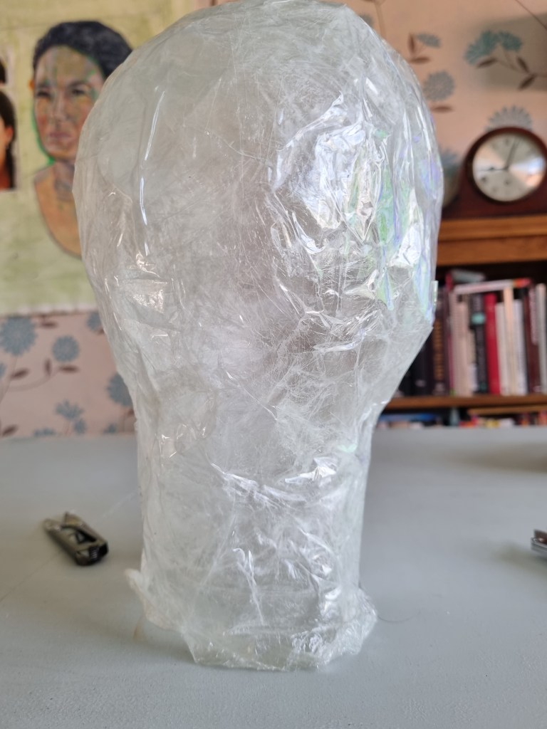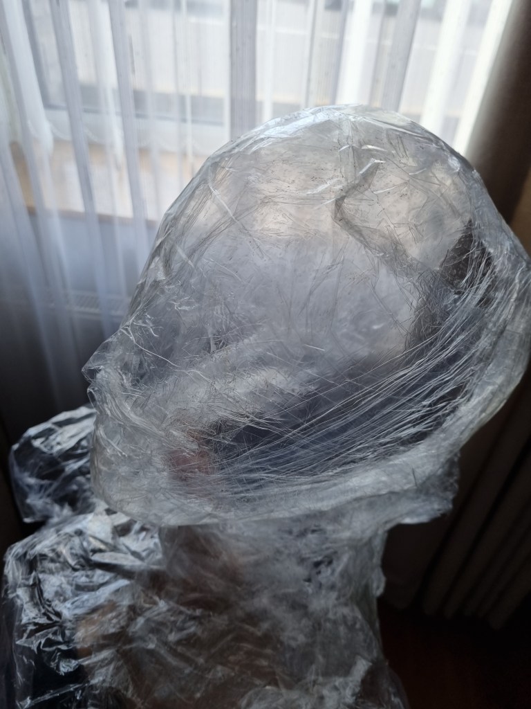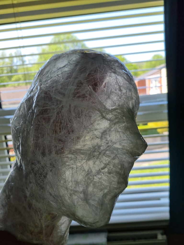 I started with the same methodology as with the body. First, I wrapped the head of the model with cling film and then applied the sealing tape. I remembered to extend the neck lower to the chest because of the attachment to the body.