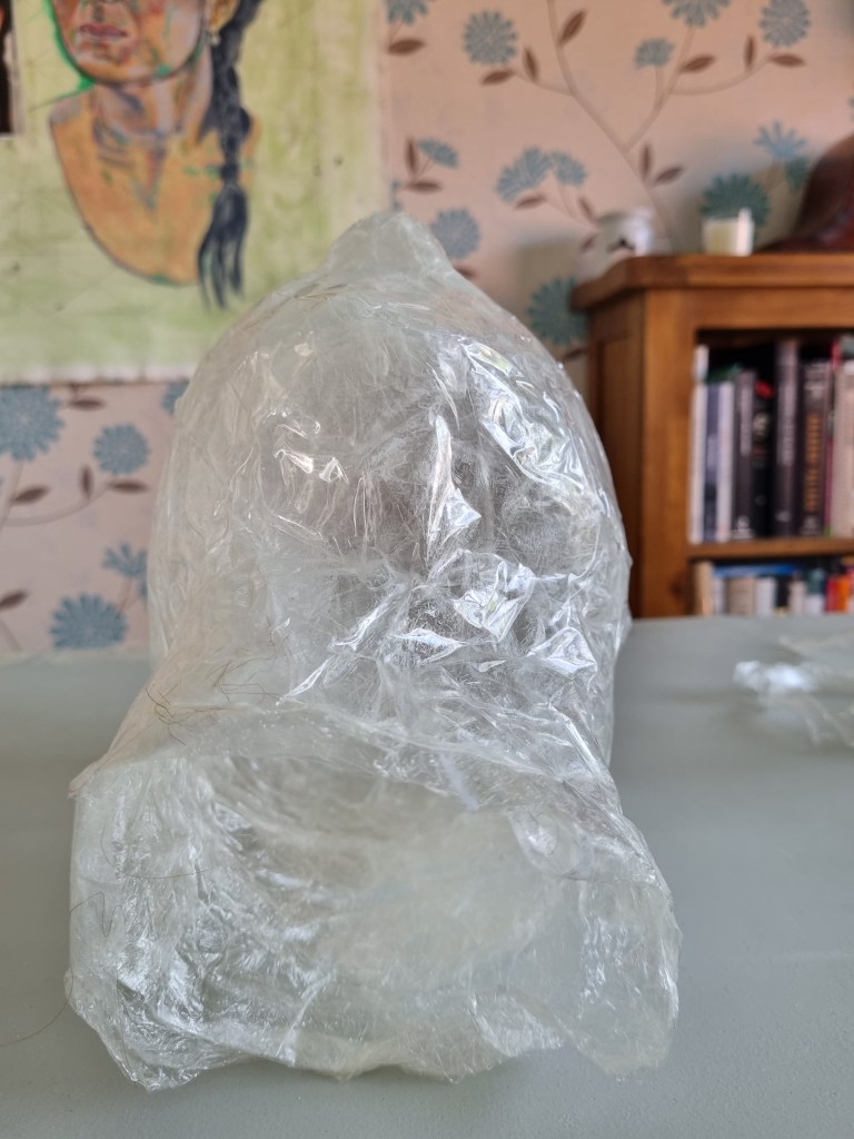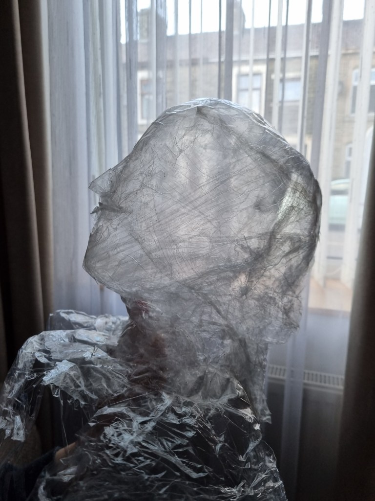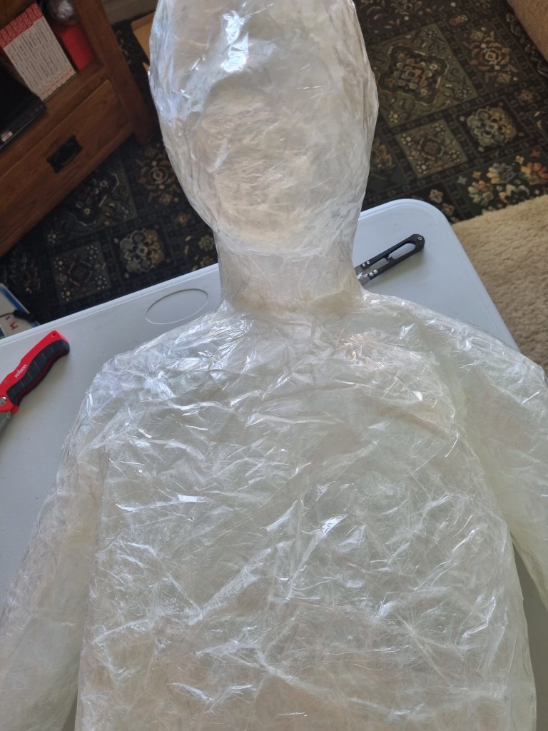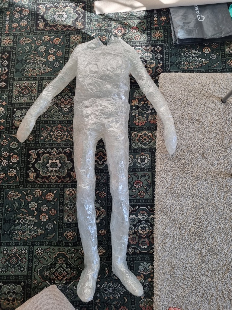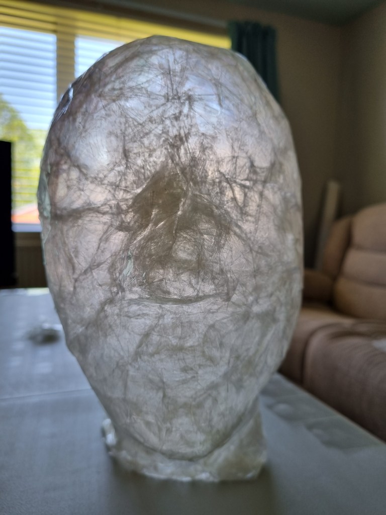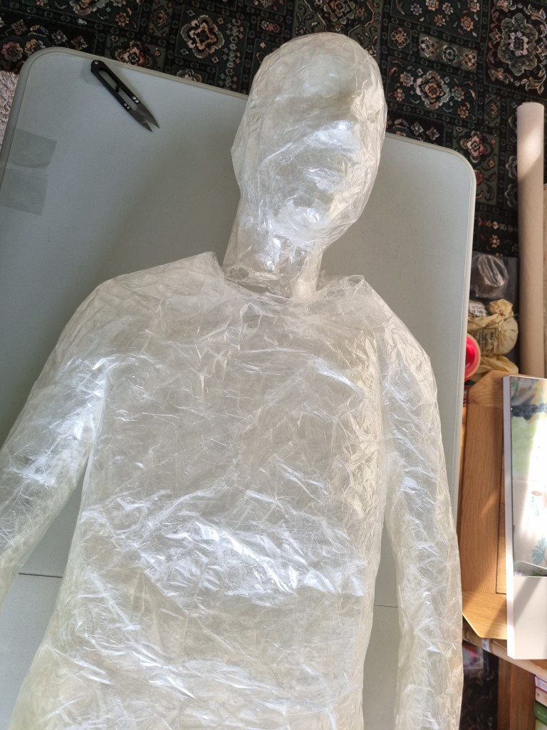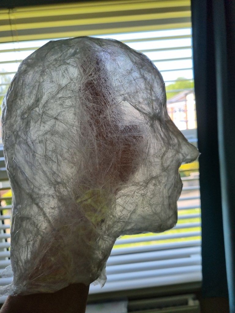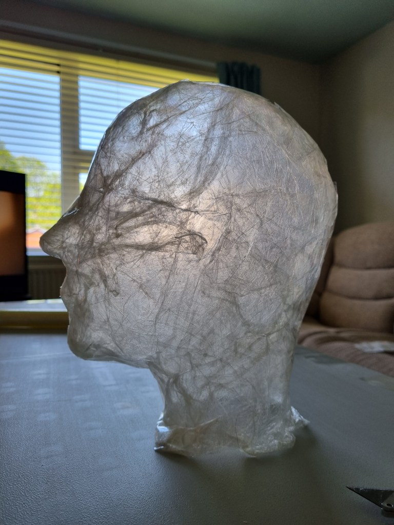 I started with the same methodology as with the body. First, I wrapped the head of the model with cling film and then applied the sealing tape. I remembered to extend the neck lower to the chest because of the attachment to the body.