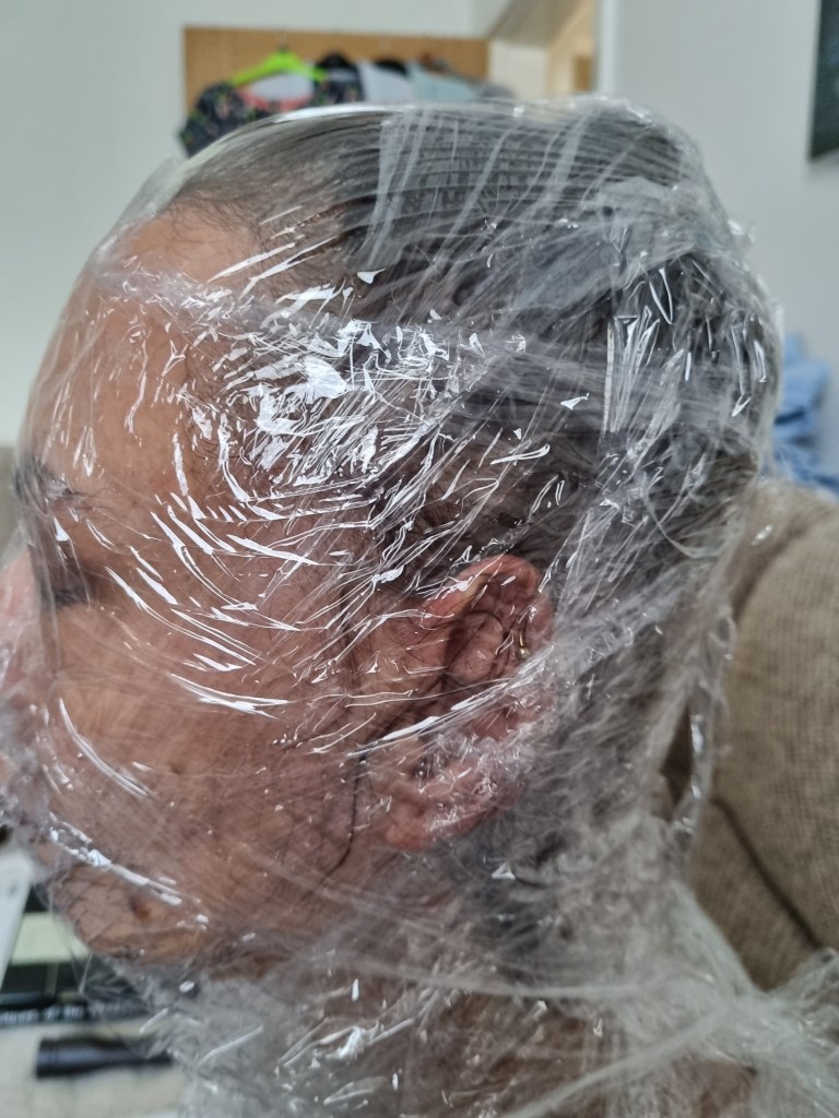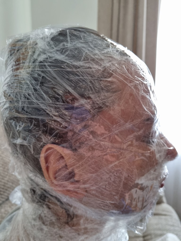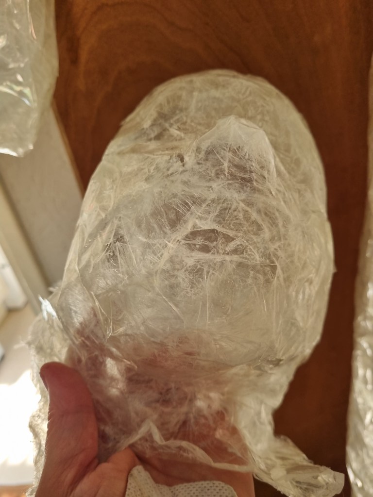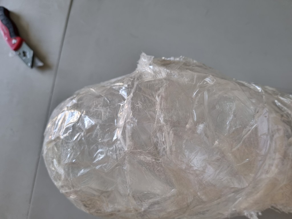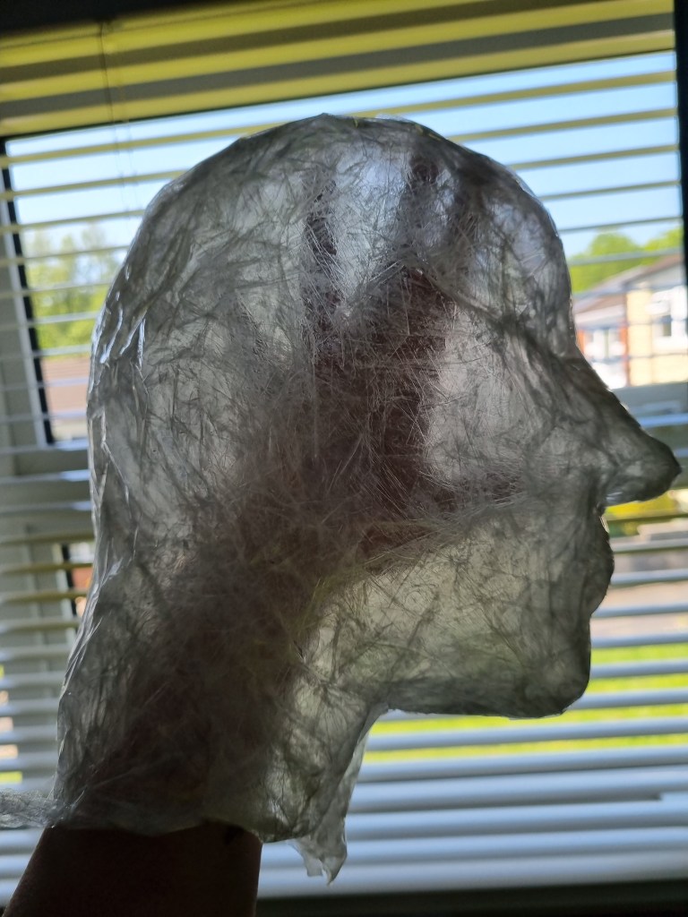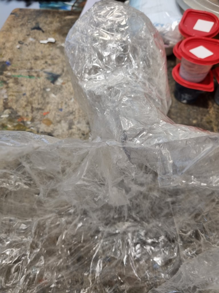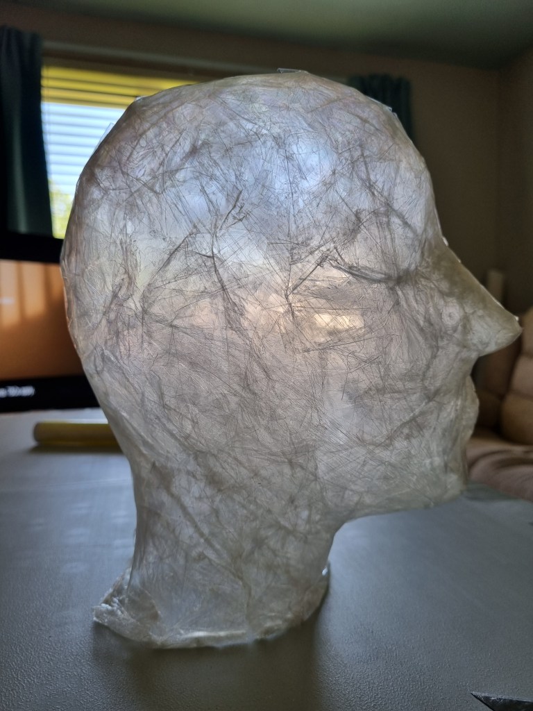 I started with the same methodology as with the body. First, I wrapped the head of the model with cling film and then applied the sealing tape. I remembered to extend the neck lower to the chest because of the attachment to the body.