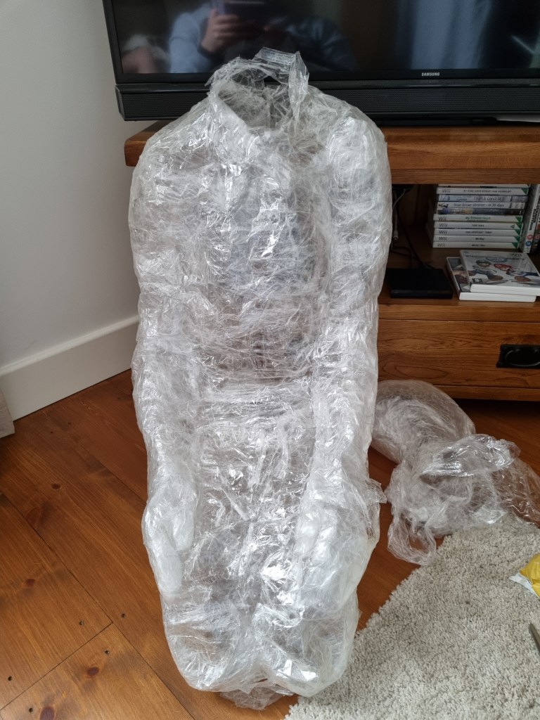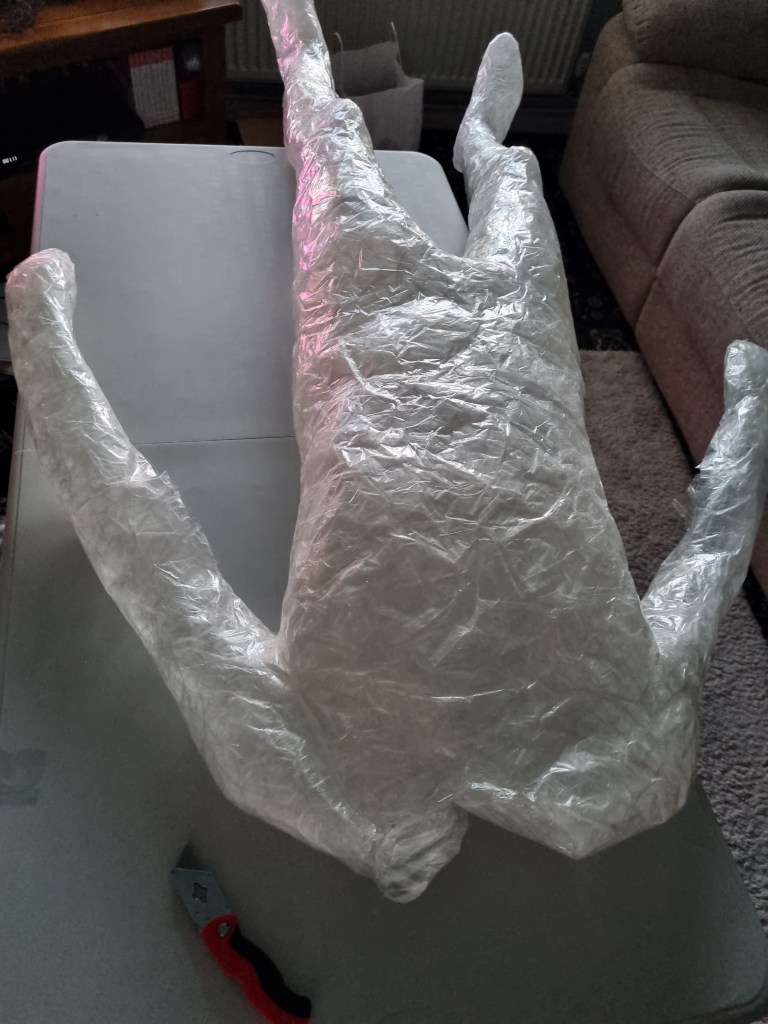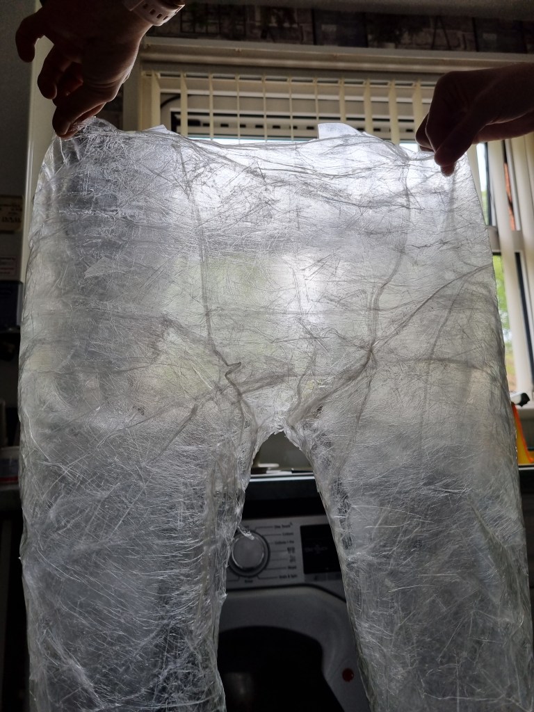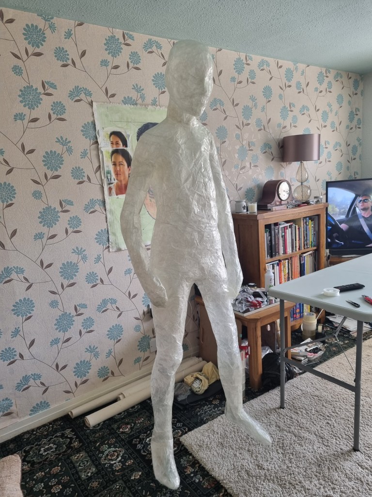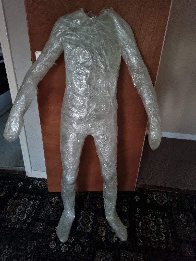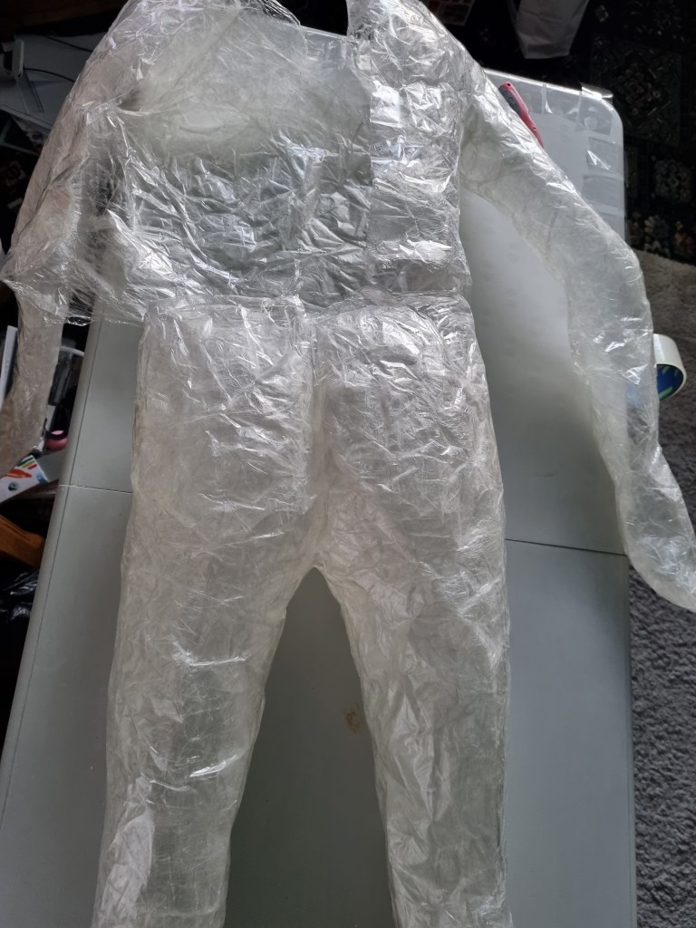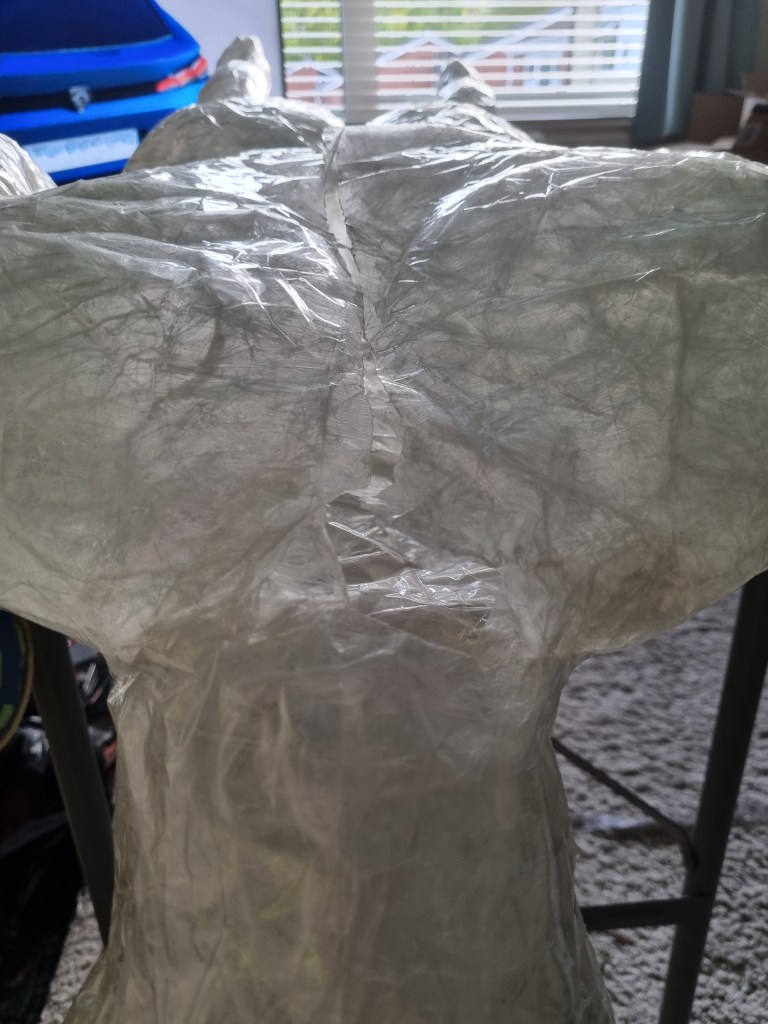 I started to layer the sealing tape to form the body’s shape. I supported vulnerable parts from inside and outside. I had some shape at this stage of the process. However, it needed more layers to apply, not just for the condition but also to get the proportions right.