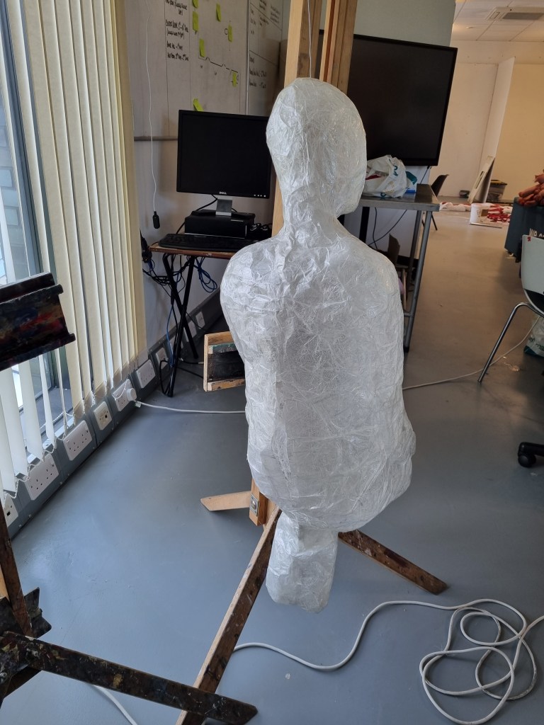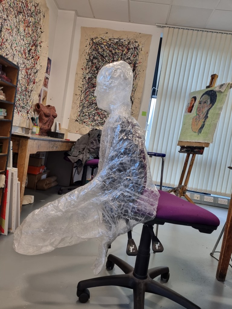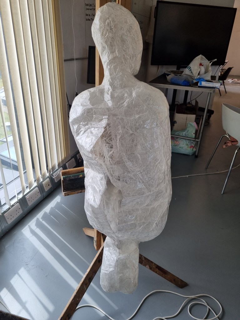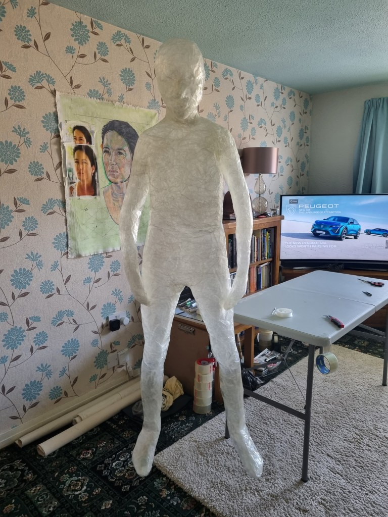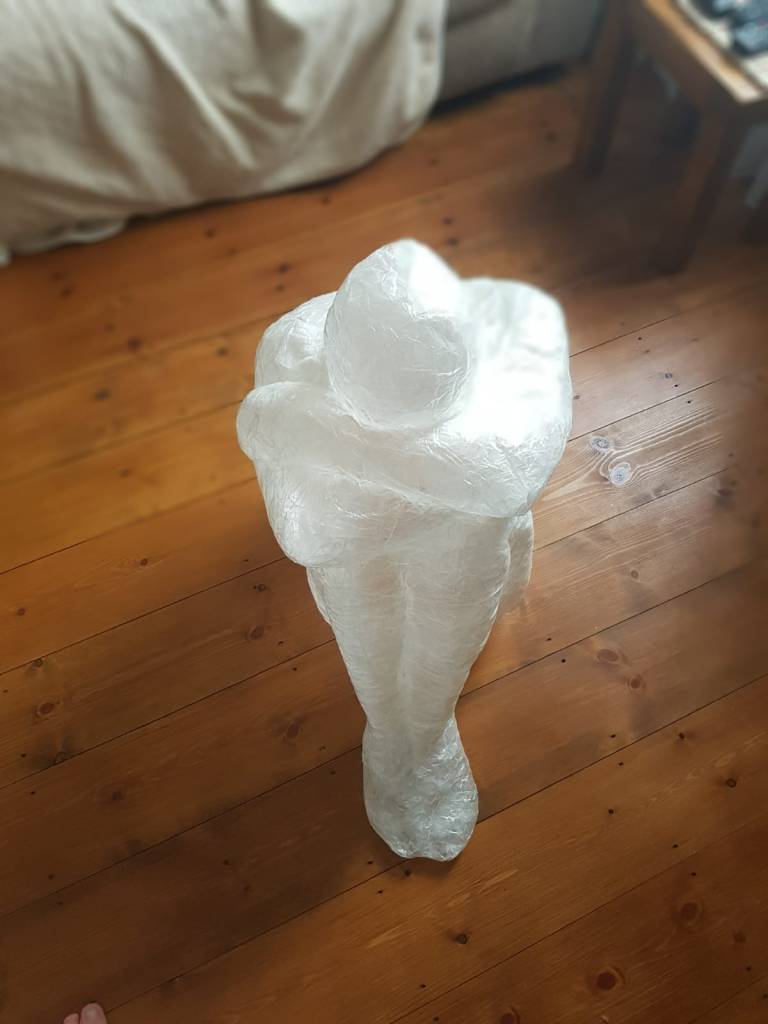 Although I faced many problems, I proceeded anyway because I believed I could fix them later. In addition, if I lost the body’s shape, I could use pictures as references to work on the body shape. I struggled to release the model from the sellotape. However, when I liberated her from the cocoon, the figure was distorted and unrecognisable, almost inside-out.