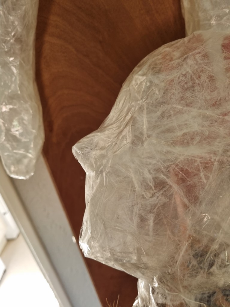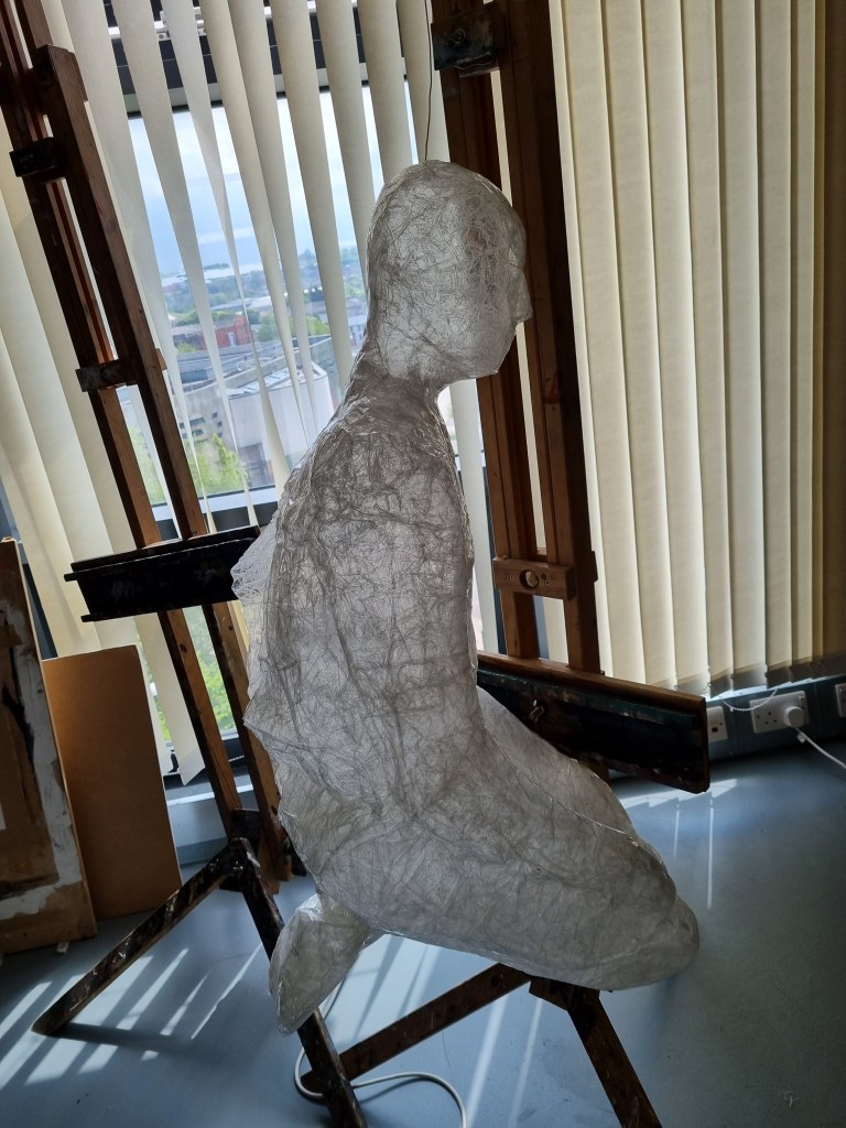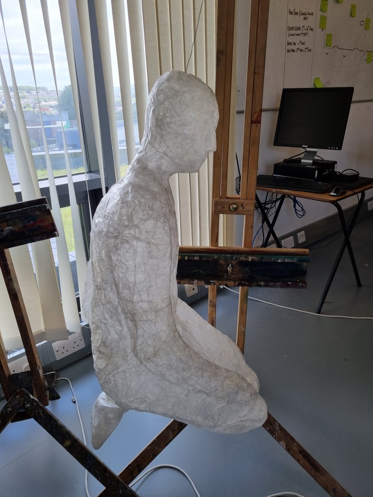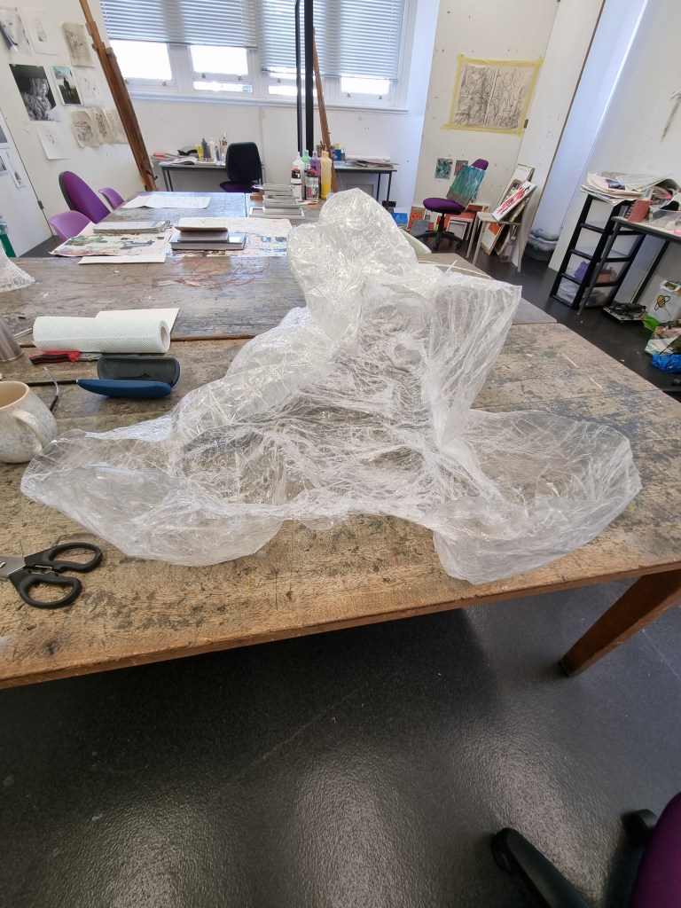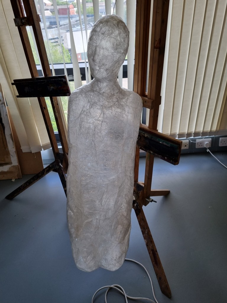 Although I faced many problems, I proceeded anyway because I believed I could fix them later. In addition, if I lost the body’s shape, I could use pictures as references to work on the body shape. I struggled to release the model from the sellotape. However, when I liberated her from the cocoon, the figure was distorted and unrecognisable, almost inside-out.