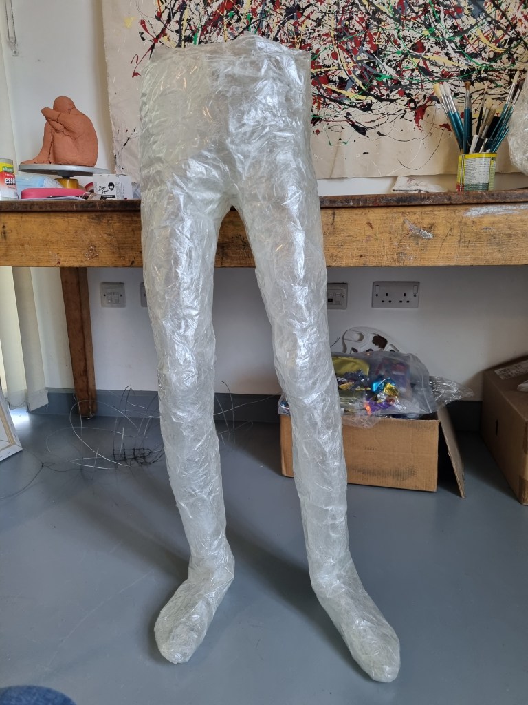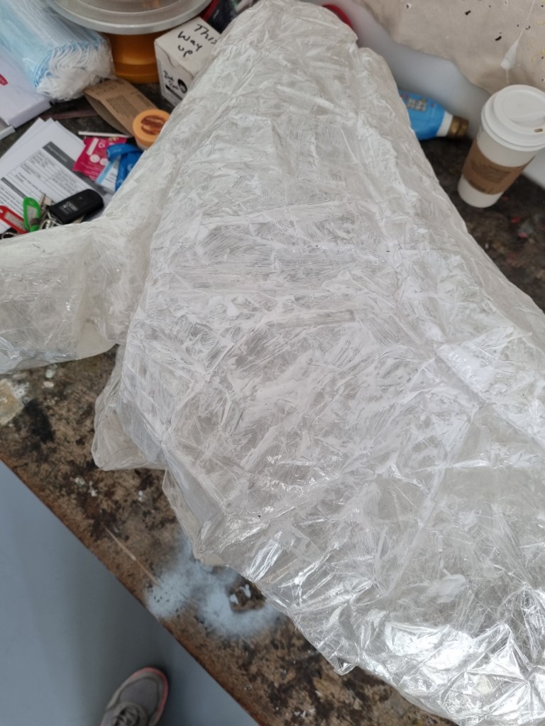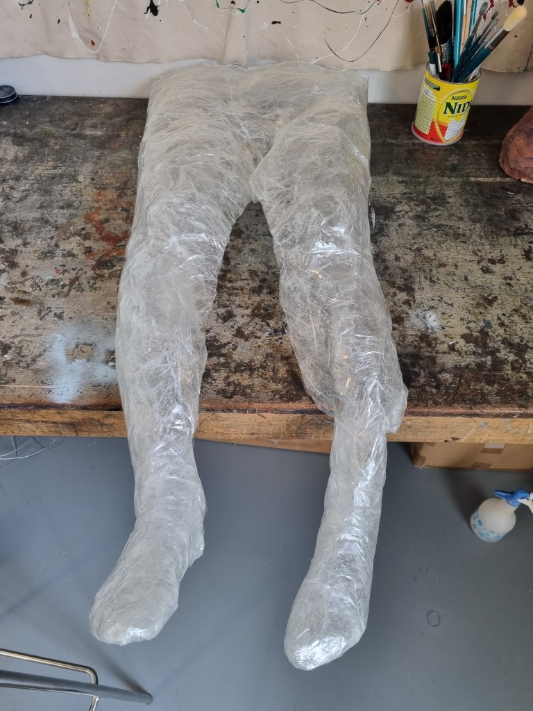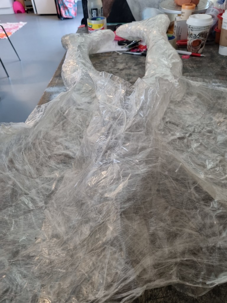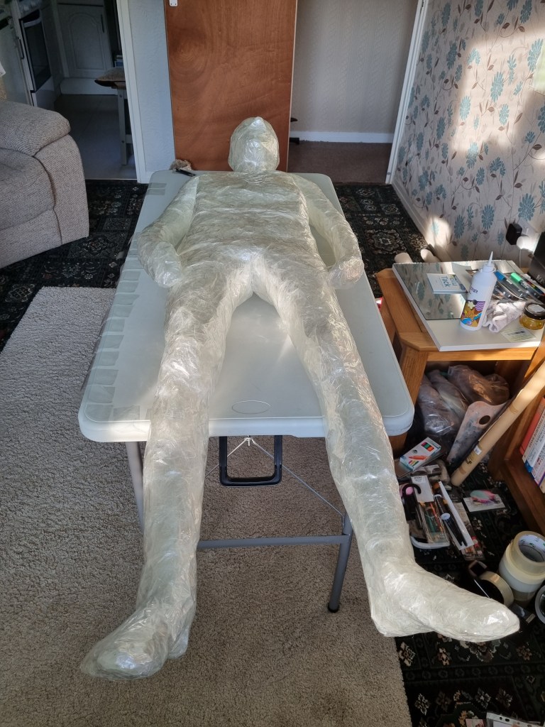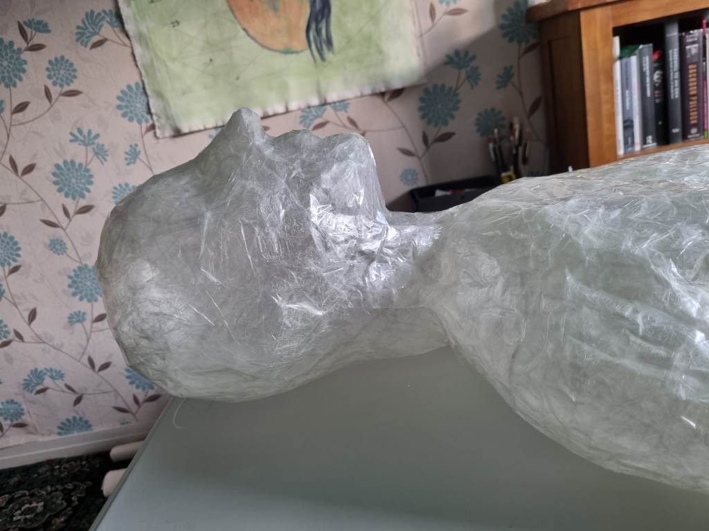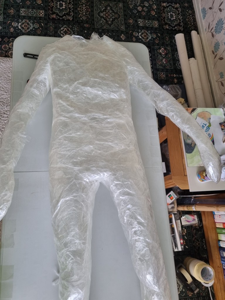 When I finished wrapping the lower half of the body with cling film, I again double-layered the middle part with sellotape. Then I cut the model out of the cast to work on the structure and firmness.