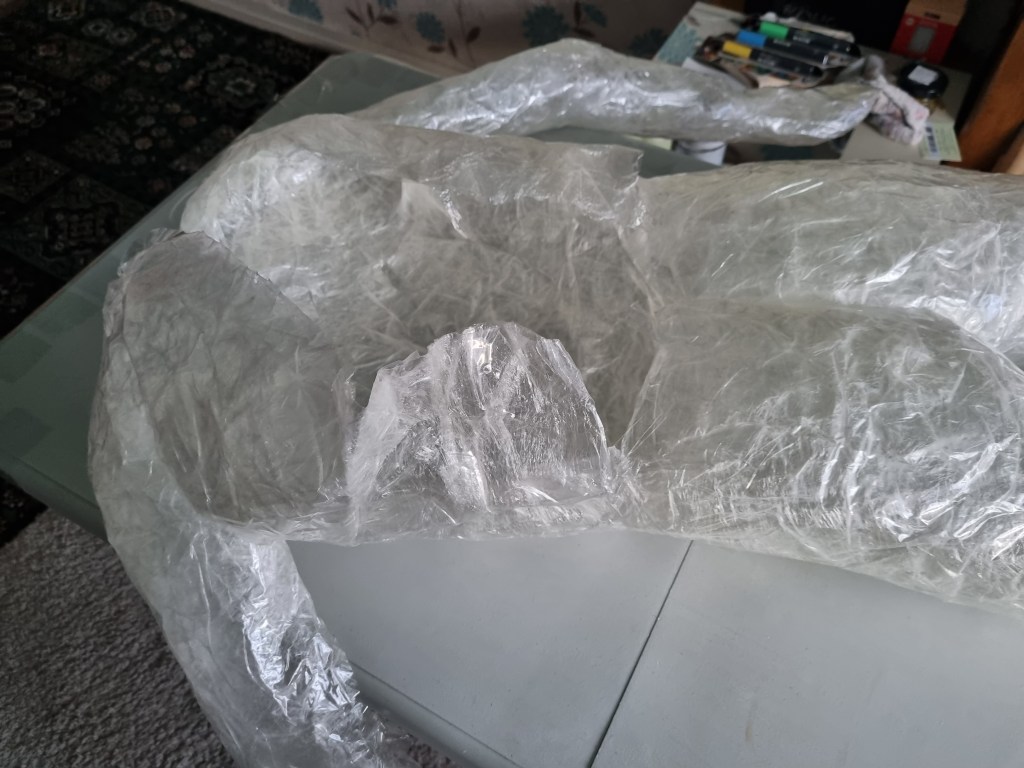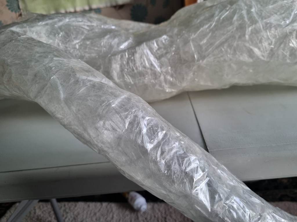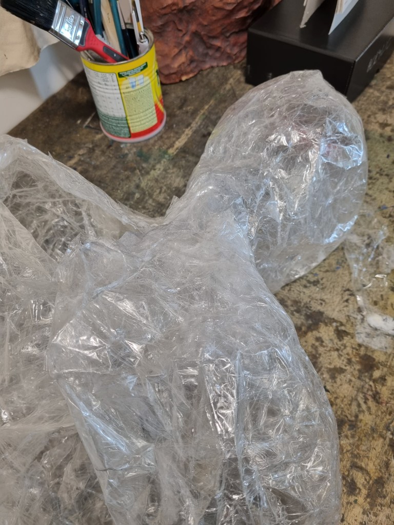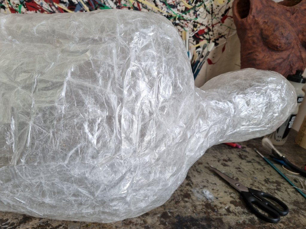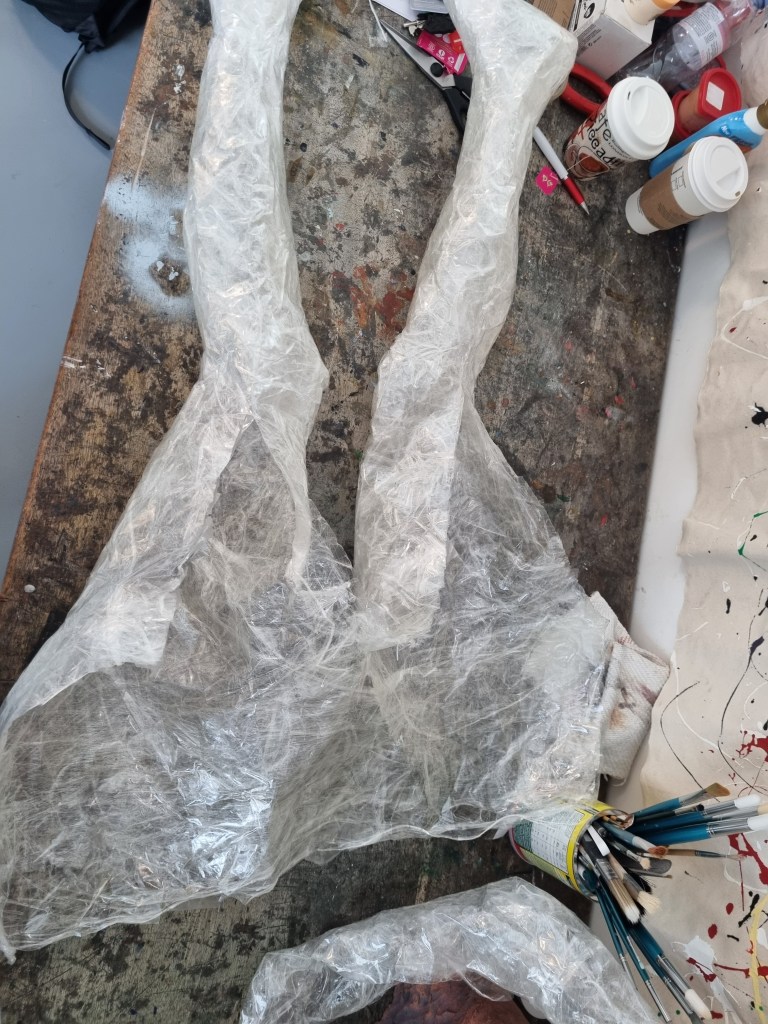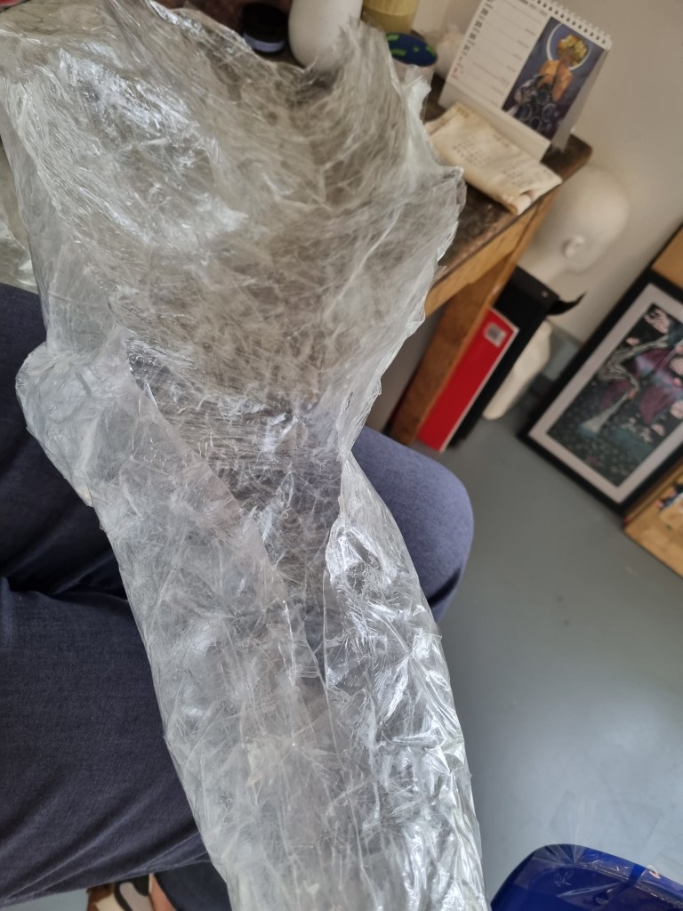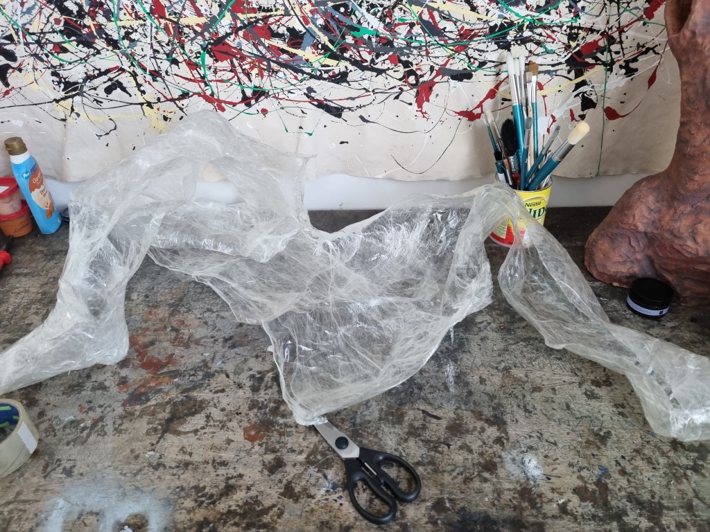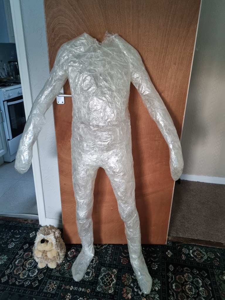 When I finished wrapping the lower half of the body with cling film, I again double-layered the middle part with sellotape. Then I cut the model out of the cast to work on the structure and firmness.