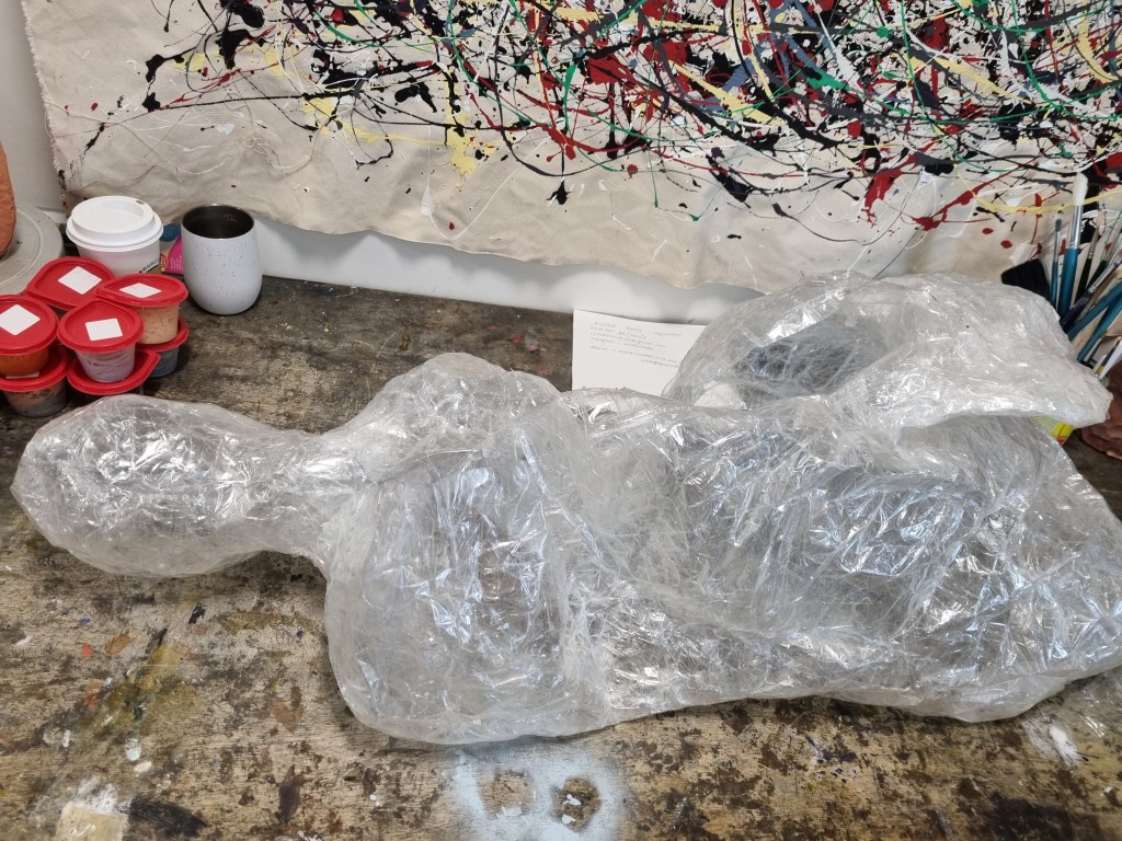 The head was attached and looked too big for the body. That could happen because I made the cast of my head instead of my daughter’s, and I have a lot more hair, which could affect the size. I did not think about it too much and moved on to the body’s shape. The figure’s chest was flat, which was intentional because the sculptures represent sexlessness.