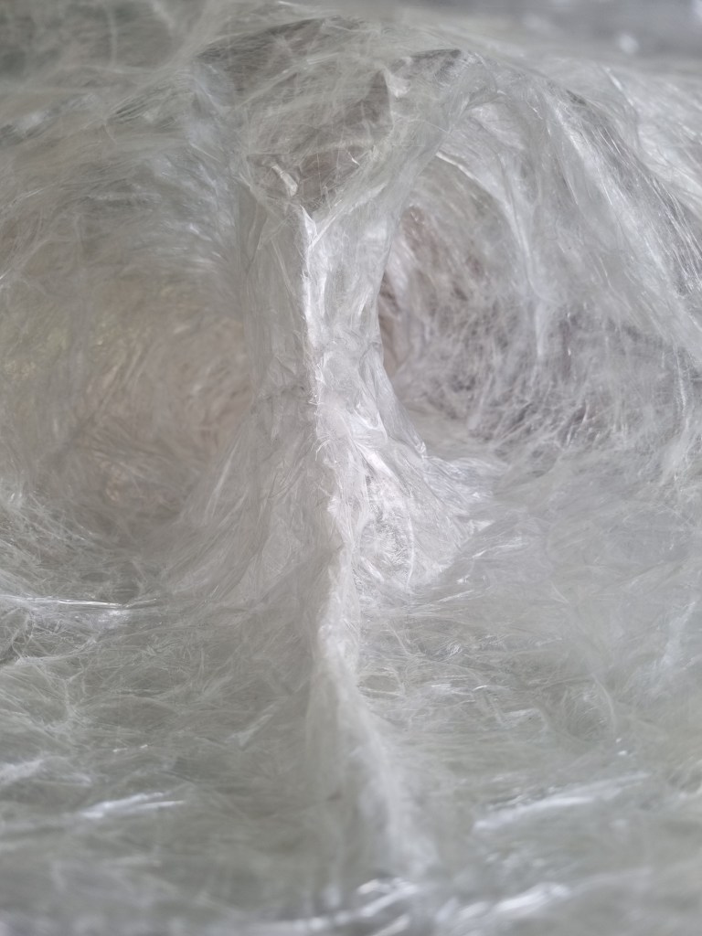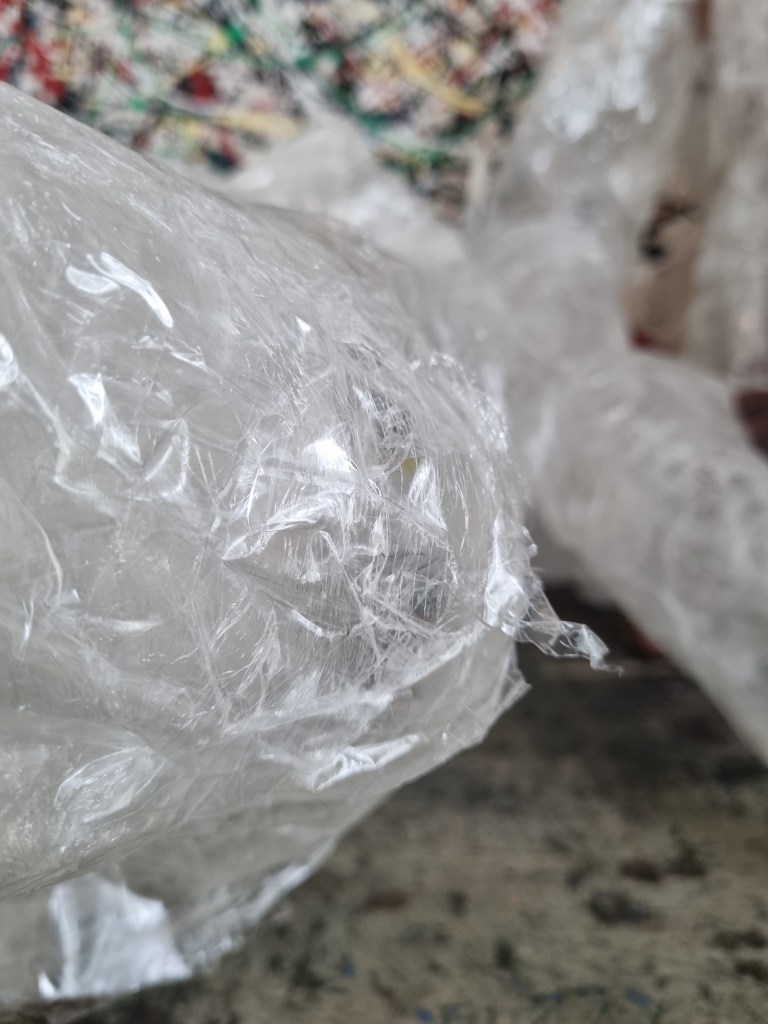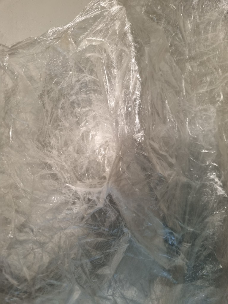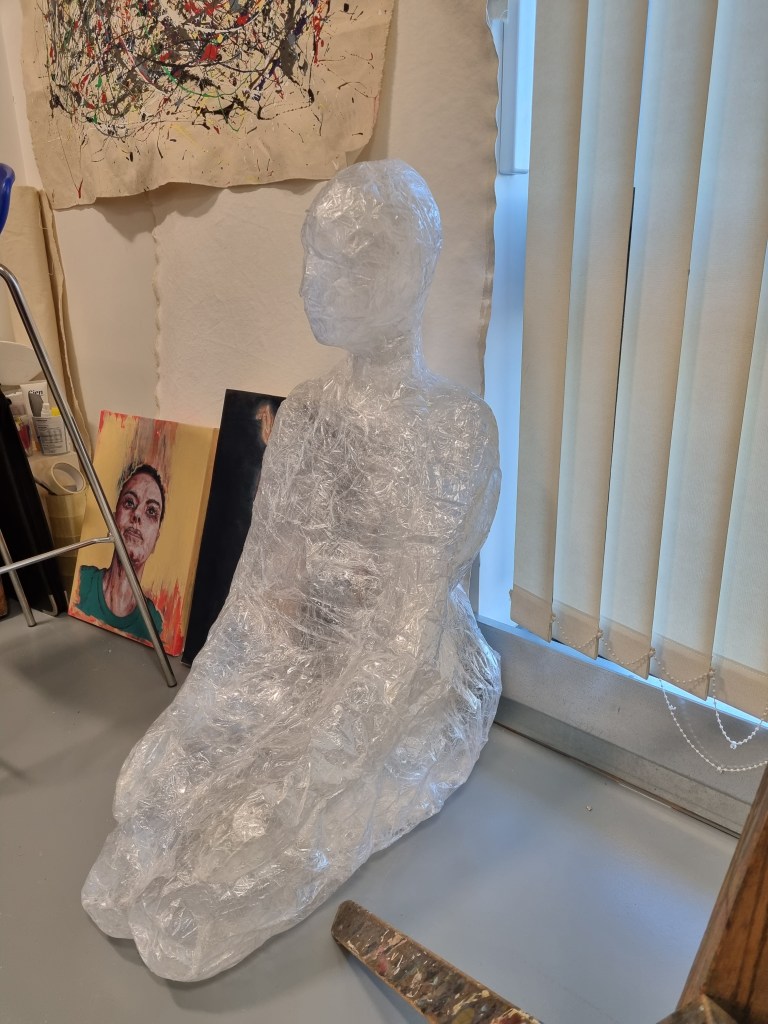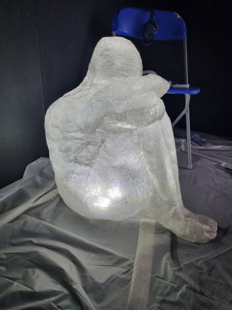The sellotape on the knees created space between the tape and clingfilm, creating a ghost effect. I turned the knees over and worked on it from the inside. I had to cut the clingfilm, straighten it flat and tape it over to articulate the body’s shape as close as possible to reality. I like the wrinkles and lines the clingfilm makes inside the sculptures. This aspect resonates with the sparkles that the meditator should visualise while meditating.