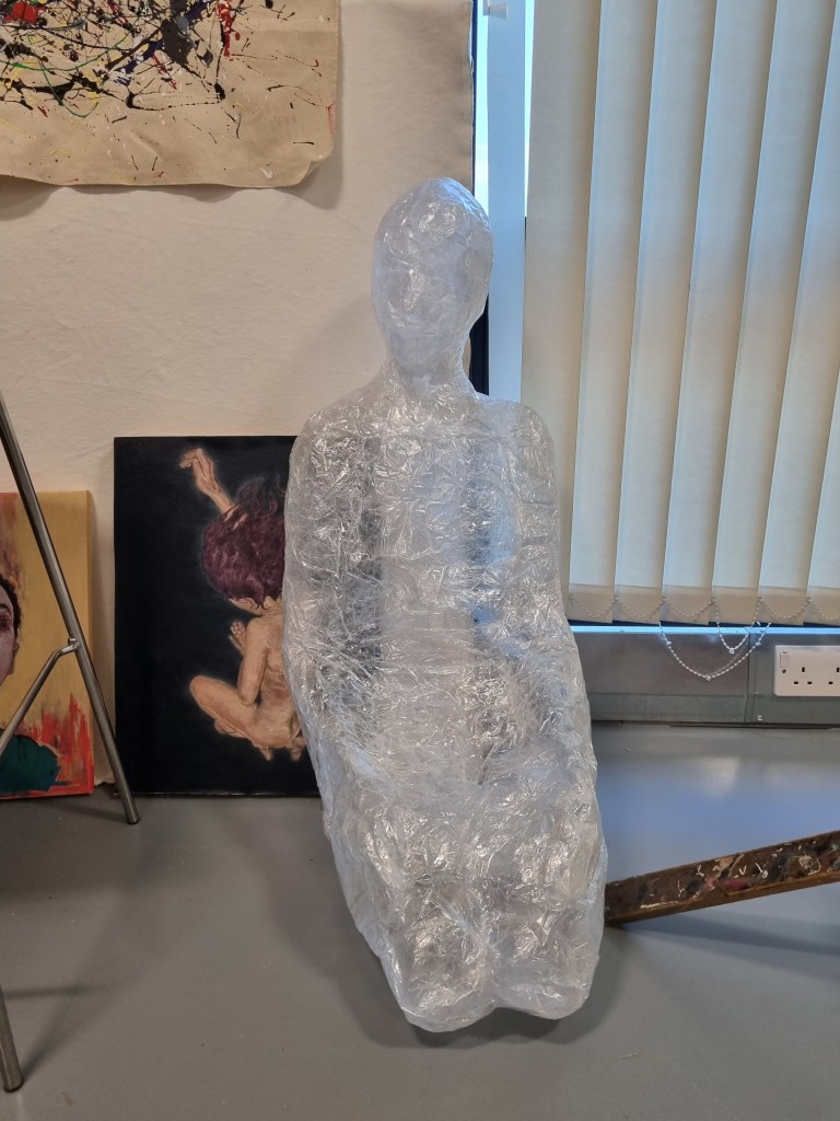I made a sculpture from the sellotape called ‘Anxiety’. I articulated the body language well, so I used the same technique with this sculpture, hoping it would work out. Instead, I learned that the pose for this sculpture was more difficult. However, I could support the structure by applying more layers to build up the strength of the body. Then, I could work on it with more structure support instead of struggling with soft materials and facing difficulties keeping the shape in the proper proportions.