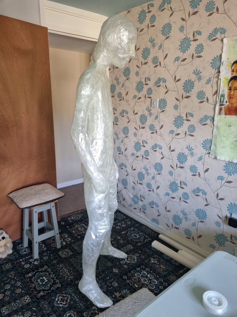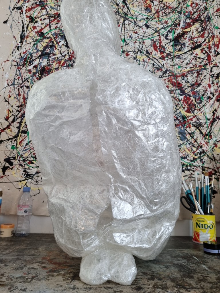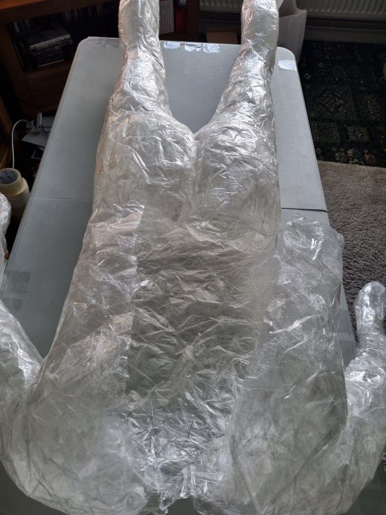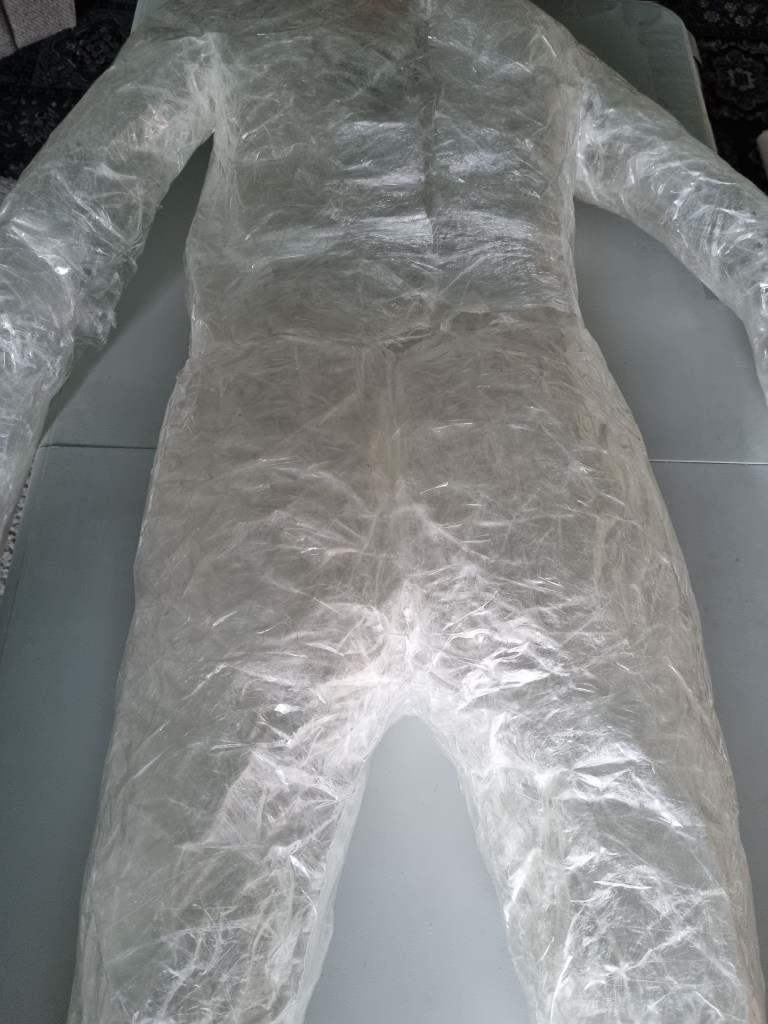 The first impression is that the pose looks stiff. The arms being covered apart from the body would make it difficult to get them out afterwards. The pose was very challenging. However, I wanted to keep the arms as close as possible to avoid the struggle of releasing the cast or cutting the material far too much to enable me to remove the model from the form. I also wanted to cut and add more sealing tape to the places needed to create the right shape.