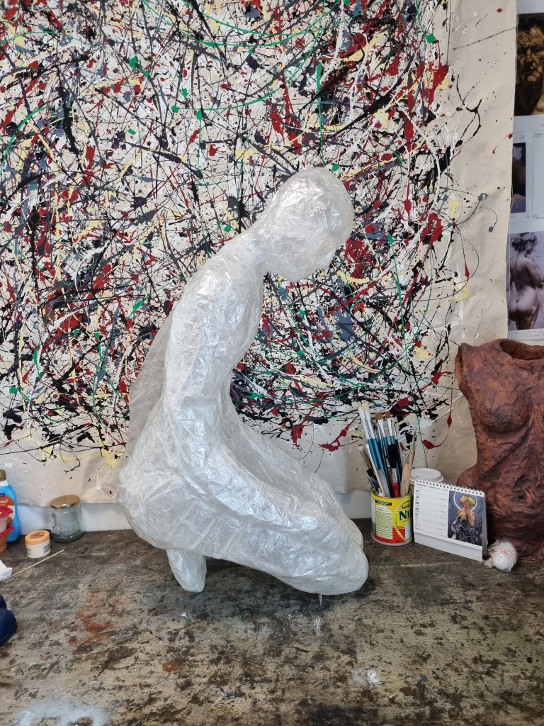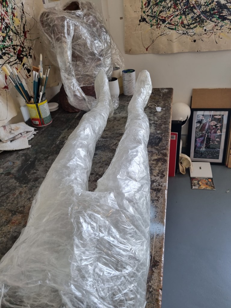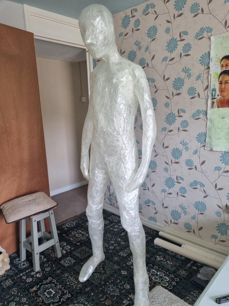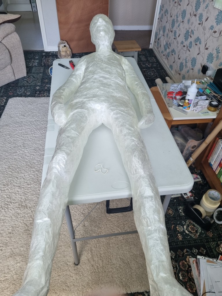The first impression is that the pose looks stiff. The arms being covered apart from the body would make it difficult to get them out afterwards. The pose was very challenging. However, I wanted to keep the arms as close as possible to avoid the struggle of releasing the cast or cutting the material far too much to enable me to remove the model from the form. I also wanted to cut and add more sealing tape to the places needed to create the right shape.