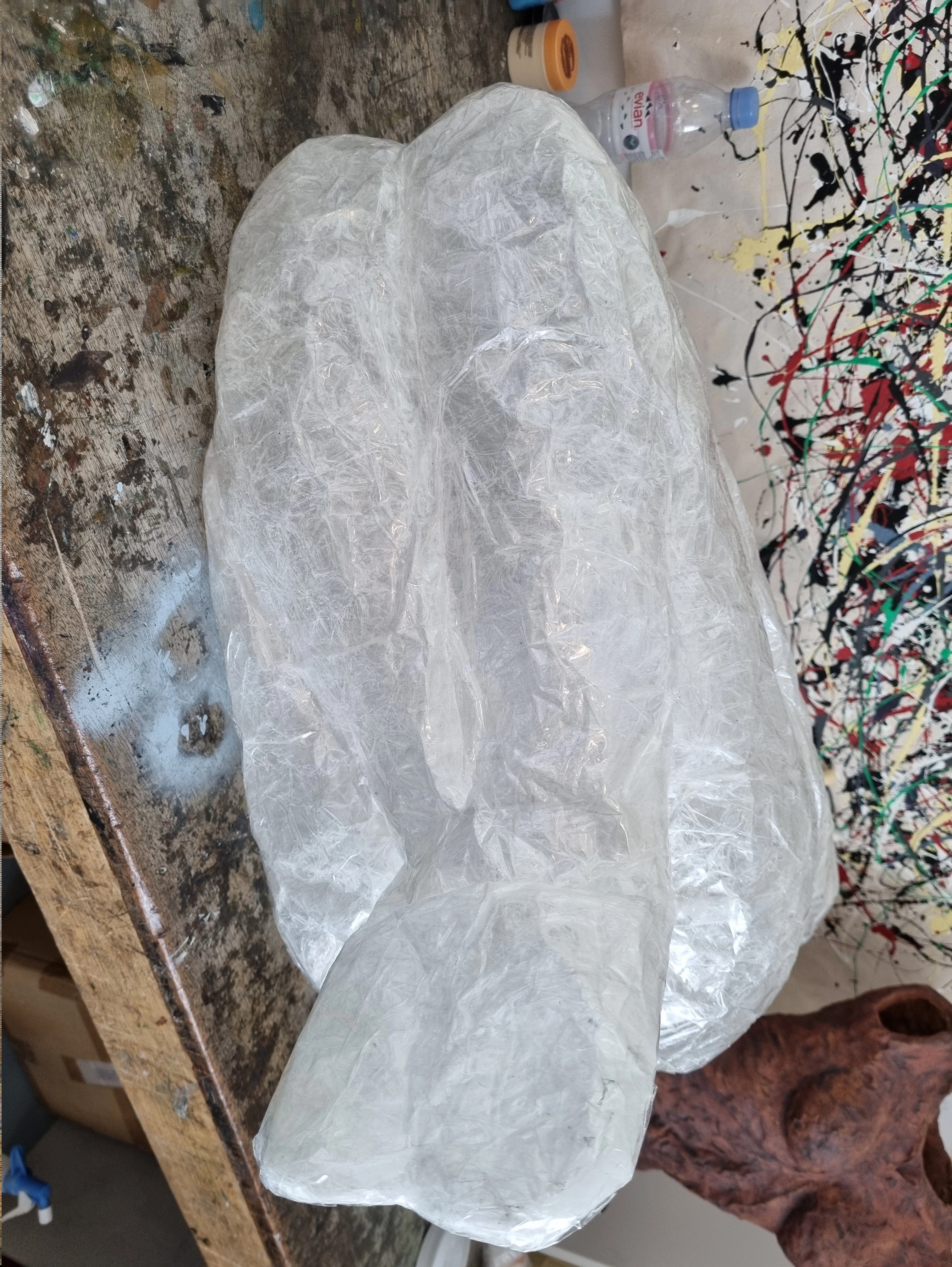 I am including the sculpture “Anxiety” in the installation to support the concept of the final piece. The installation is also a representation of human conditions. The “Anxiety” expresses the feelings imprinted in the sculpture through the process. The connection of the human element (the model) who experienced fear of suffocation while trapped in the cocoon of sellotape is the energy that resonates with the installation.