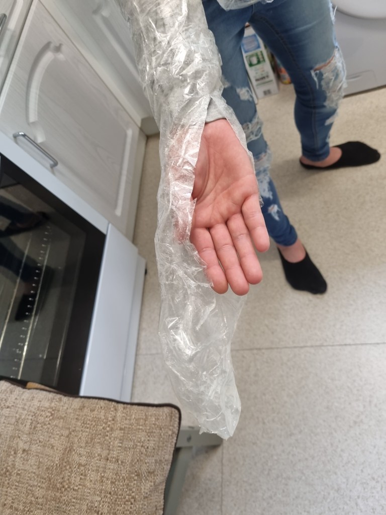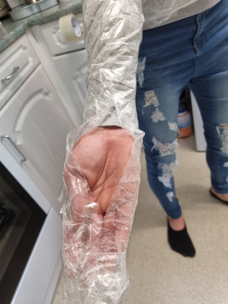 The arms were tricky. I had to cut the components in the wrist parts upwards more than expected because I could not release the model’s limbs. The struggle caused the sellotape to tear away from the cut (creating a seam). However, that is fine, as the material is pliable and offers easy manipulation and flexibility.