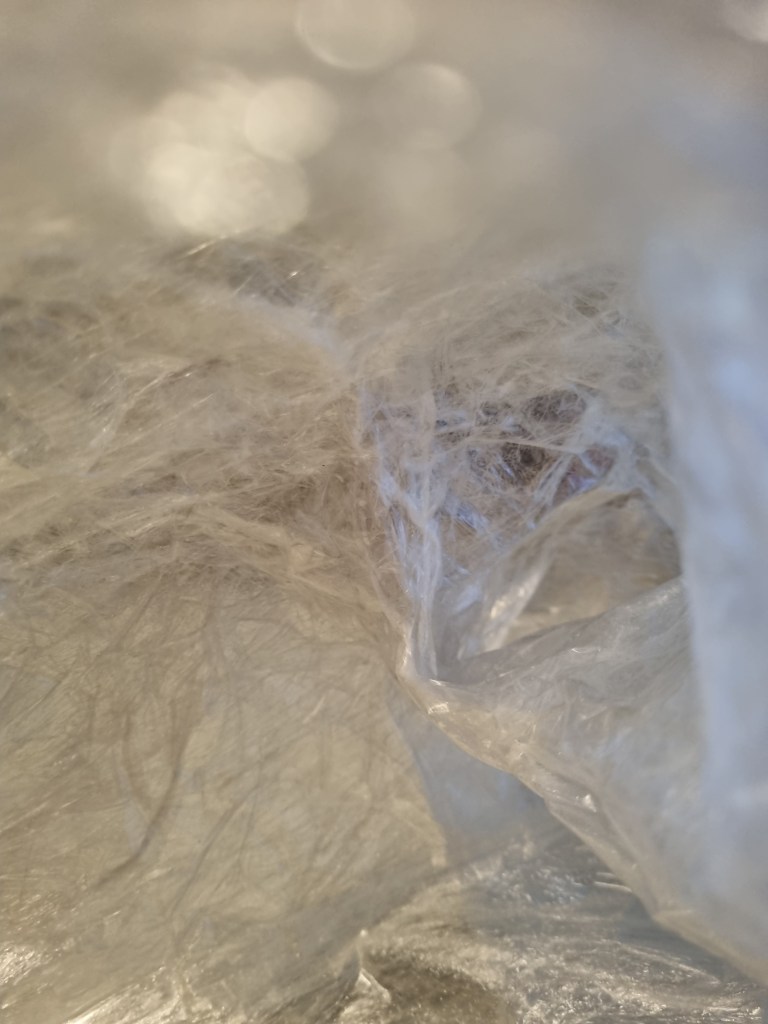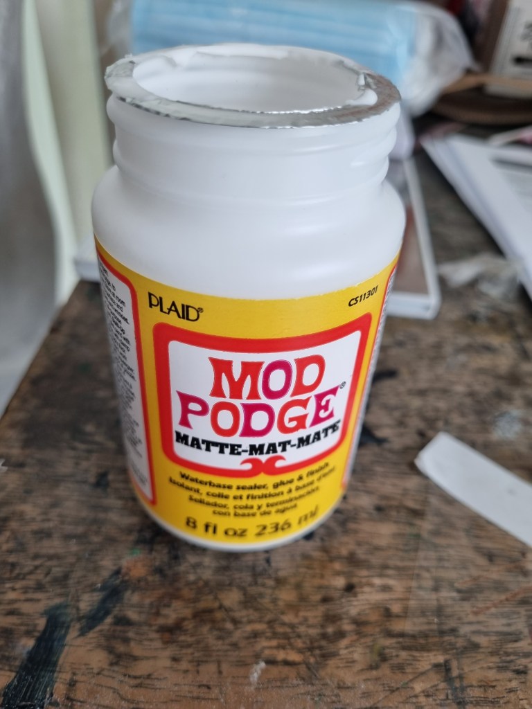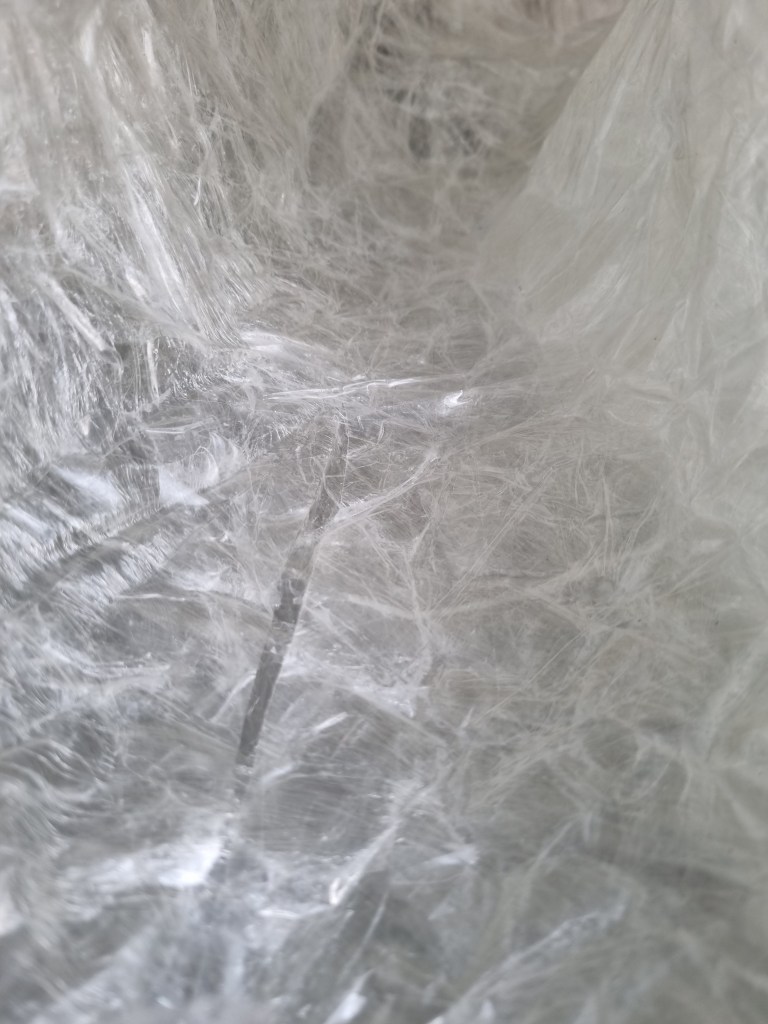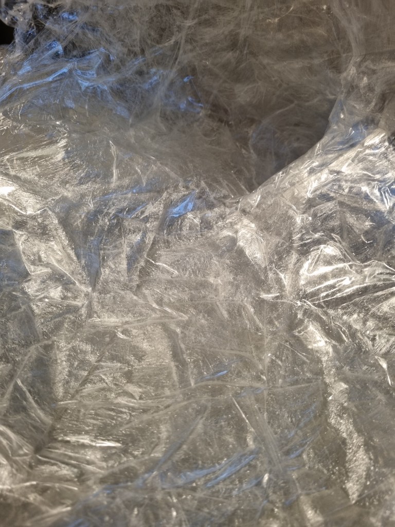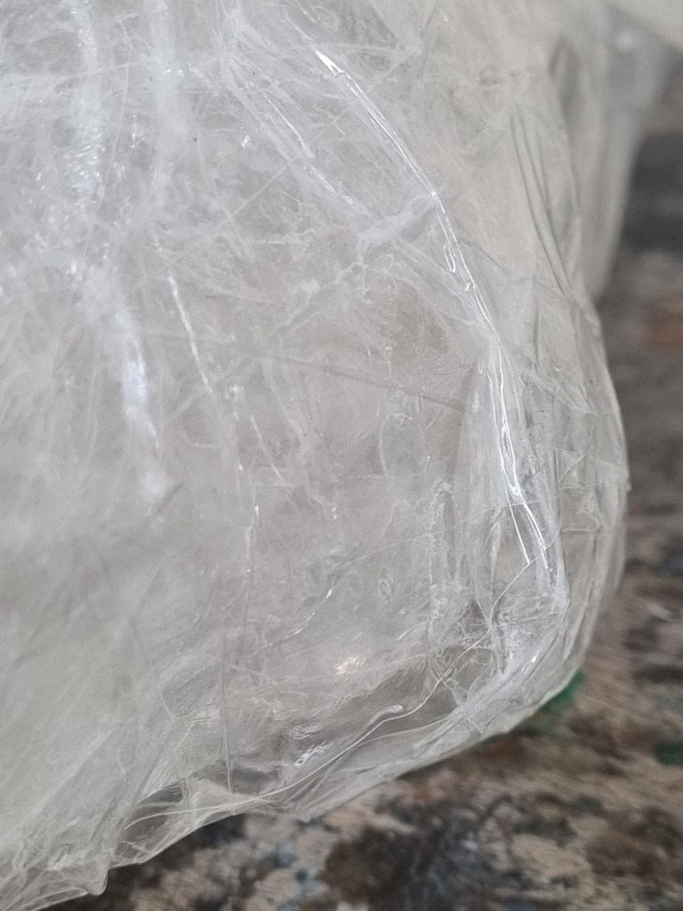I spoke to my student fellow Bee about the problem, and she recommended “Mod Podge” Matte-Mat-Mate, to firm up the sculpture. However, I wanted to keep the transparency of the statue, so I was unsure if the glue was a suitable medium. Although the adhesive is milky and cloudy in colour, when it dries, it becomes apparent, so I decided to proceed.