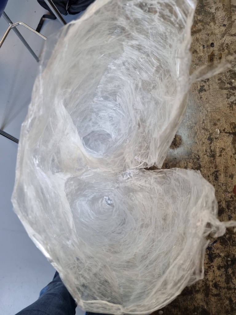 I applied and layered the structure, then cut the cast at the back so I could release the model. The form looked great. It was transparent and looked delicate. First, however, I needed to add more layers of sealing tape to create firm consistency. Next, I added layers to the outside and inside to support the shape.