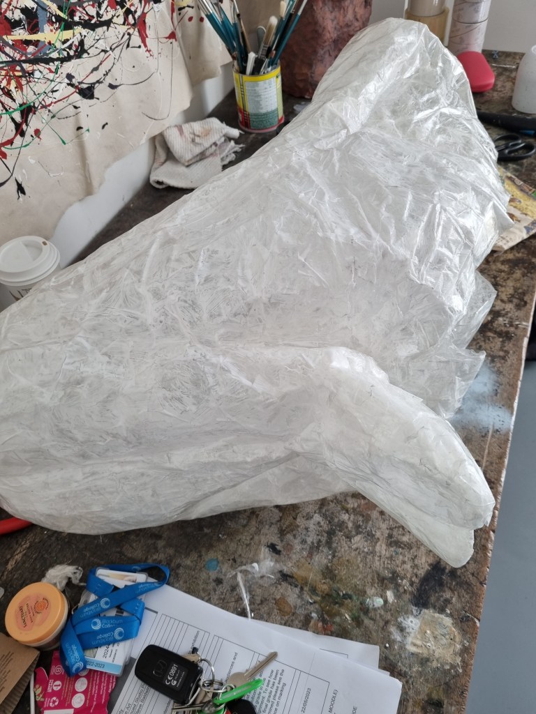 I applied the sealing tape to the cast inside and outside to support the firmness of the sculpture. Getting to some decent firmness was challenging because the structure was soft, and I had to work on it without firm support. I had to wrestle with the bunch of material until the structure was more supported to handle it without struggle.