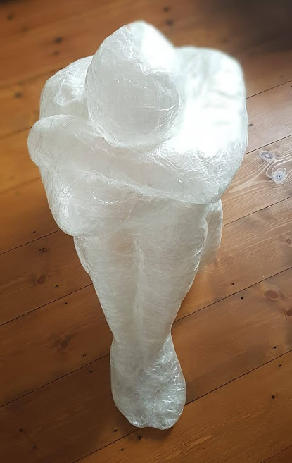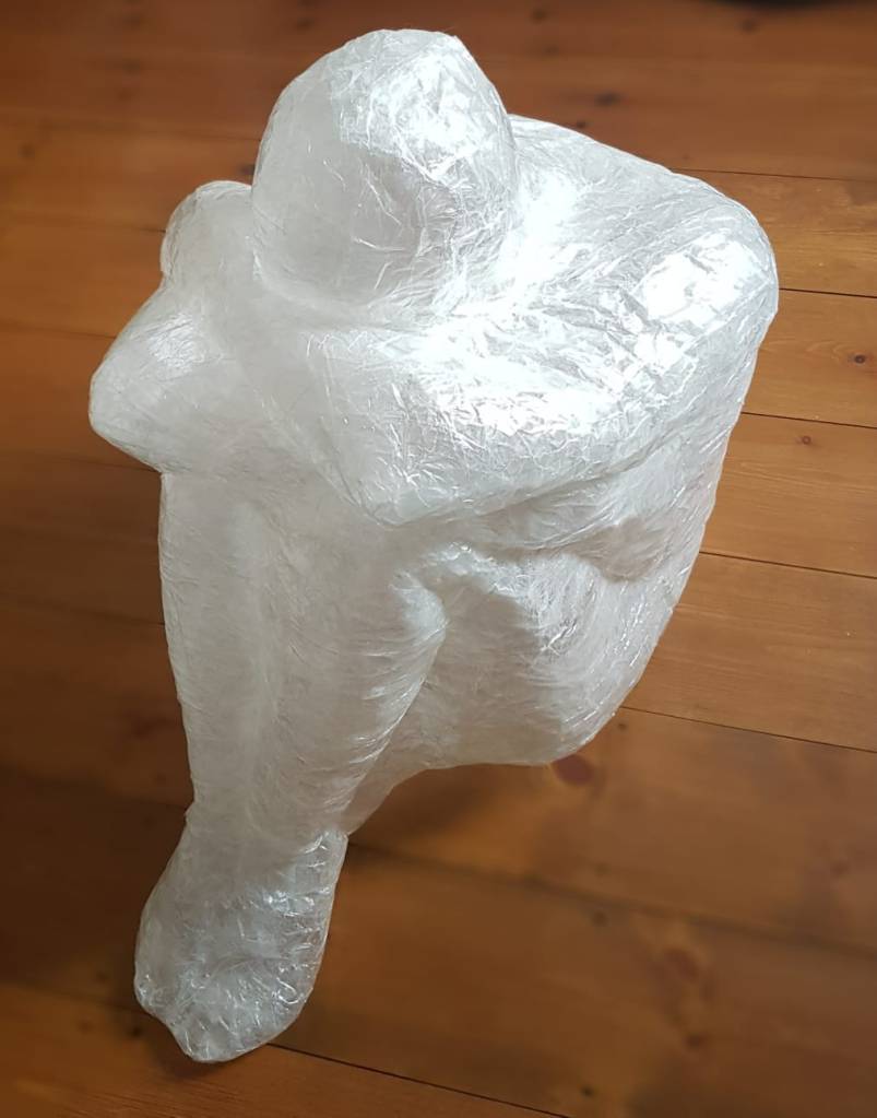 I started with the first sculpture, “The meditative pose”. I used my daughter as a model again. I explained what I had in mind and demonstrated the pose to her. Because the pose was challenging, we decided to cast the head at the end. I started to wrap the model into cling film without the head. I wanted to have visibly prominent forms of the body shape. I covered the limbs separately with cling film to emphasize the body conditions.