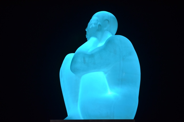 The figure had dark parts that did not look right and did not create a profound and subtle impression. So I placed the lights outside the body directed from the floor at the standing figure. That wasn’t what I wanted at the beginning. However, it gave the installation different perspectives. The light created shadows that gave the standing pose volume. I like the variety of lights as it would add an extra dramatic aspect to the sculpture’s elevation.