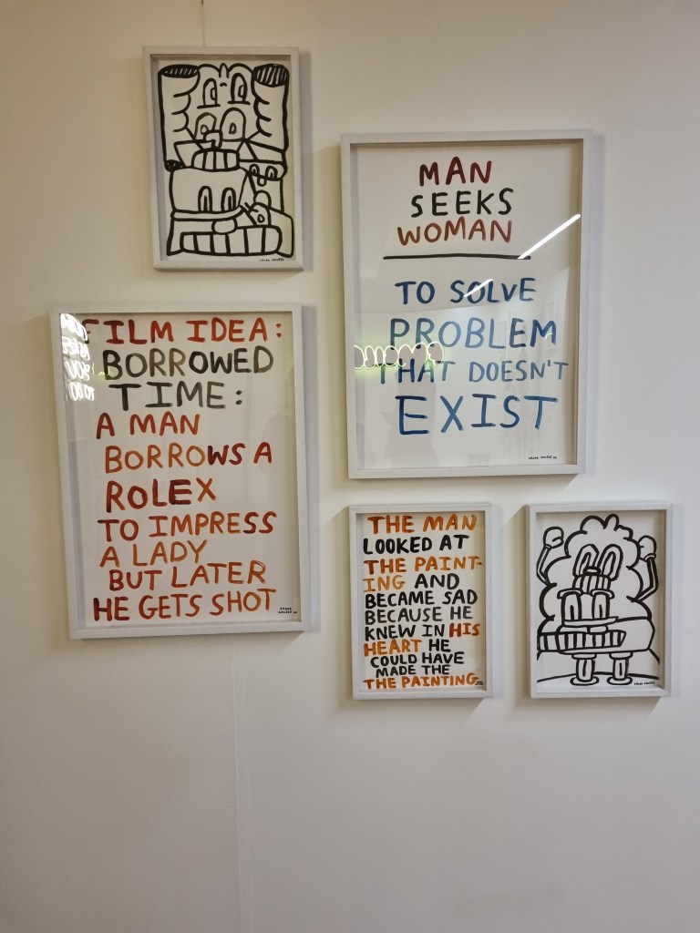 Although I have seen the artist, I, unfortunately, did not speak to him as I felt a bit intimidated by some of the writing, specifically by the bitterness in some written slogans and the descriptions. I regret that I decided not to approach Barak because I would like to know more about the concept of his work. Some of the work was quite funny and inspired by live events, which I greatly appreciate in art. However, the human conditions I associate with the artwork struck me and drew my attention to objectivity.