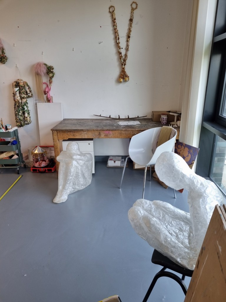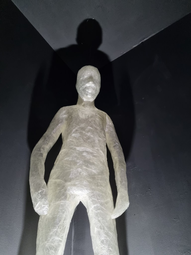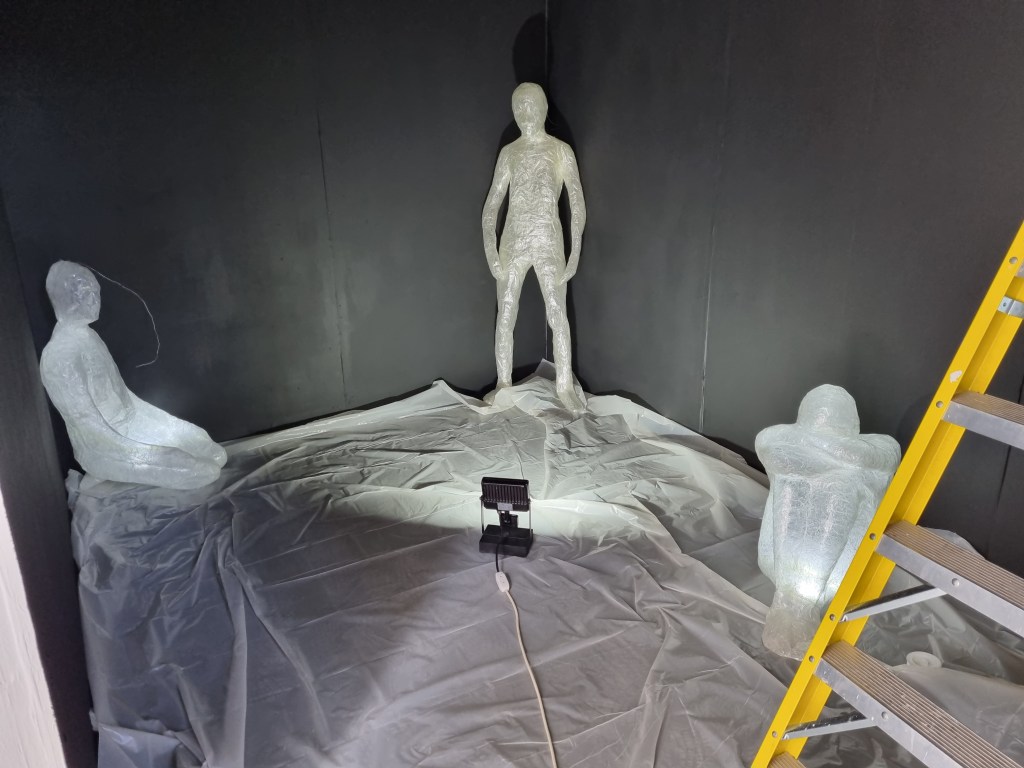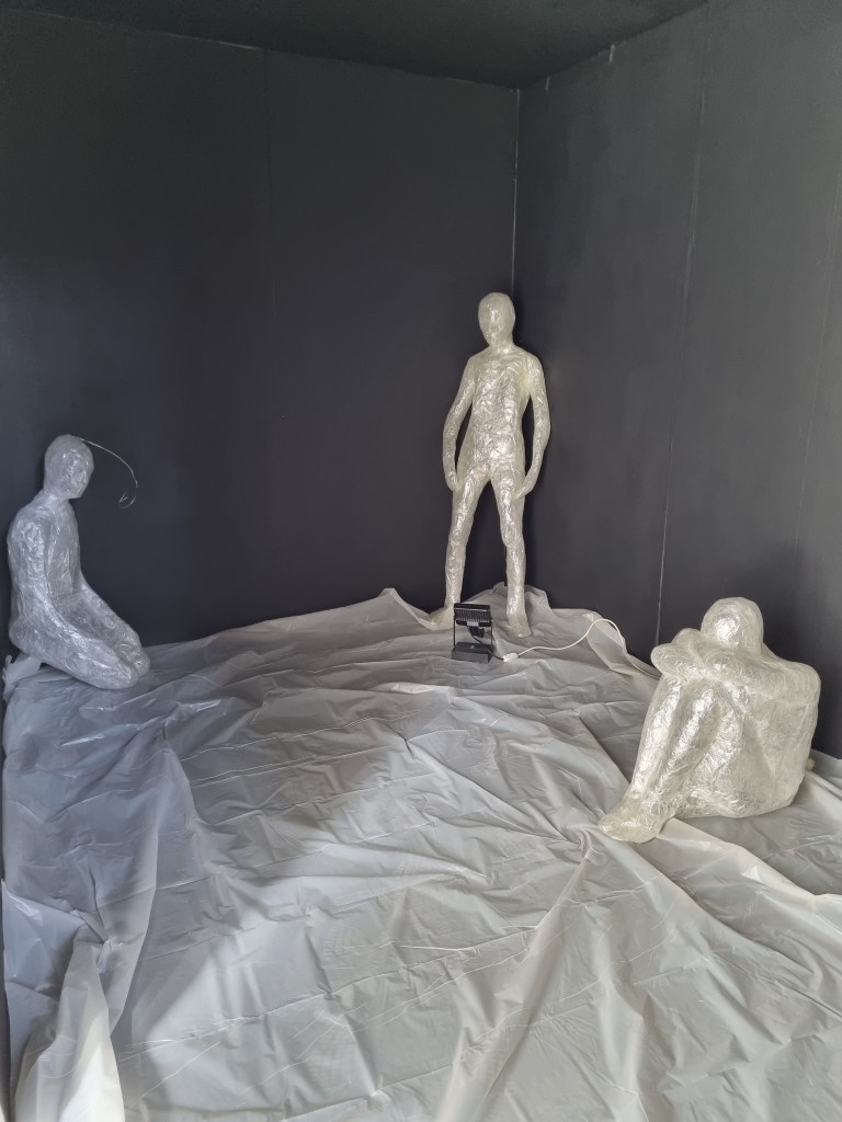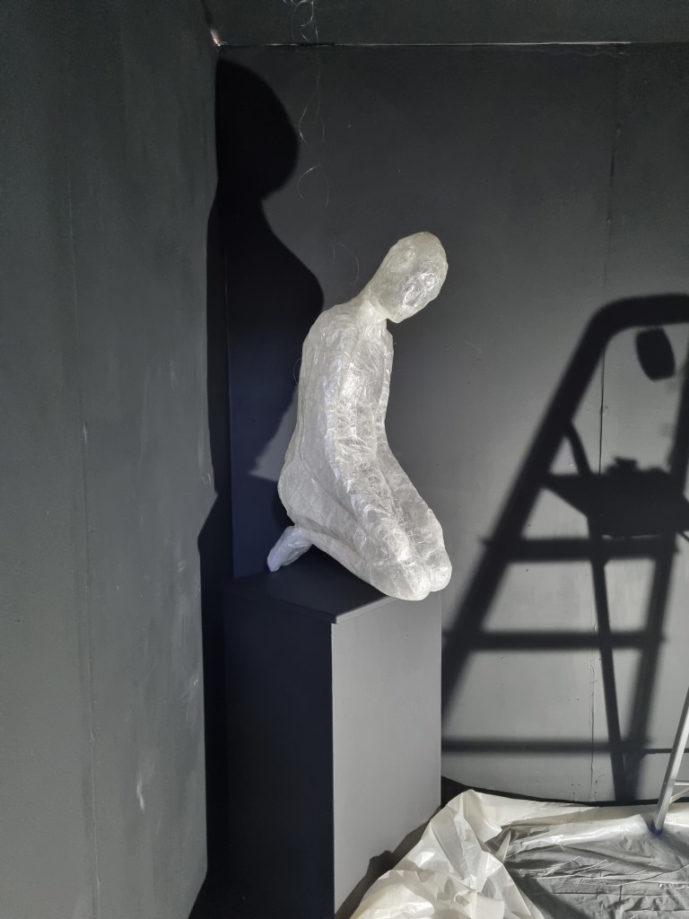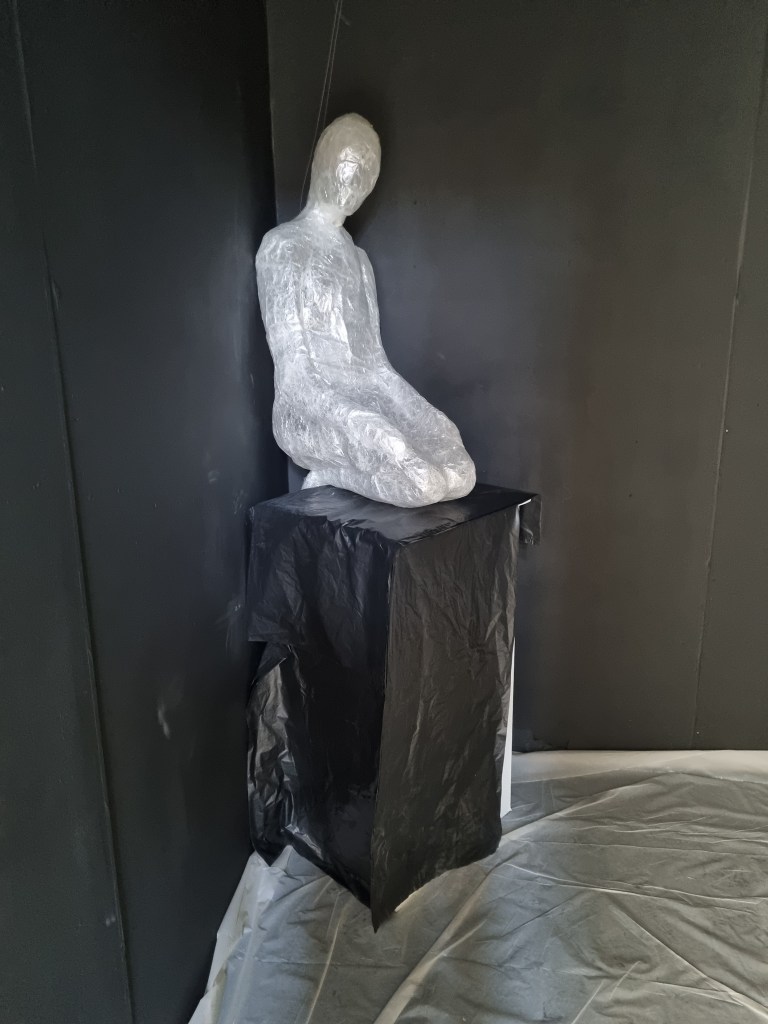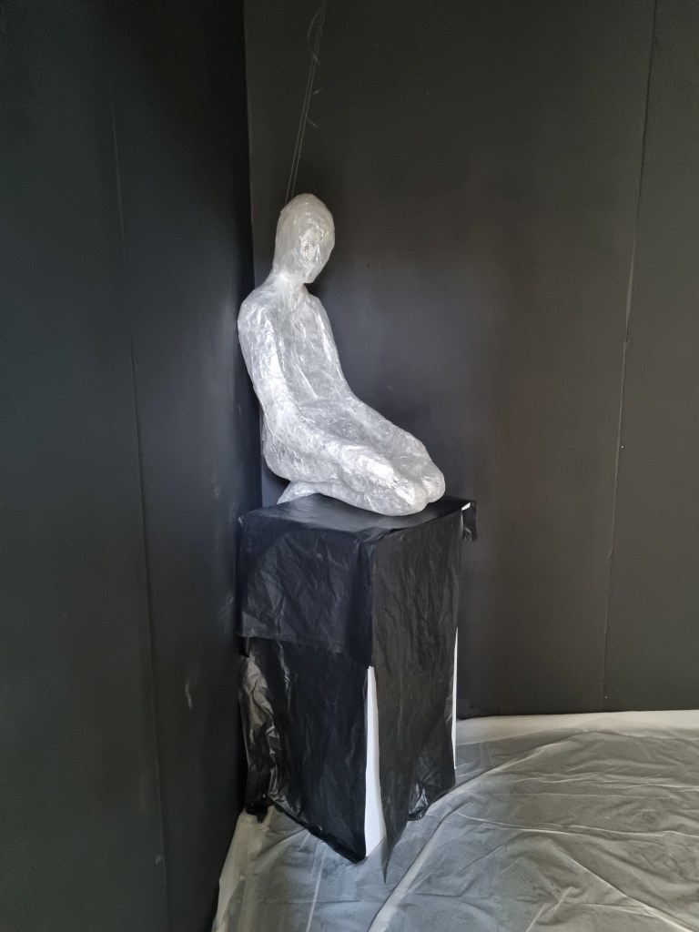 I marked the size of the appointed space for the exhibition and placed some of the sculptures to see what they could look like. I put one on the floor and one on the chair to simulate the plinth height. Then I put both on the chair to see the effect. For example, the “Anxiety” sculpture could be placed on the floor. However, the space must be more significant to put statues on the floor. Foreseeing the effect if the area’s conditions still need to be completed is challenging. For example, contrasting and contradicting elements of light and darkness play a vital role in this installation. The sound should reinforce the effect of the contrasting aspects and support the concept.