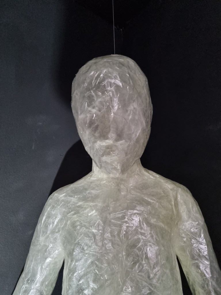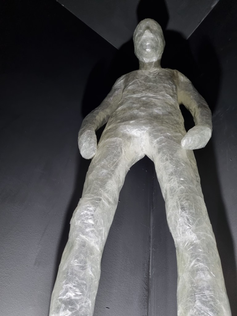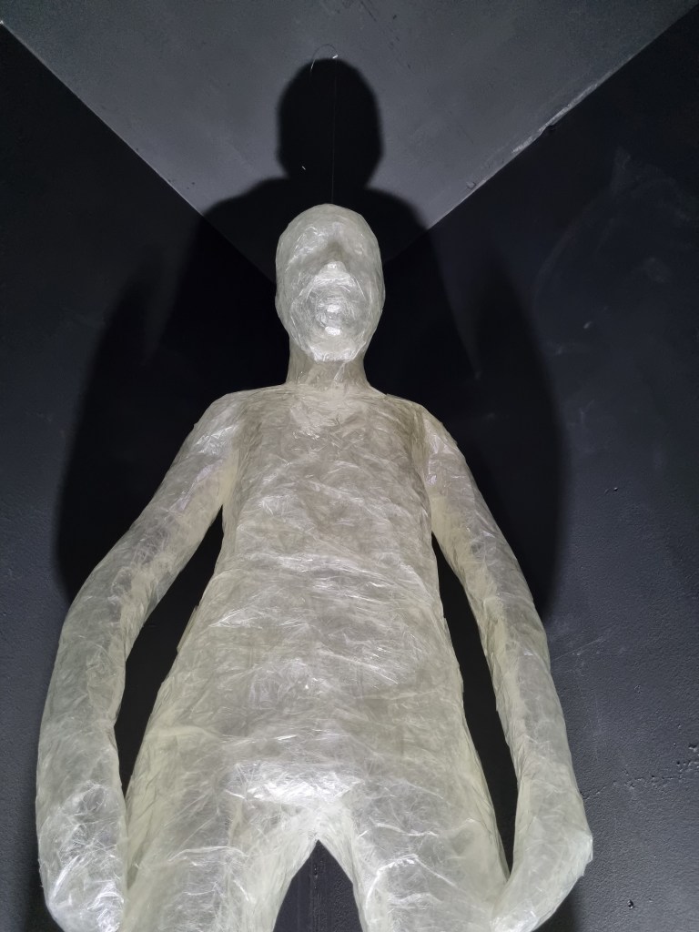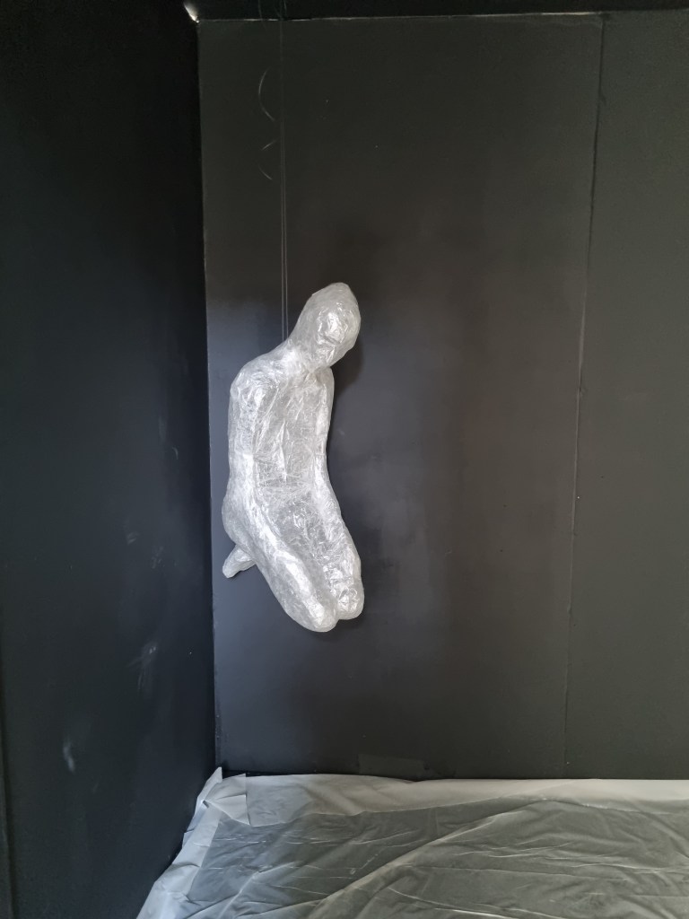 I adjusted the shape of the “Standing” and “Meditative Stated” pose with a fishing line, driving through the sellotaped body. I used a crocheting hug size of 1.0 mm. I also used the fishing line to attach the two sculptures to the sealing. When I placed all three poses into the space, the effect was good, and having the “Anxiety” pose on the floor worked well.