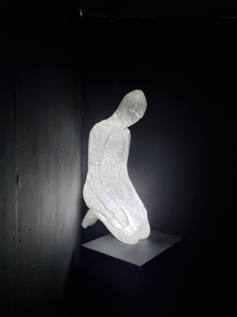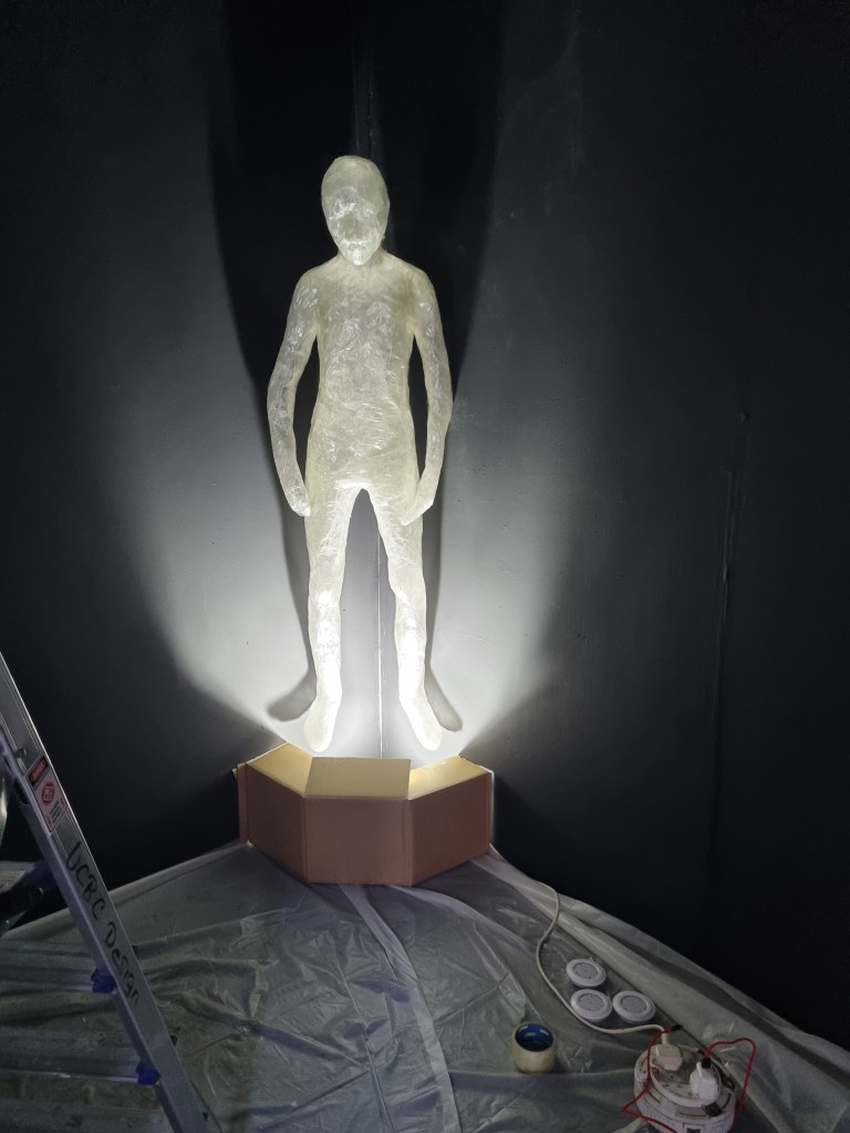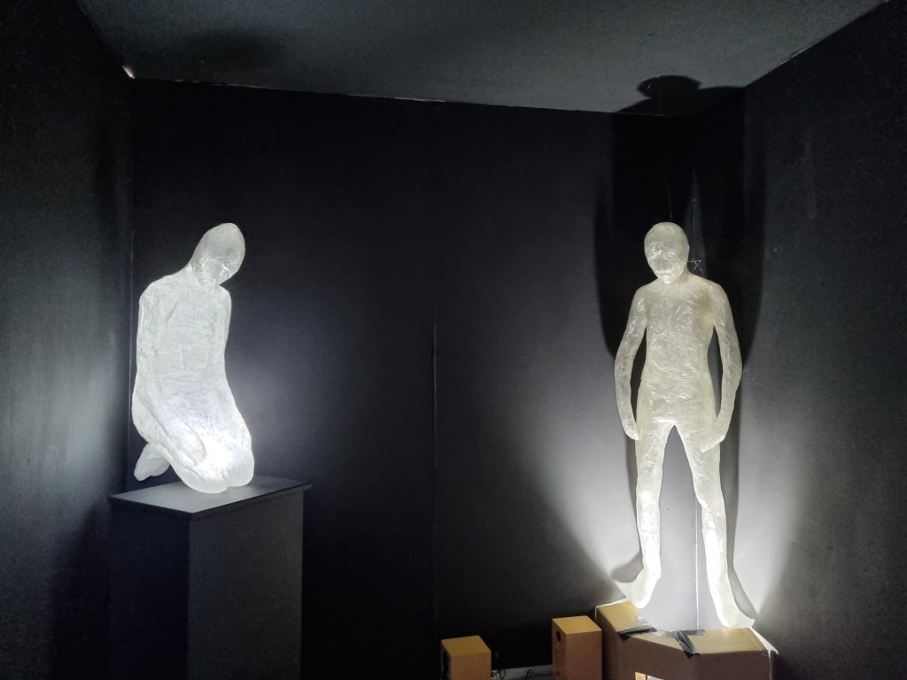 I tested the effect of lights in the standing pose, and the figure had dark parts that did not look right and did not create a subtle impression of the illumination. So I placed the lights outside the body directed from the floor at the standing figure. That wasn’t what I wanted at the beginning. However, it gave the standing pose and the installation different perspectives.