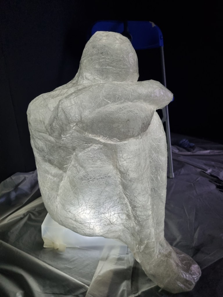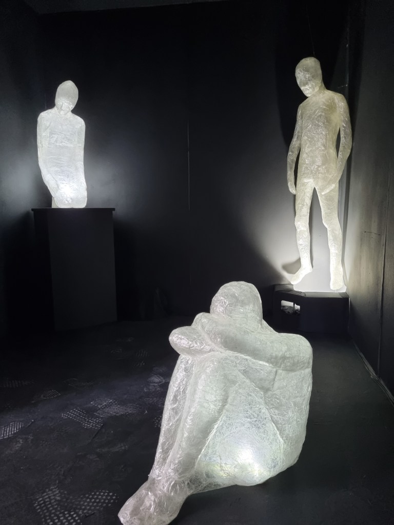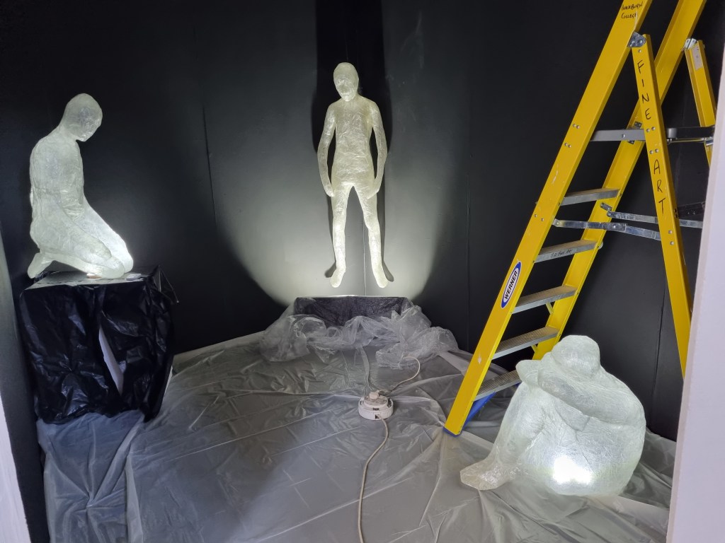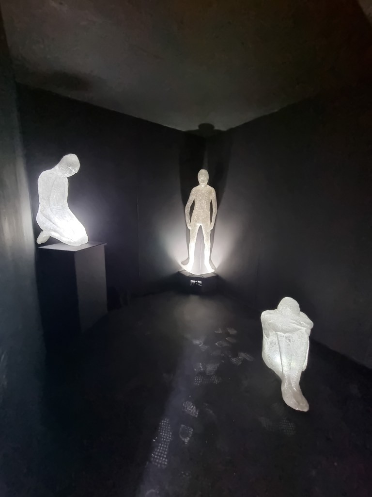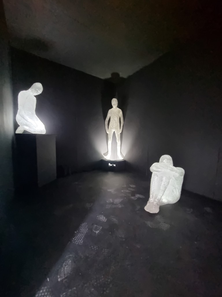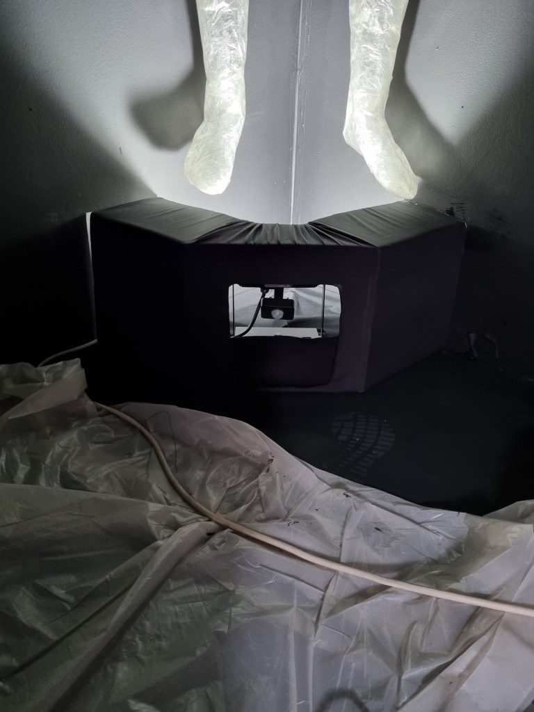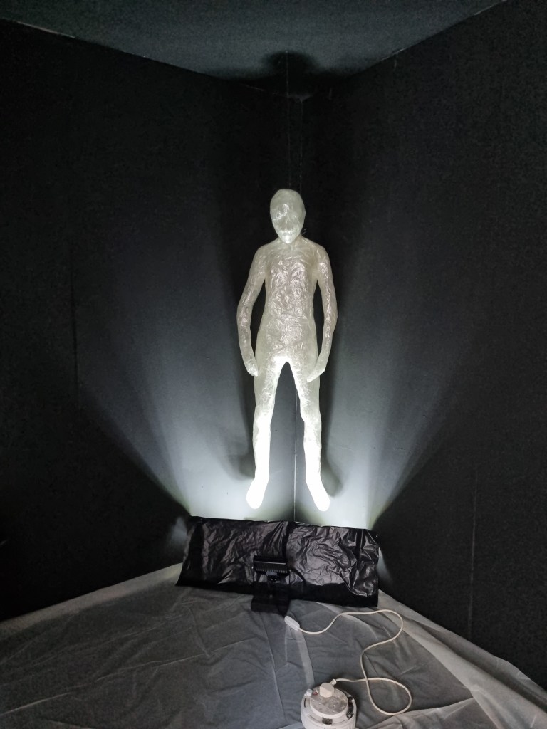 When the audio of both of our pieces was less loud, it seemed to work well together. However, once the sound increased on any side, it started to clash. To diminish the outside sound interfering with the installation audio, I had a thick curtain over the entrance of the darkroom. The curtain was supposed to trap the audio of breath and separate the sounds. That worked well if the sound was low. In addition, the darkroom was too dark and too small for the installation. I would give the three figures a lot more space in the future. The exhibited space is as important as the work and needs to create the proper harmony and balance. The impact of the darkness took some viewers aback. The claustrophobic effect would not be as apparent if the darkroom if it were more spacious. However, the two rooms became from time to time overcrowded, and that could bring the health and safety issue in place. The rooms needed to be more apart from each other to prevent any collisions. I also did not promote the cushion for people to sit down to connect with the sculptures as it was black and could cause trip hazards.