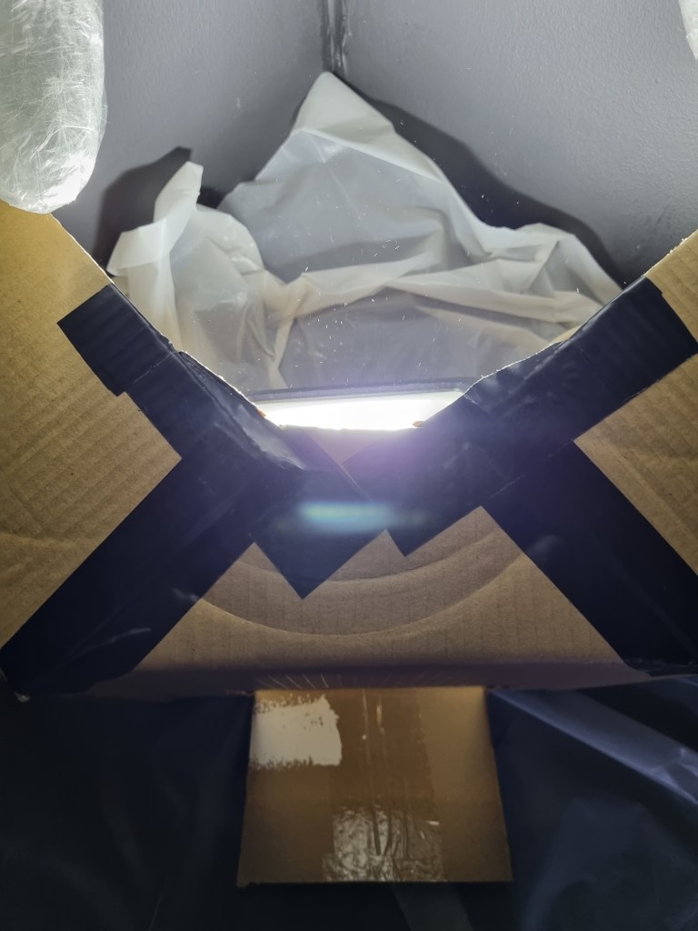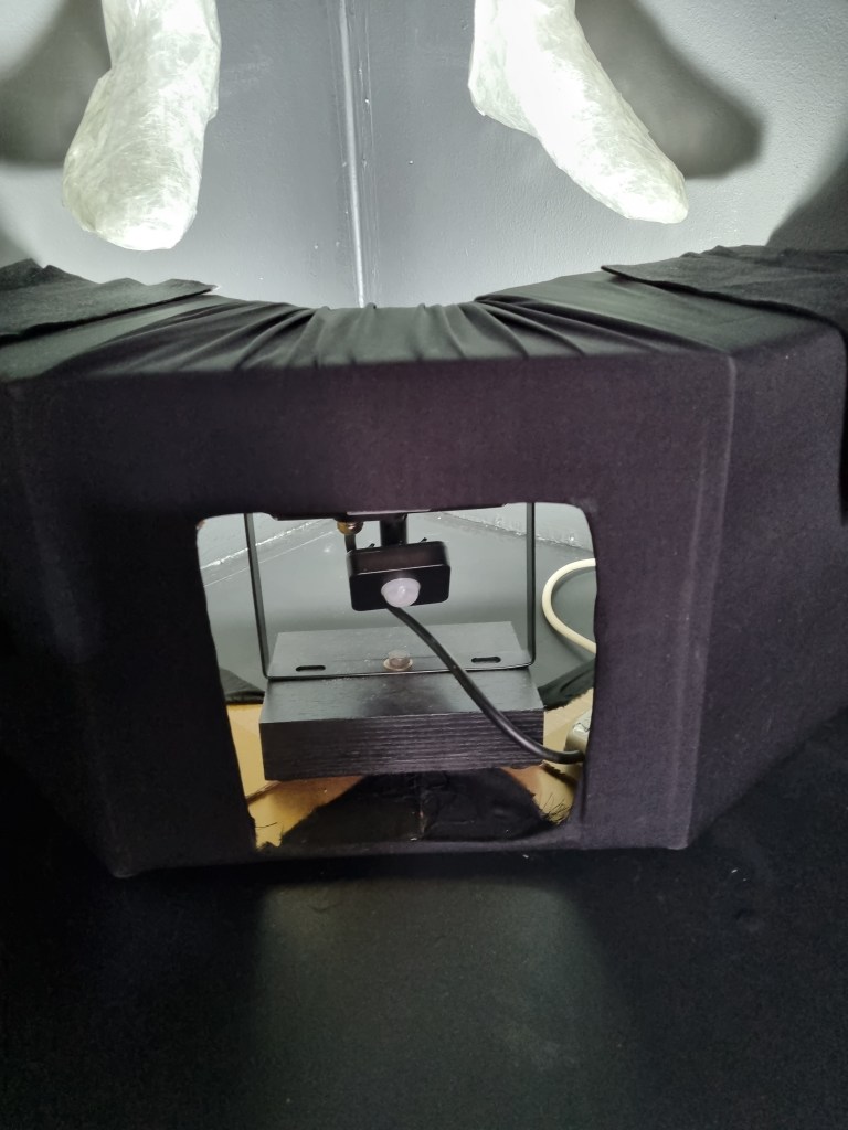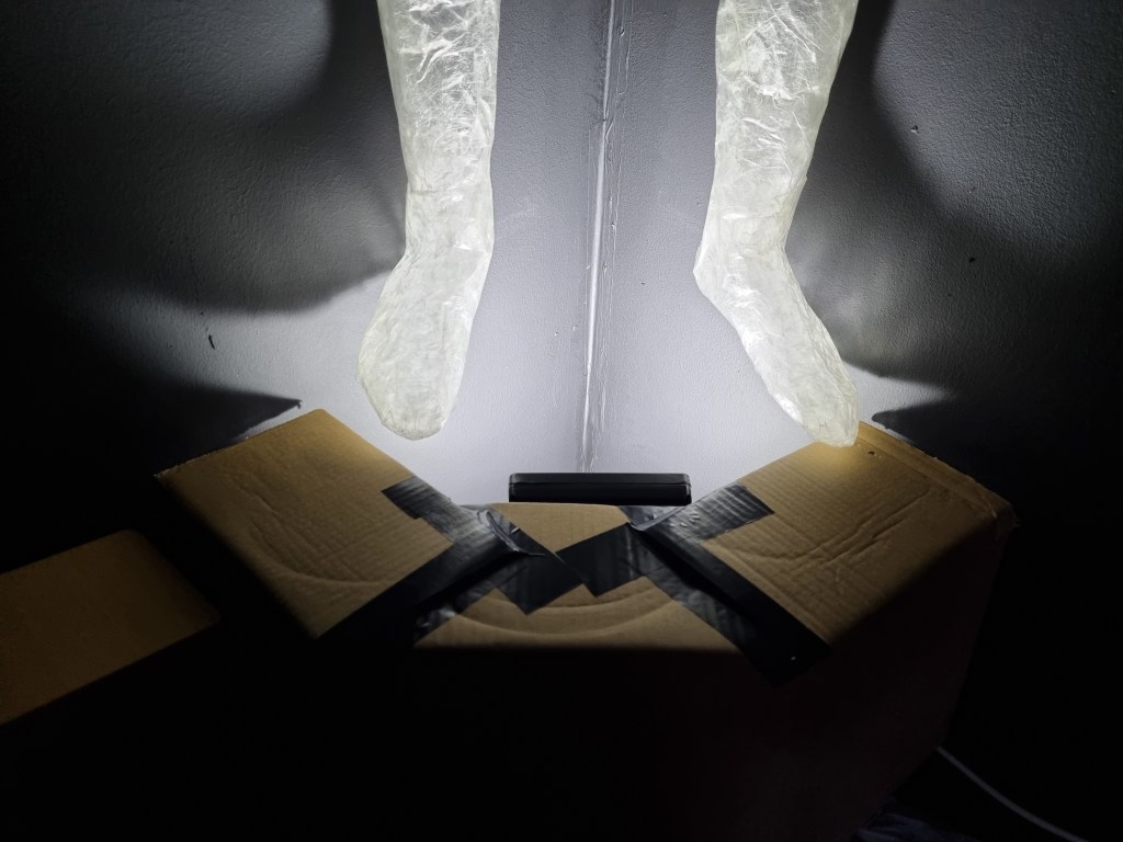 I made a shade for the light from a cardboard box I found in the venue. Instead of painting the box, I dressed it in black material to create a smooth finish. The bulb’s strength was not as bright as the light illuminating the two other sculptures. The light needed to focus on the figure. I tested the shade many times to refine the best result. In addition, the industrial light I used for the standing pose was with an ordinary 60W bulb. The spotlights had 6000K daylight strength, suitable for high visibility. The lights had other functions, such as a timer and puck-style tap, which I did not use. I chose these lights for the remote control option and the bright illumination.