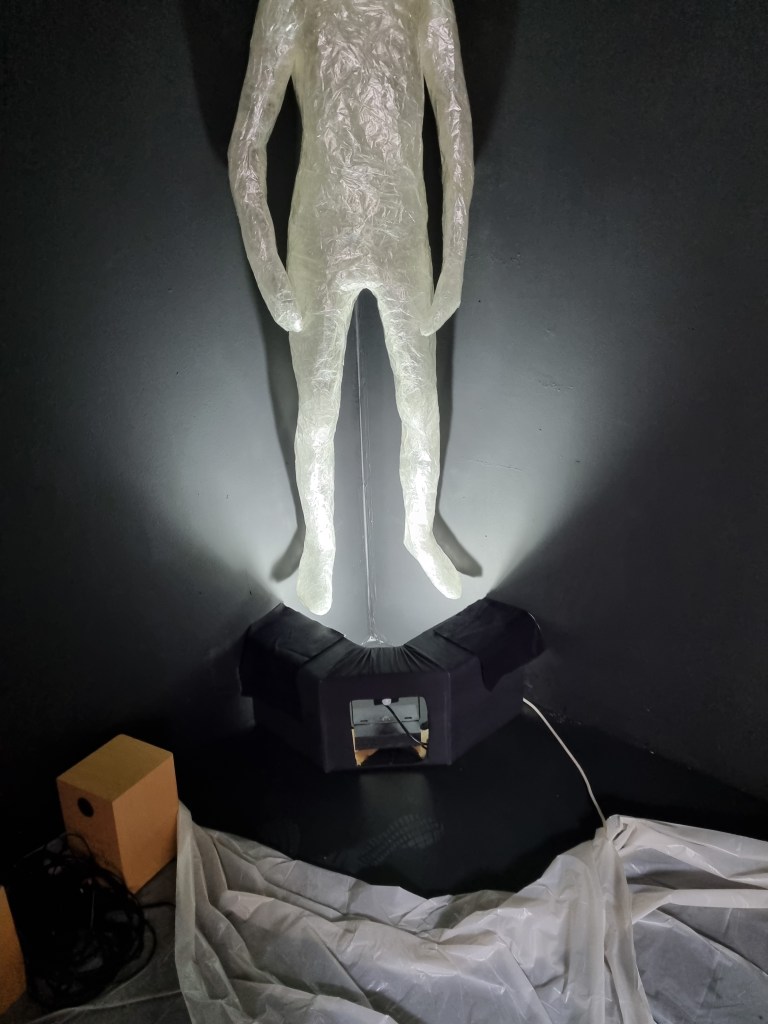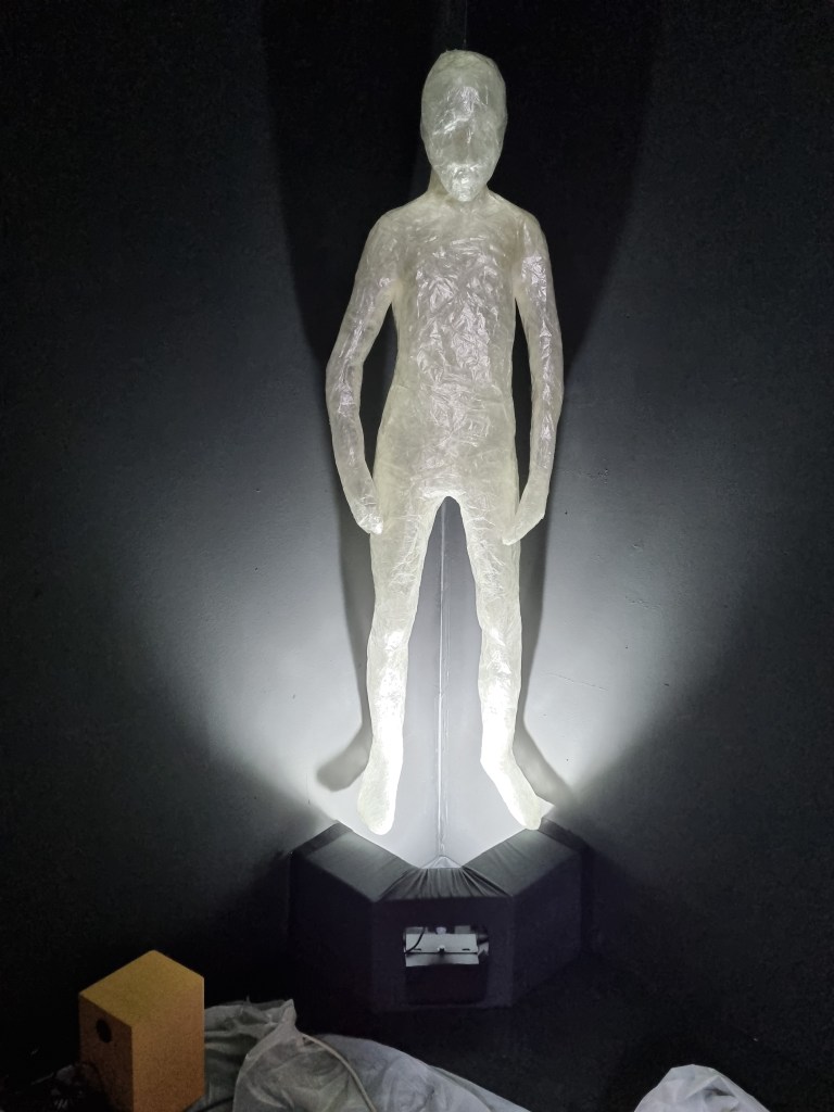The lights outside the standing pose shining from the bottom to the top gave the installation extra volume by reflecting shadow from the figure as it would be the darker part of the human being. The pose represents the dark part of a human being, inseparable from the body and mind. This element appeared while I was working on the installation in the venue, and it needed to evolve while placed in the space to evaluate the natural expression of the figure. The figure was moulded with visual and audio elements, giving a character of the human representation. With light and sound, the standing figure expresses human conditions, appearing in a profound presence of thoughts.