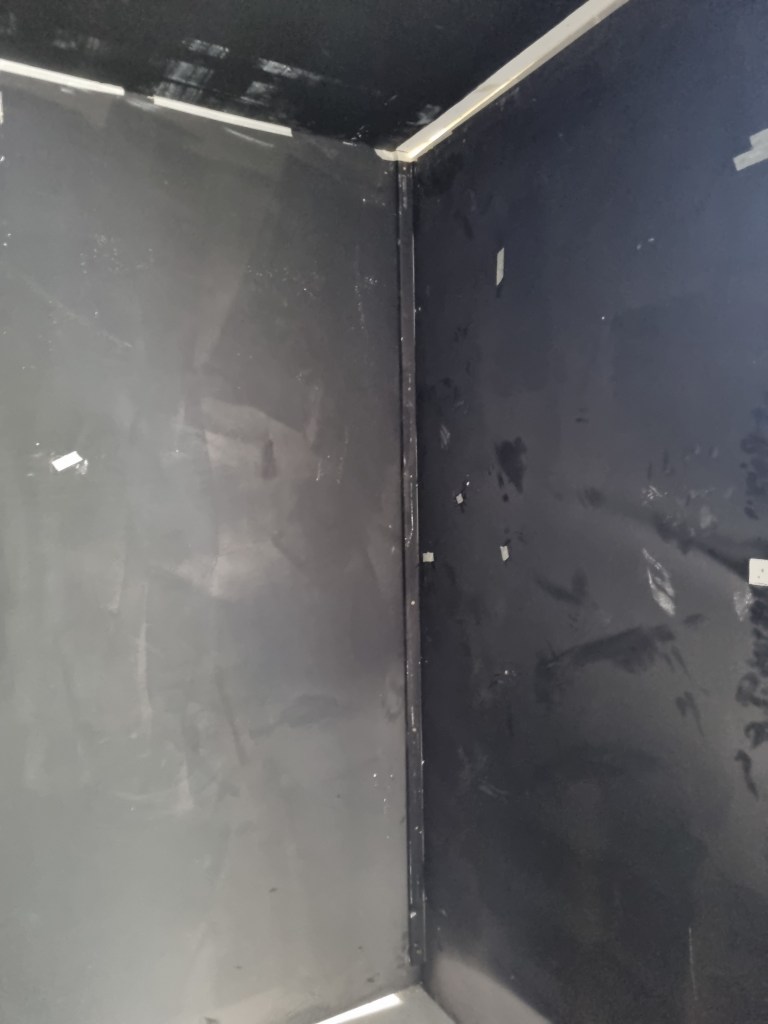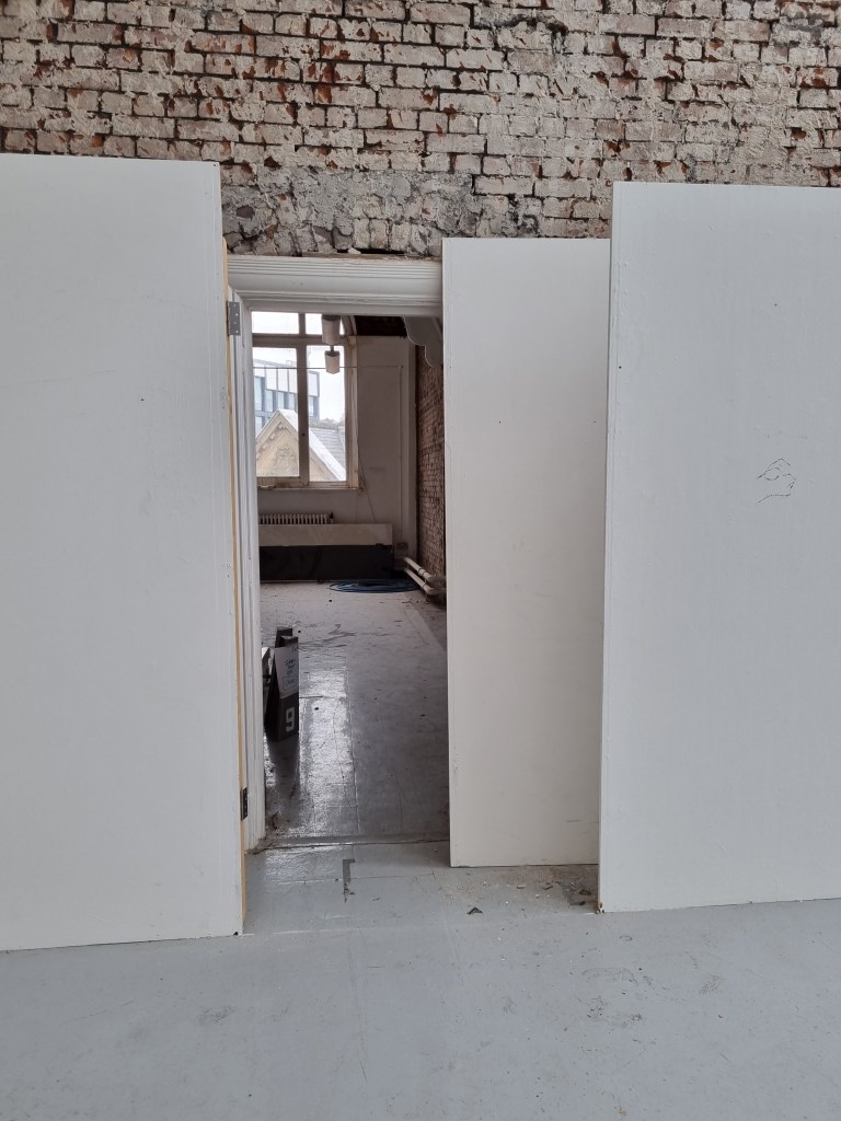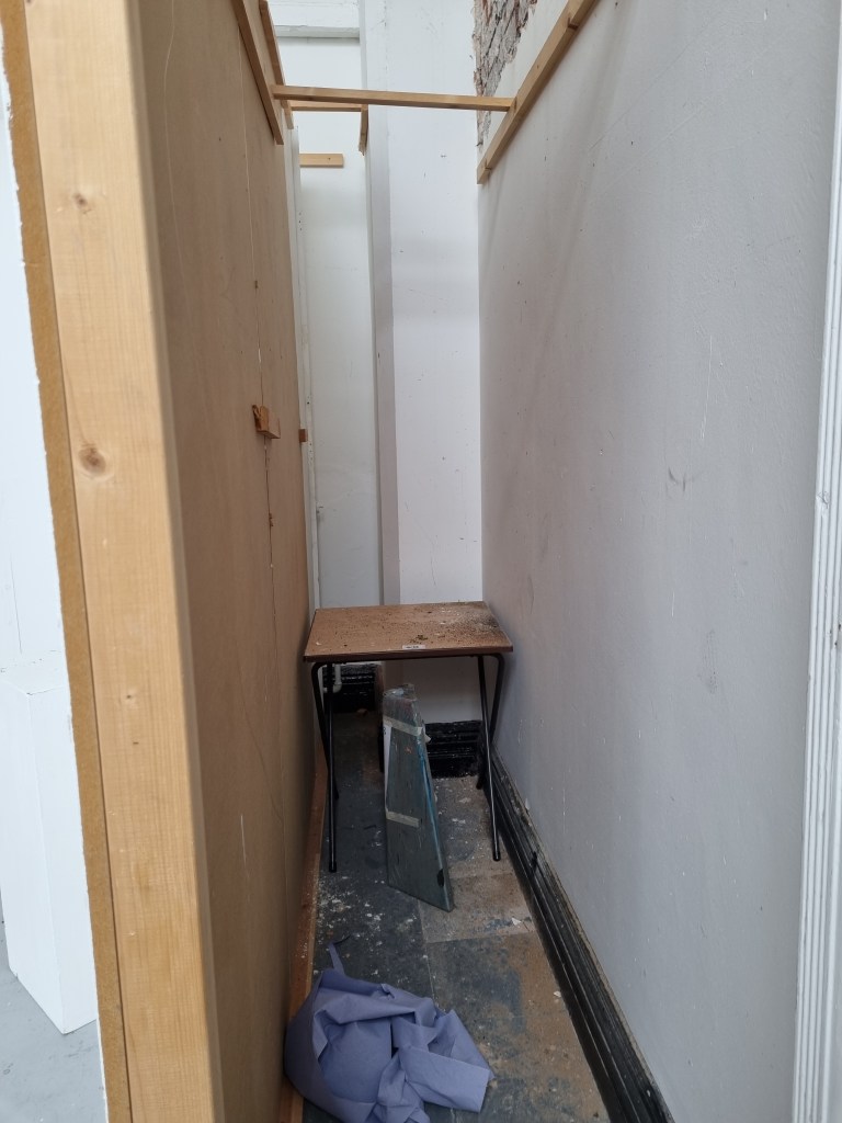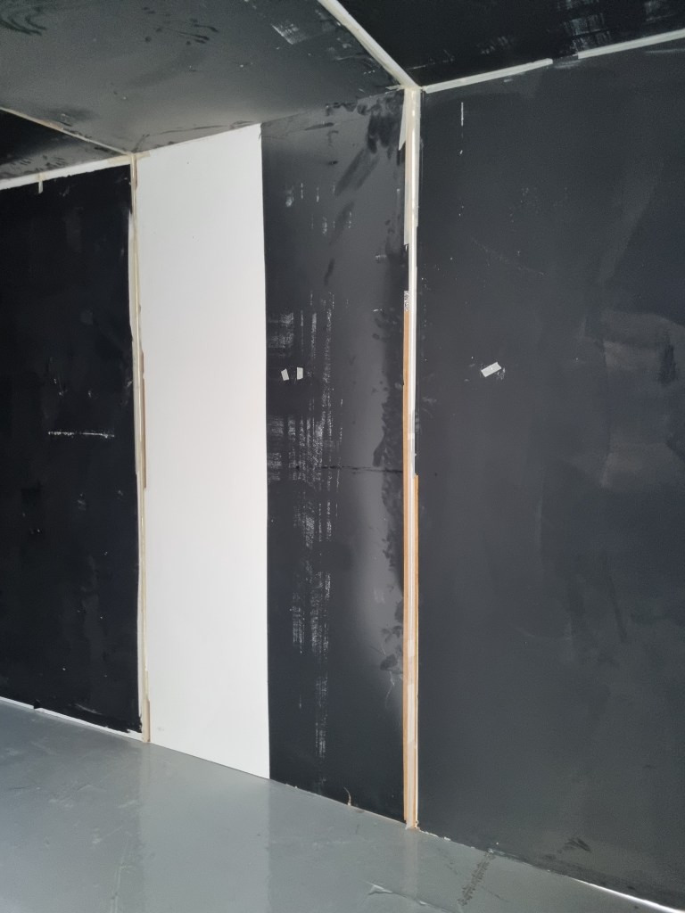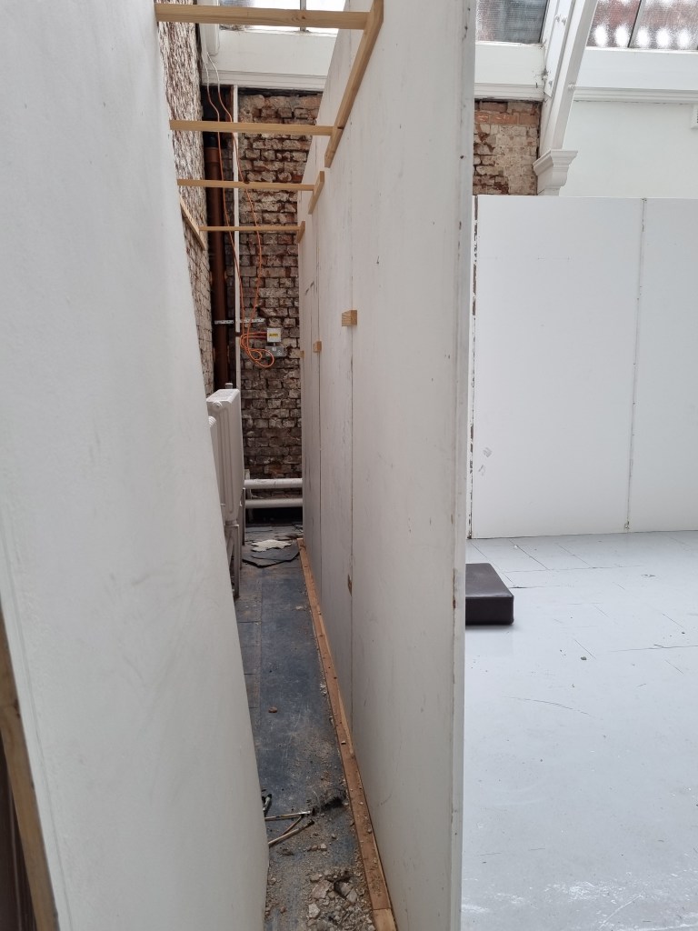We selected the space for the installation that needs to be made out of plasterboards. The walls must be painted dark, once firmly attached to the construction. The plasterboards must be dark for several reasons. I spoke to Steve about the colour of the walls, and we both talked about black. However, I think black is a harsh colour. Initially, I wanted to use a material. I need to discuss this element further, considering a material could absorb more noise from the outside.