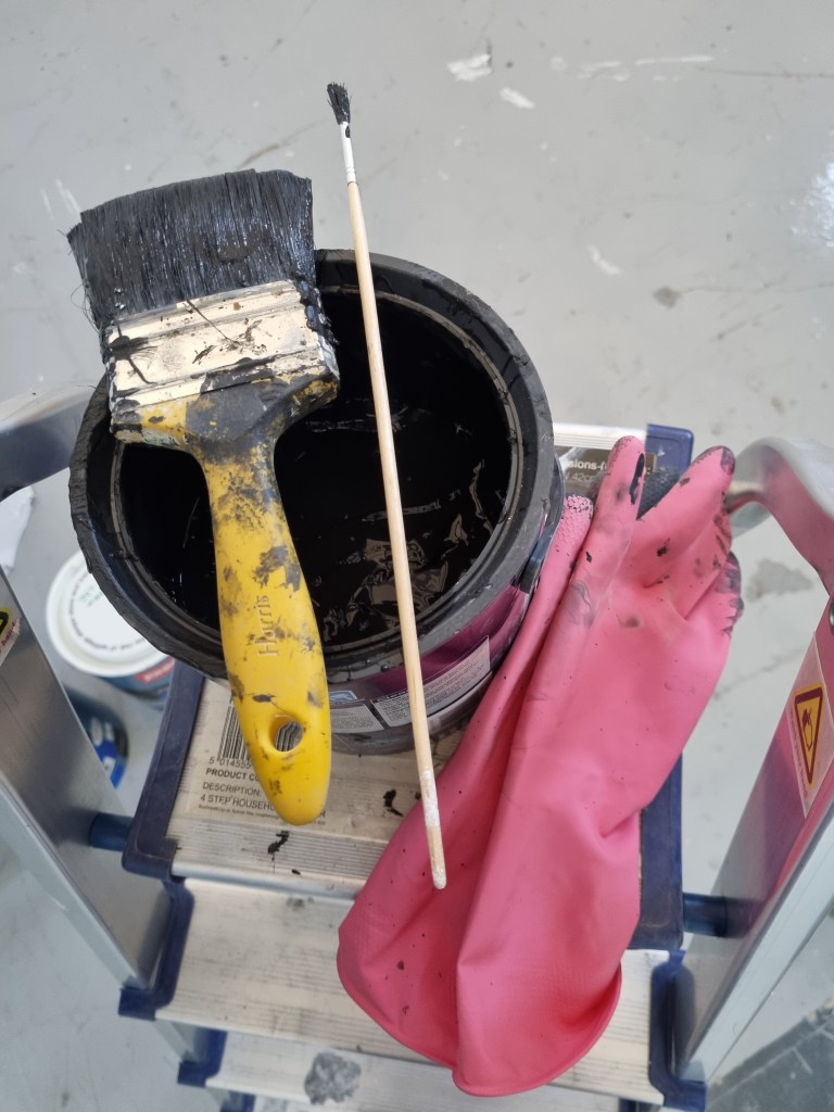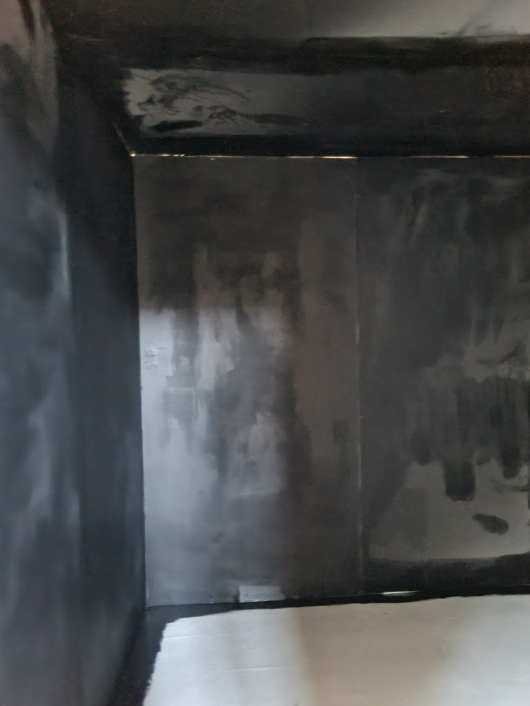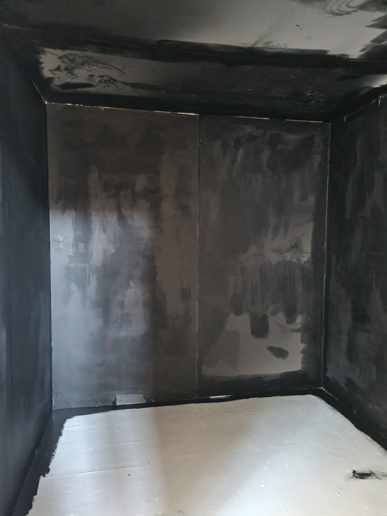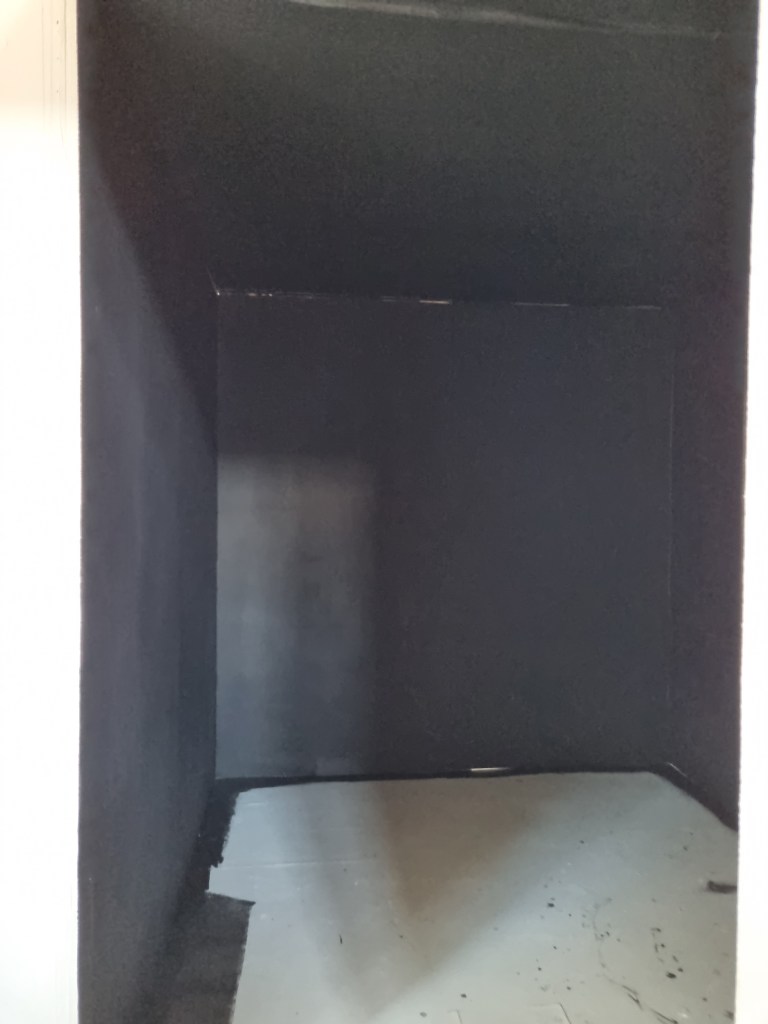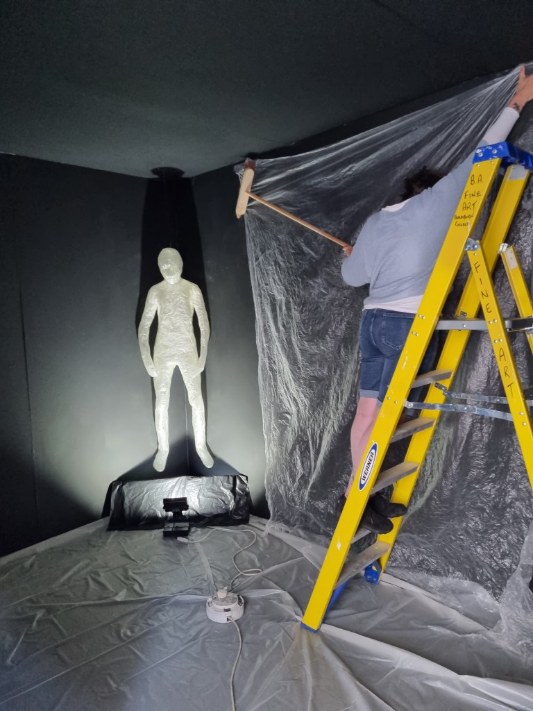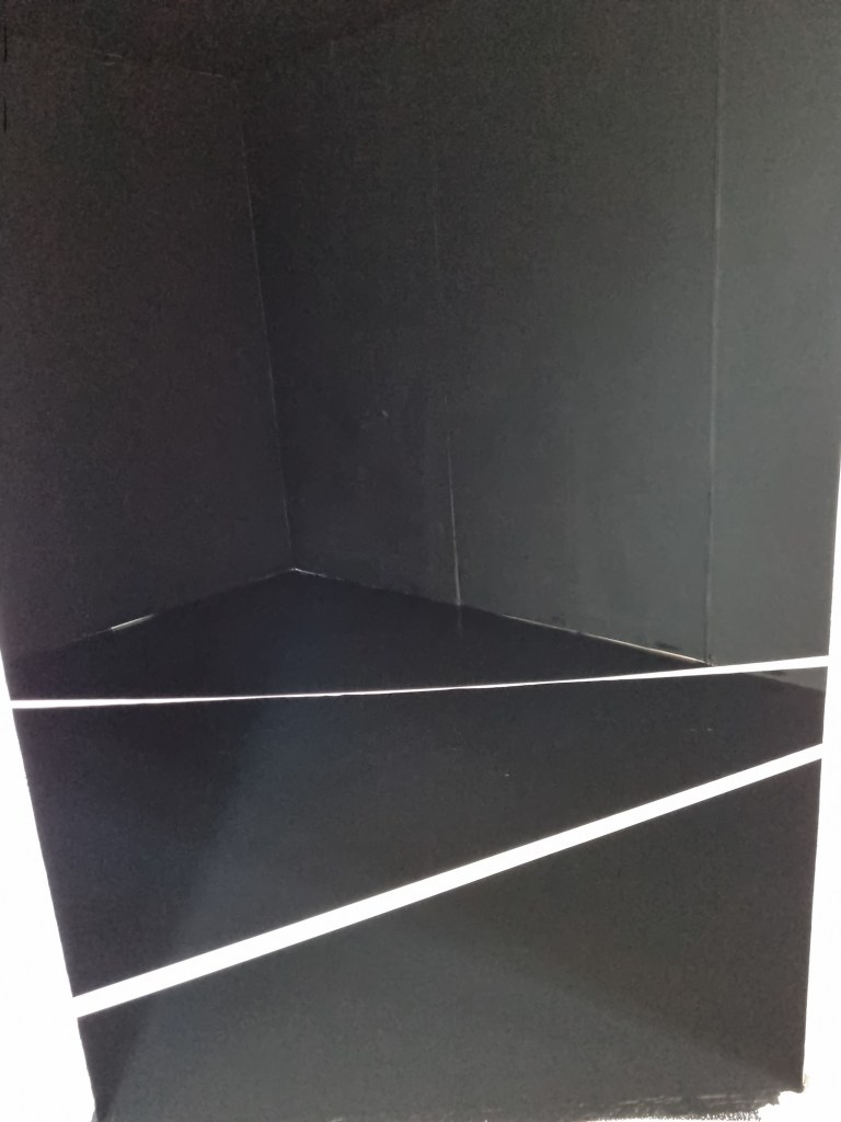 I painted the corners black and white marks, then the walls and then the floor. I thought the black colour was too dark even if there would be illumination from the sculptures. So I spoke to my friend, who suggested repainting the walls with grey paint.