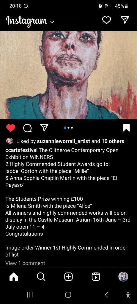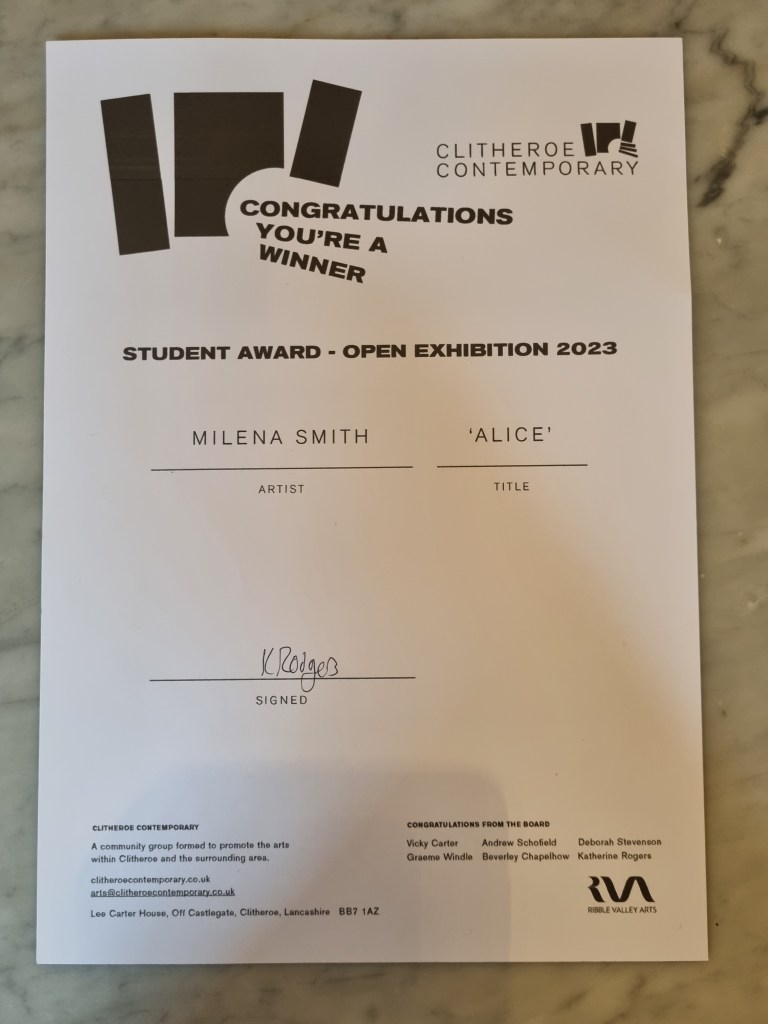 My goal after the degree is to continue making and selling my work. I entered for an open exhibition in Clitheroe, which is in June. I submitted two pieces, and one of my paintings was accepted. The portrait “Alice” I presented for the Open Clitheroe won the first Prize of £100 and is now displayed in the Castle Museum Atrium from 16th June – 3rd July.
